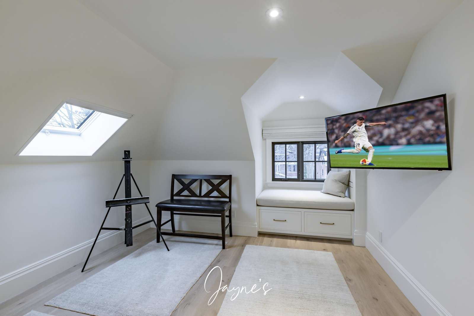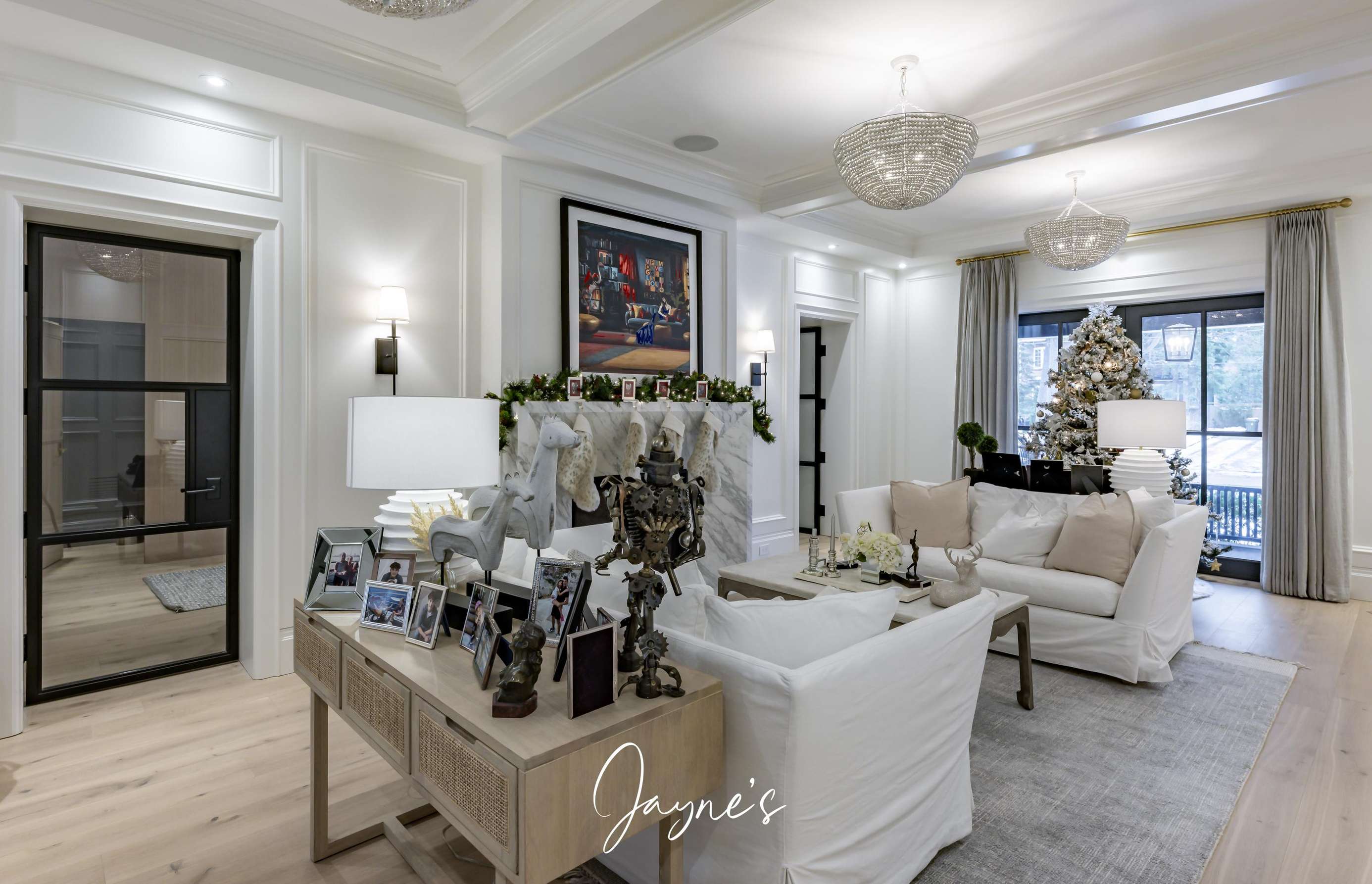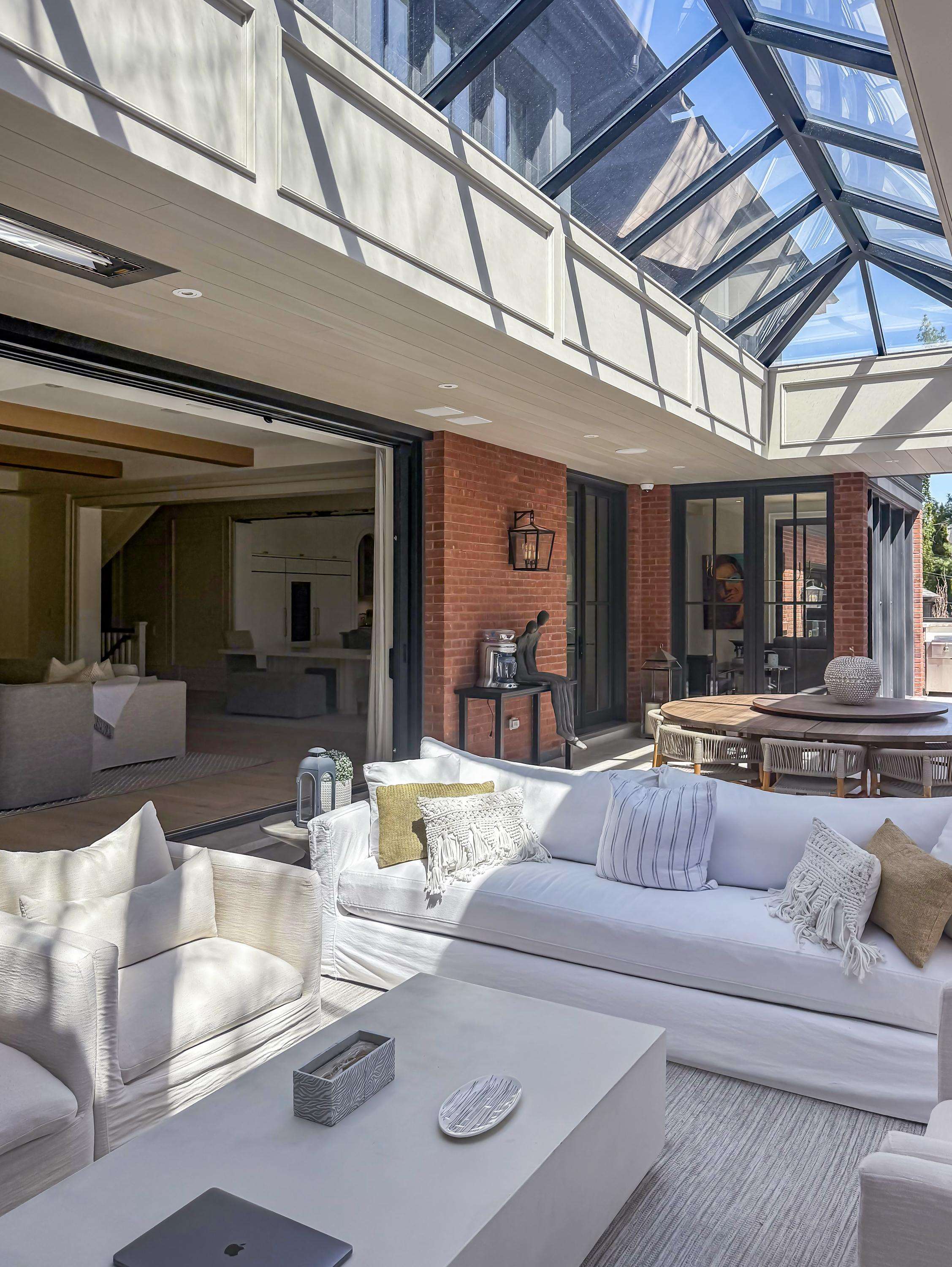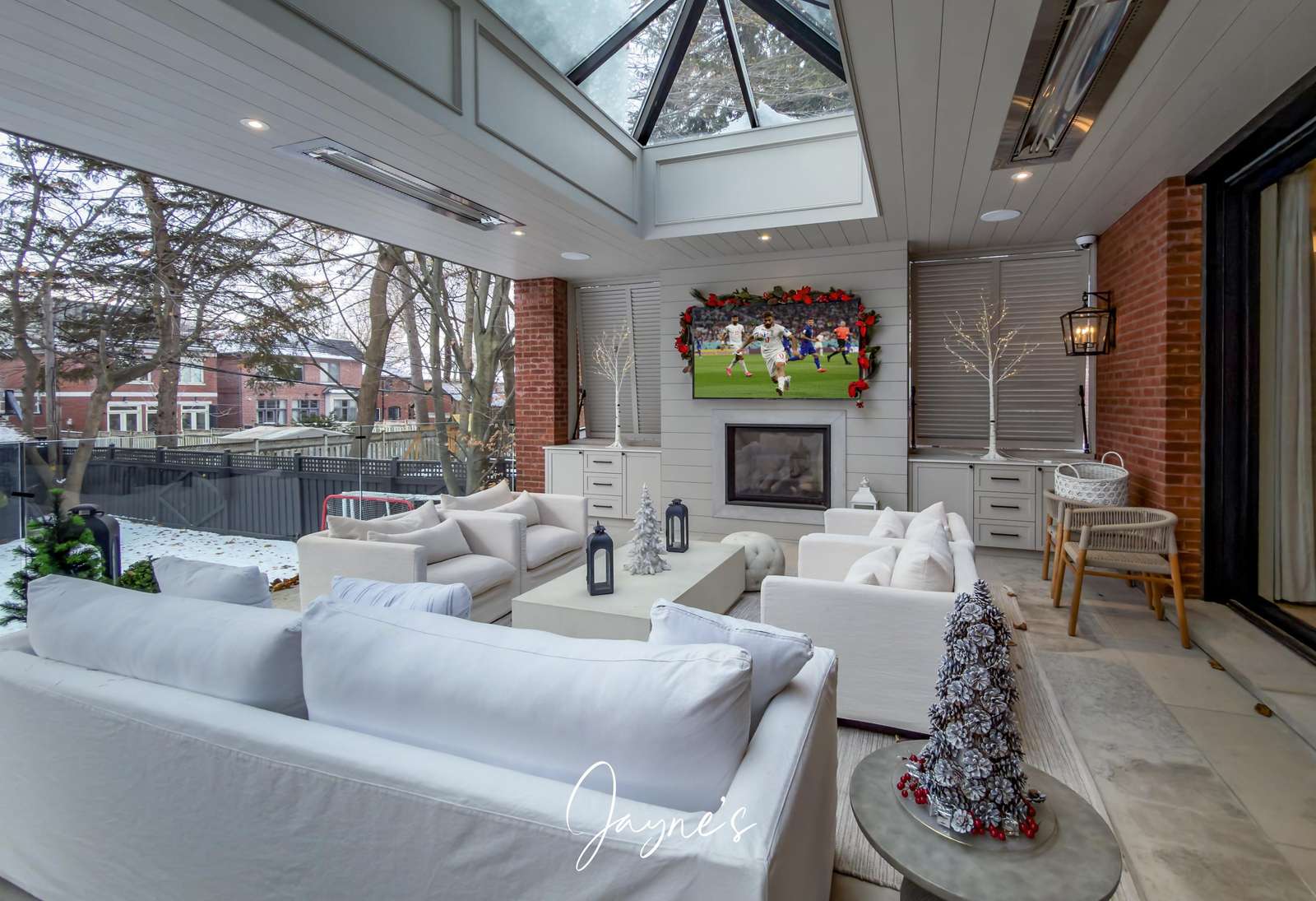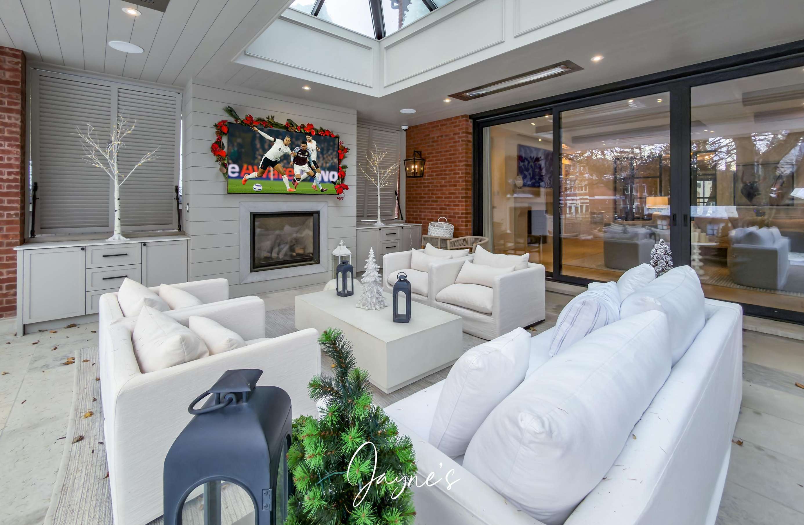 Features a gas fireplace and TV adorned by two built-ins on each side. Surrounded by plush seating, including two armchairs and an oversized sectional sofa. Accordion glass doors span the length of this room, and in the summer open up completely for a seamless transition between the Great Room and covered patio.
