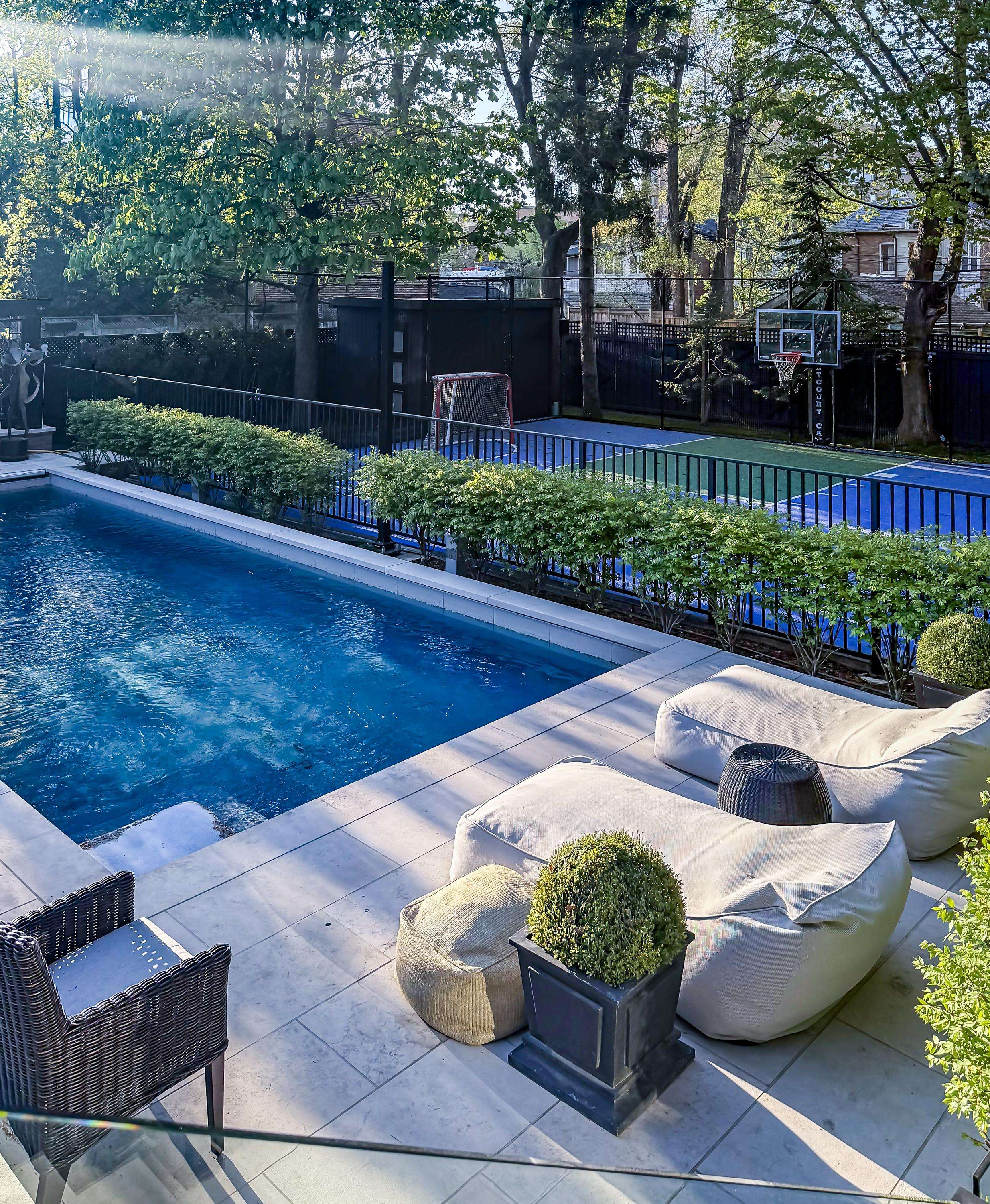 A few steps down will bring you to the in-ground pool where you can bask in the sun during the heat of the day! Further down the yard, a Sports Court offers a basketball net and other games for the kids to enjoy. A backyard so equipped, you will find the sun setting before you even realize! Simply flick on the pool lights to continue swimming in the dark!