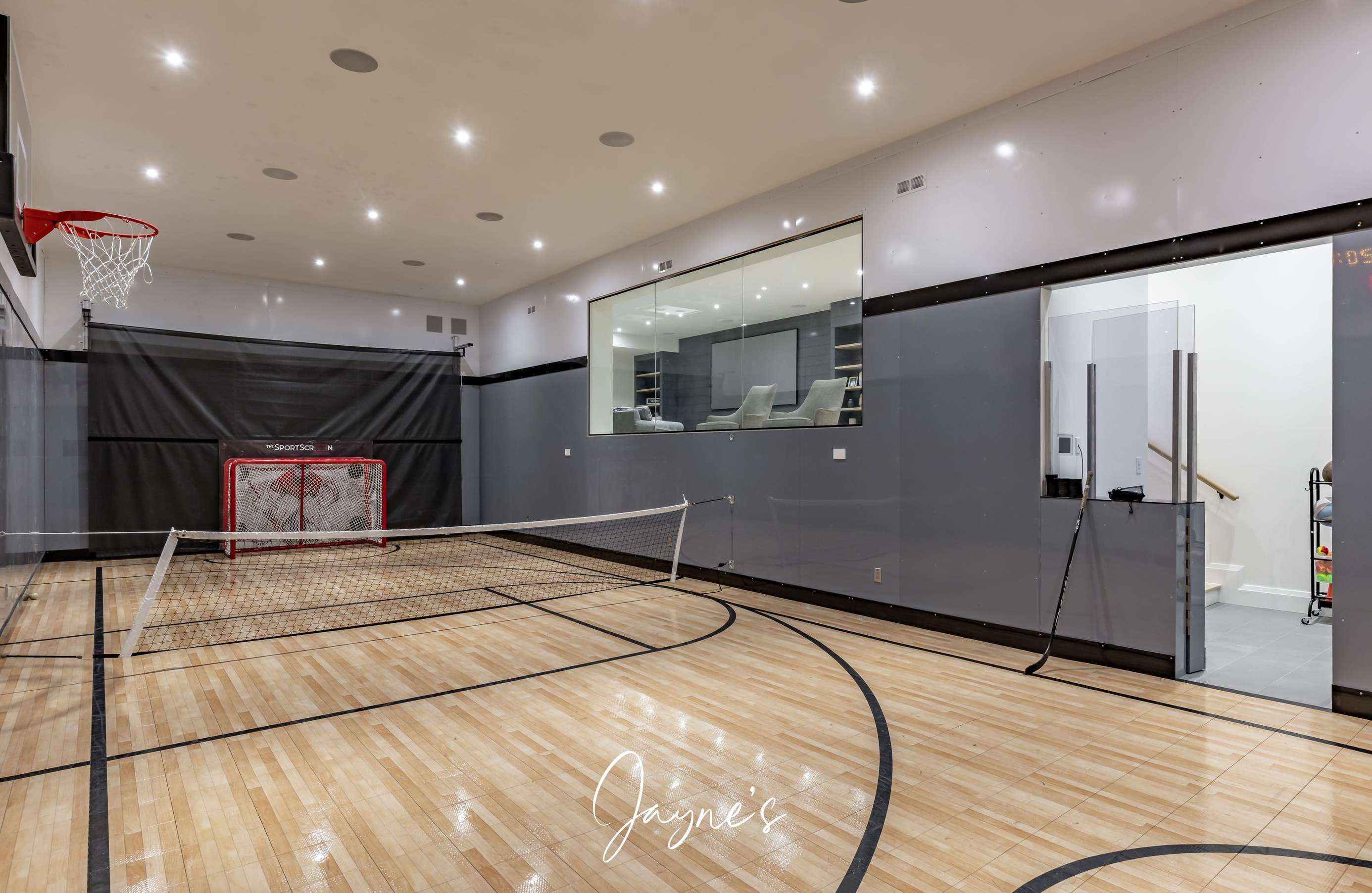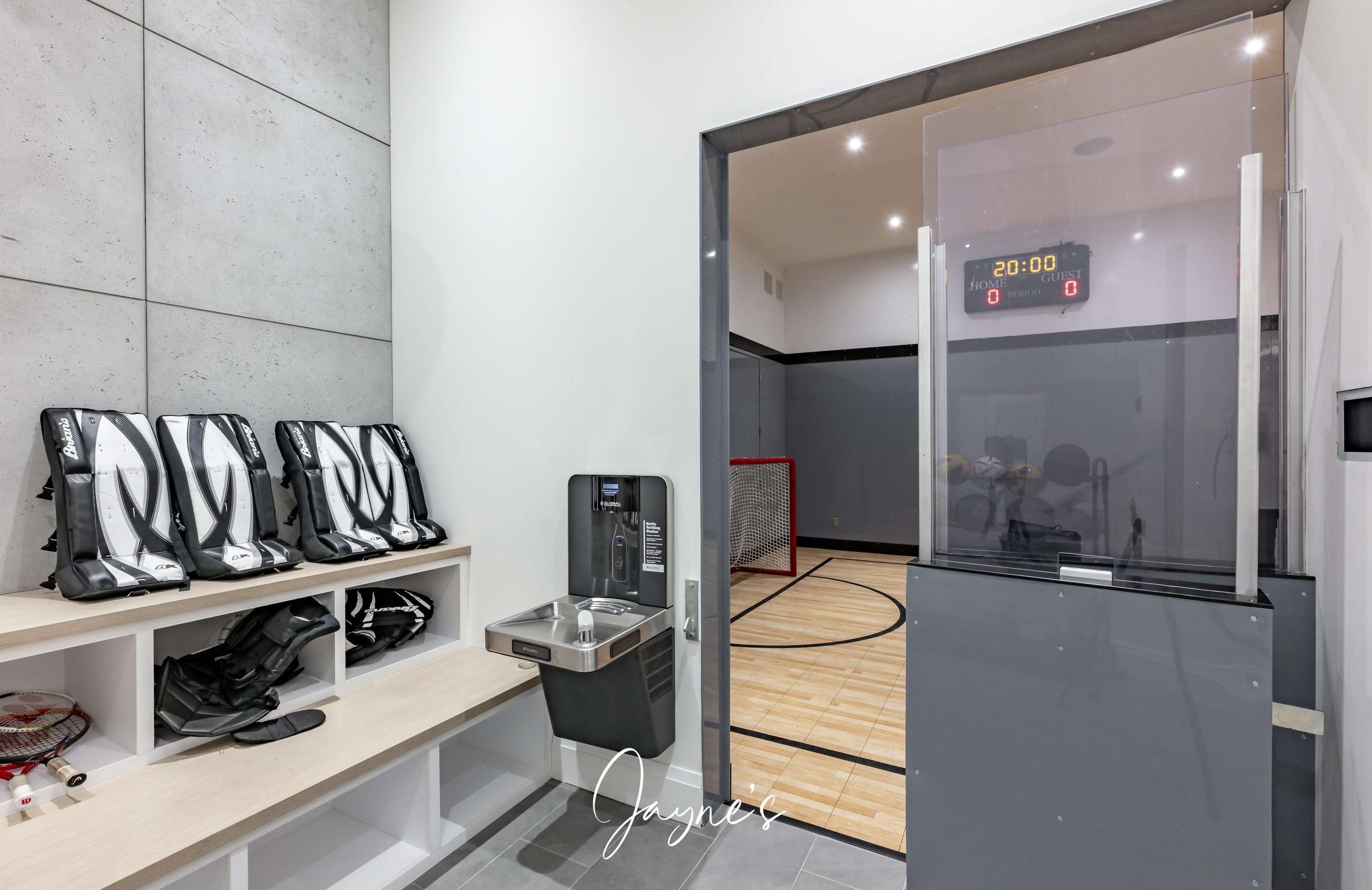 This magnificent, versatile room includes a basketball net, 2 hockey nets, and a pickleball court. At the entrance, a changing room with equipment and a water fountain can be found.