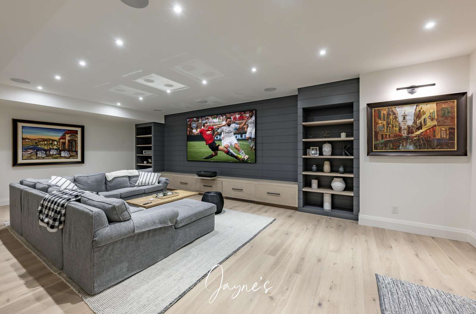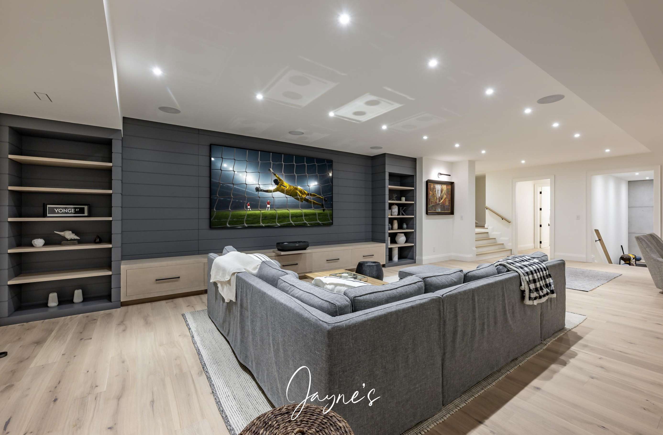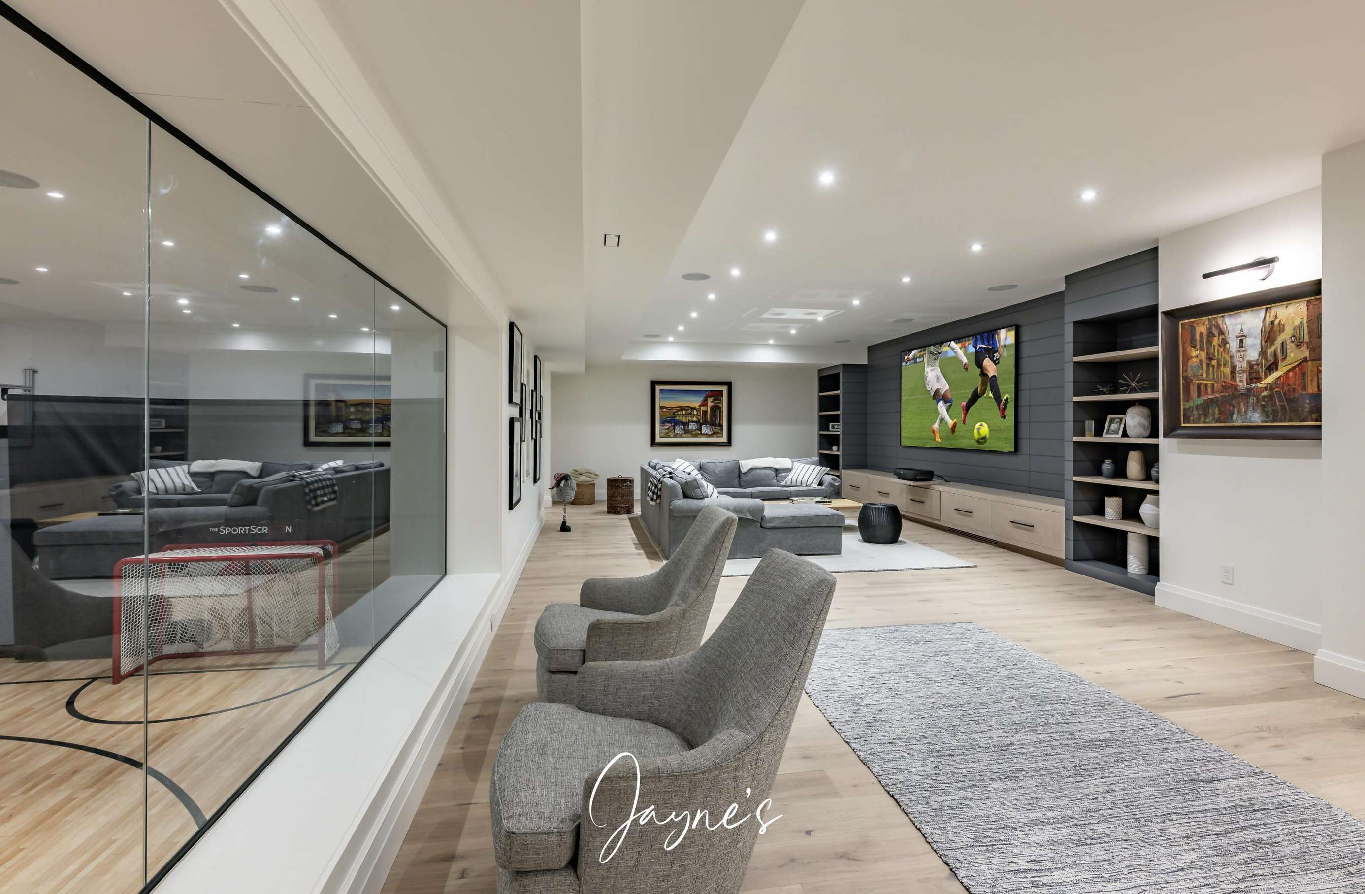 Features an L-shaped sofa across from a 140-inch theatre in the family room with 24 subwoofers. Playstation. Two chairs by large viewing windows overlook the sports court.