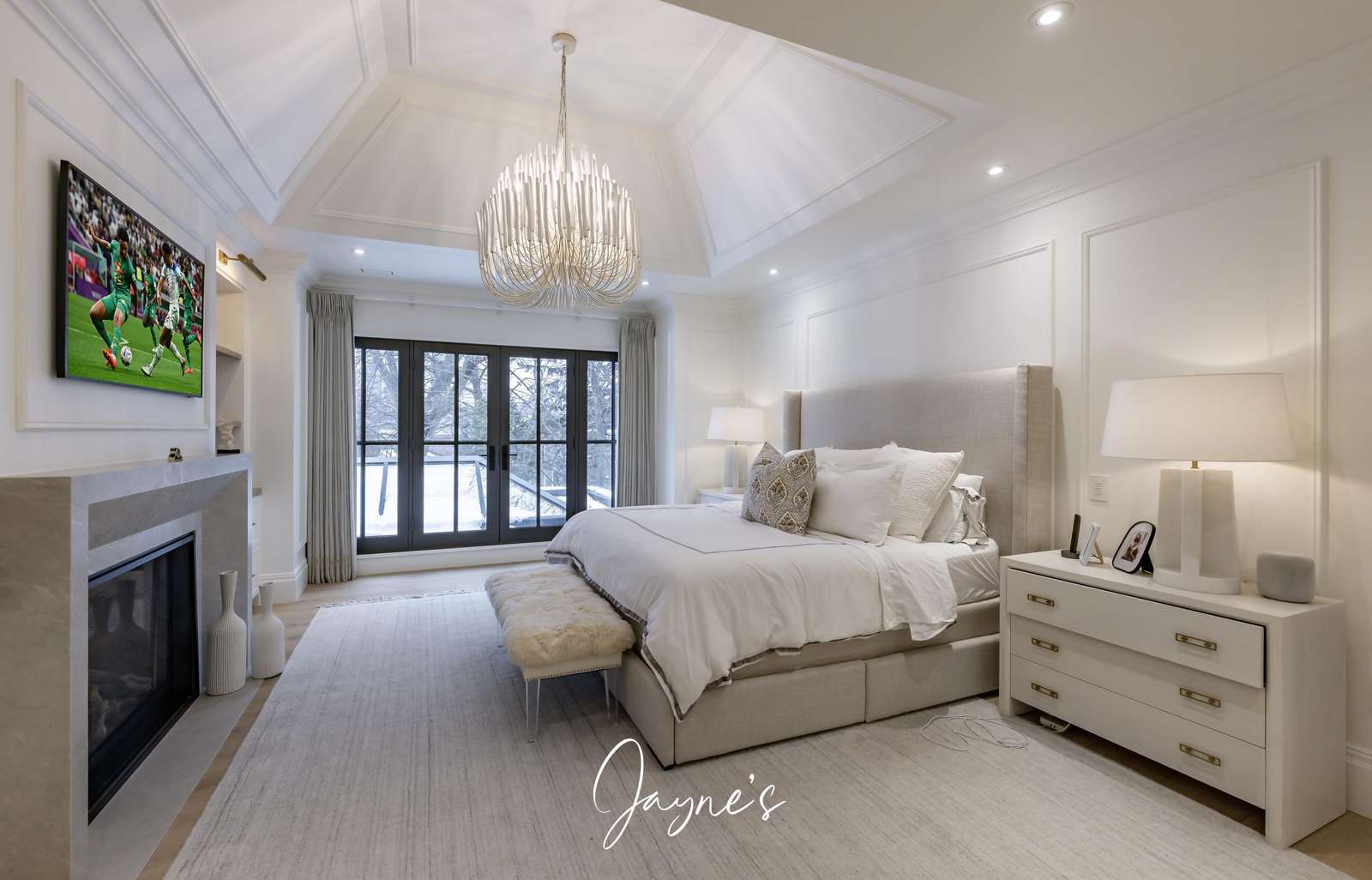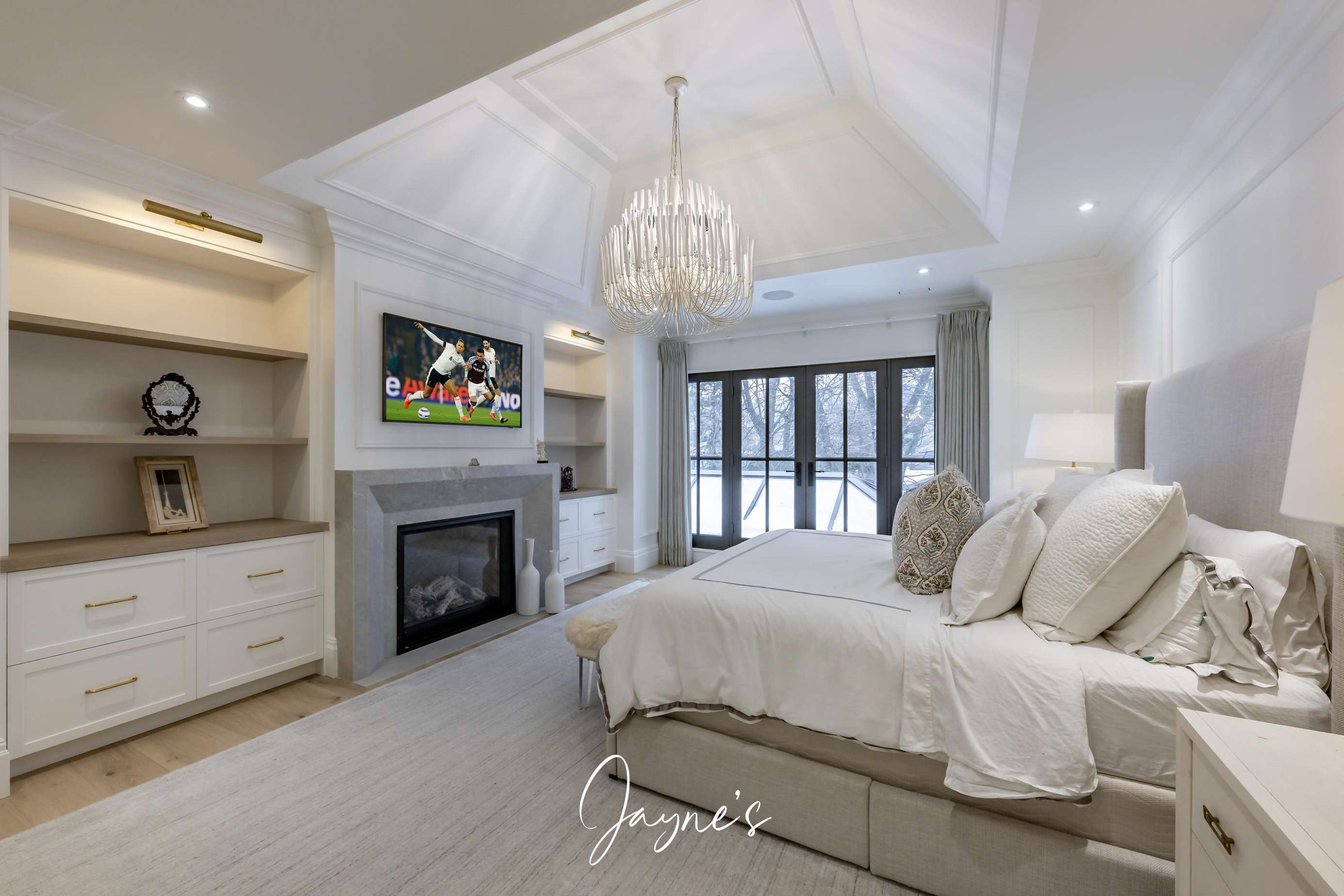 Bedroom 1 - King (Primary) with ensuite, TV, marble gas fireplace and dressing room with two vanities
