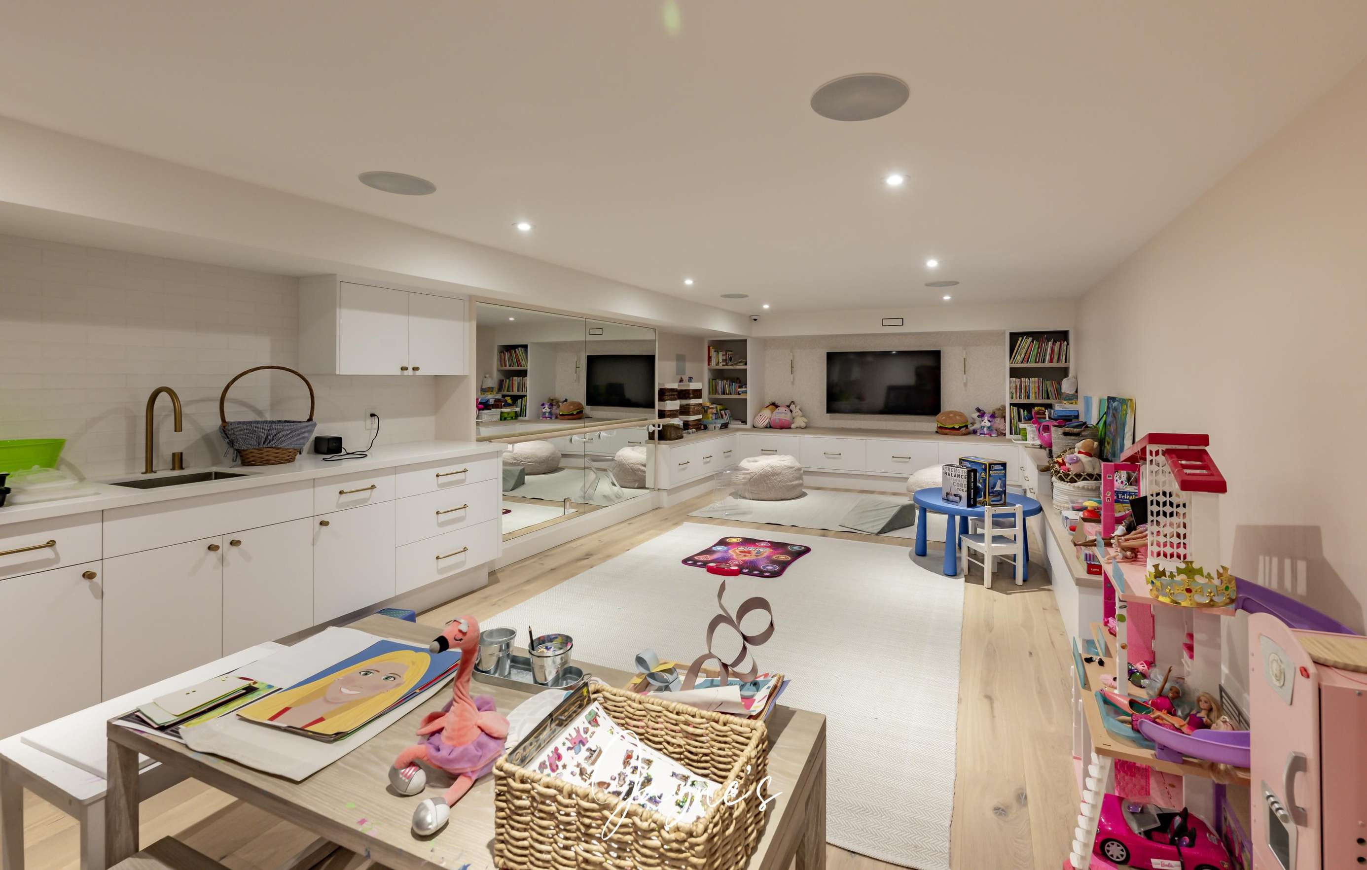 A private child's space equipped with a sink area, TV, and an abundance of toys!