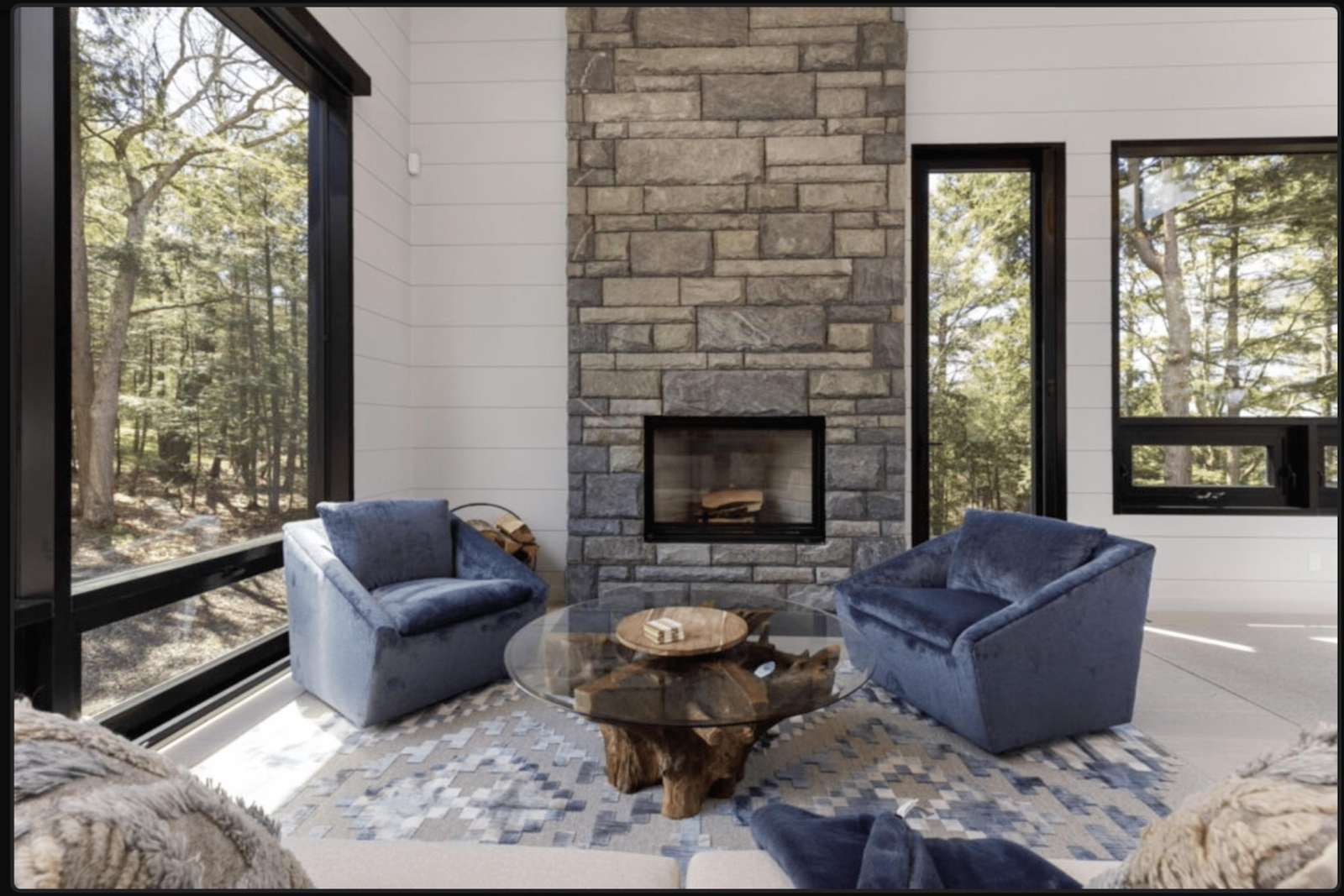 Magnificent open concept light filled room featuring a towering floor to ceiling Muskoka stone wood burning fireplace and cozy seating area to enjoy a roaring fire.