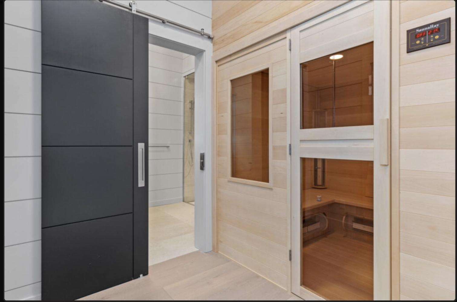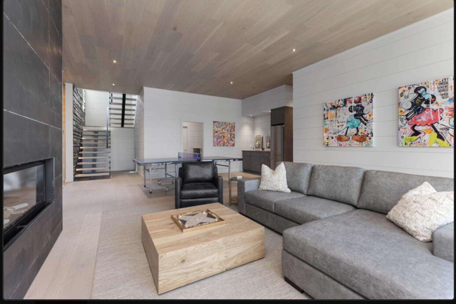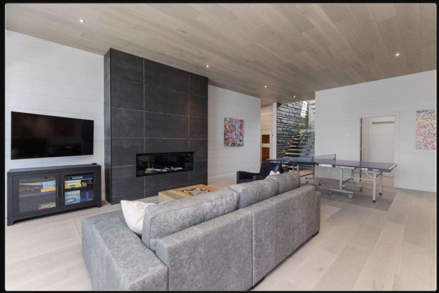 The lower level living area has a full size ping pong table, kitchenette, infrared sauna and floor to ceiling modern gas fireplace. Copy up around the fire with another comfortable seating area, large coffee /board game table and wall mounted TV. Floor to ceiling french doors open to the lower decks.
