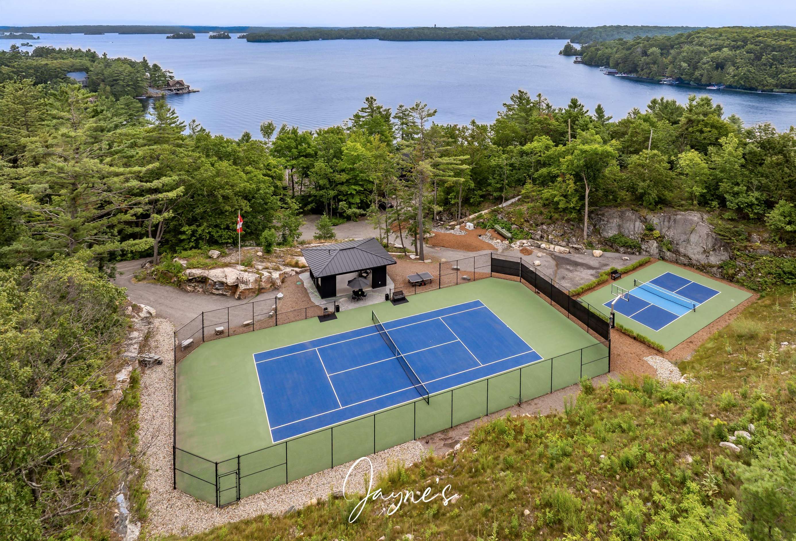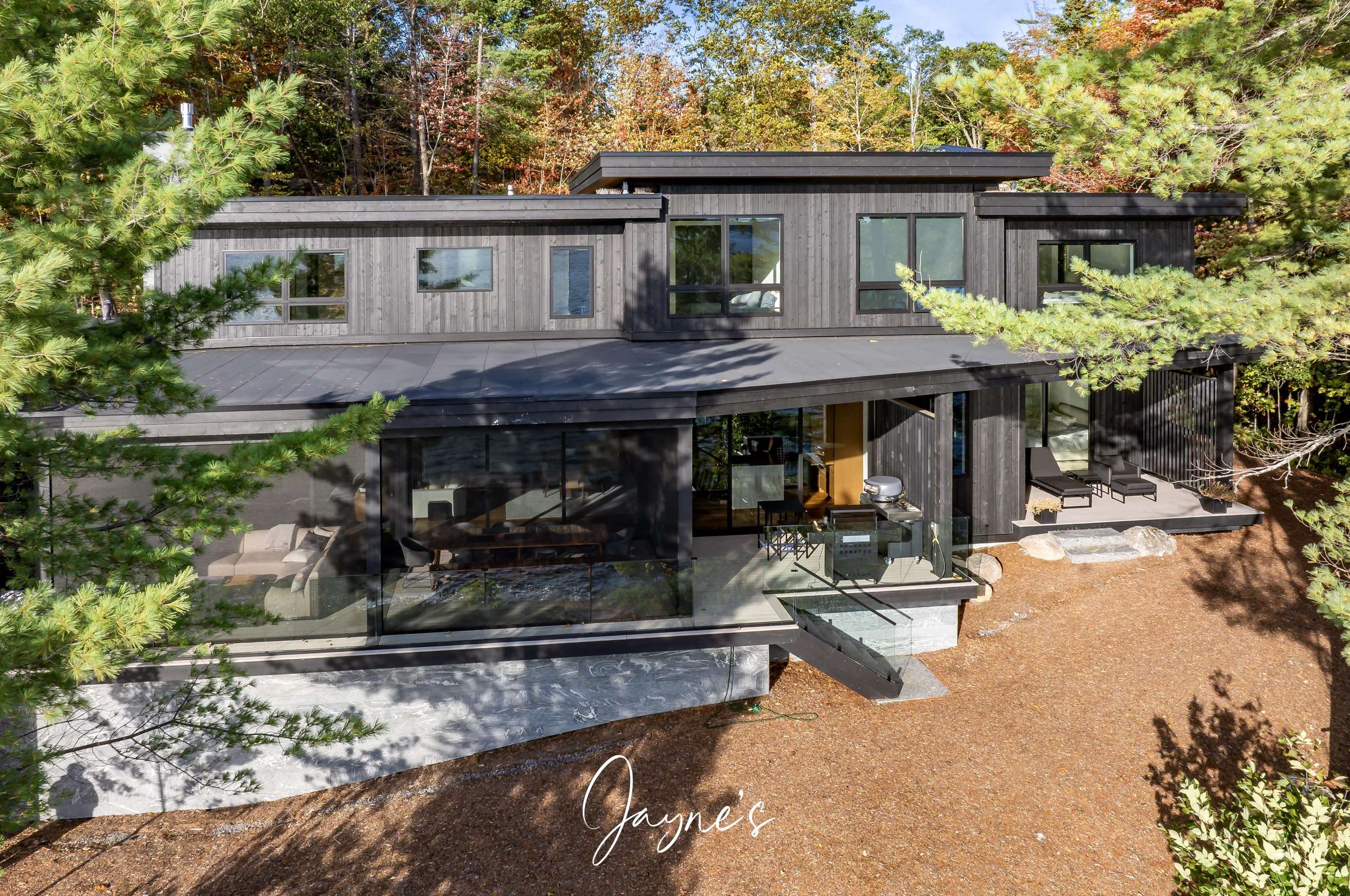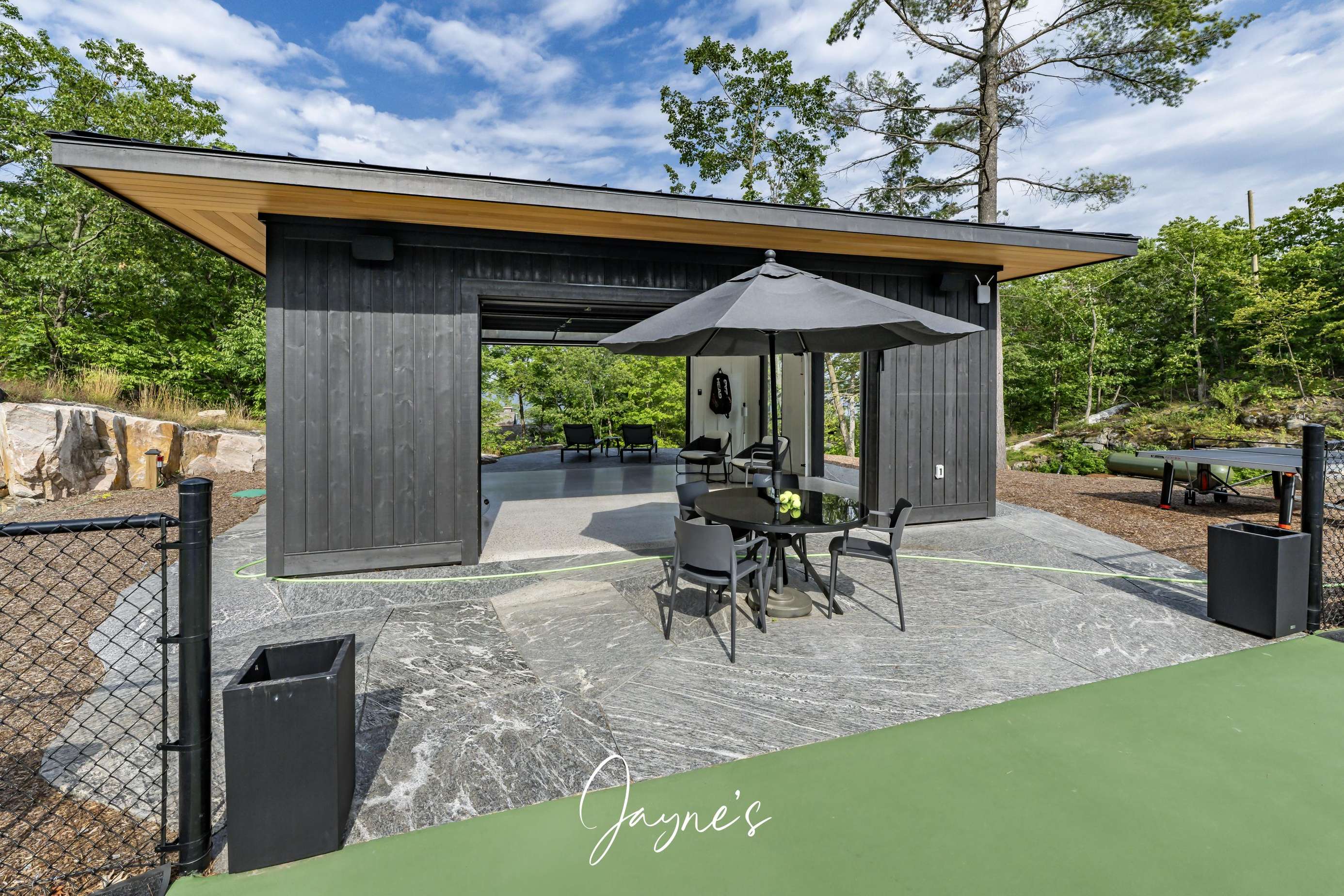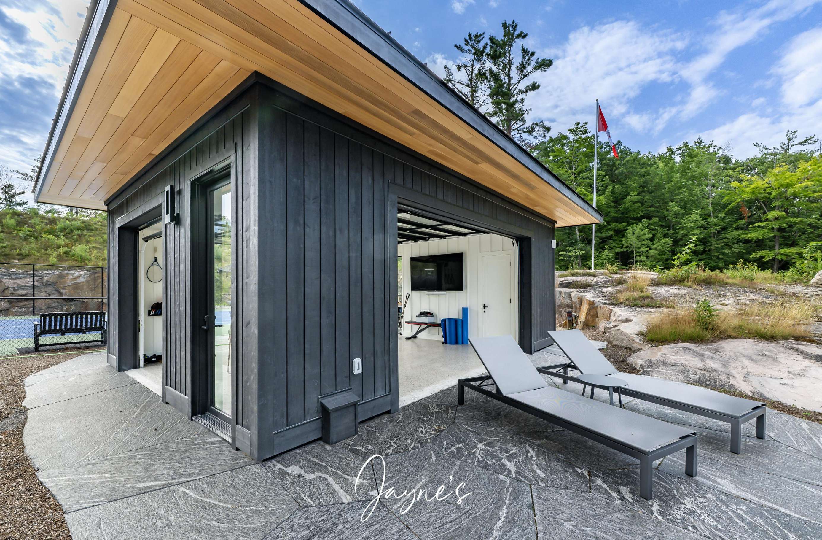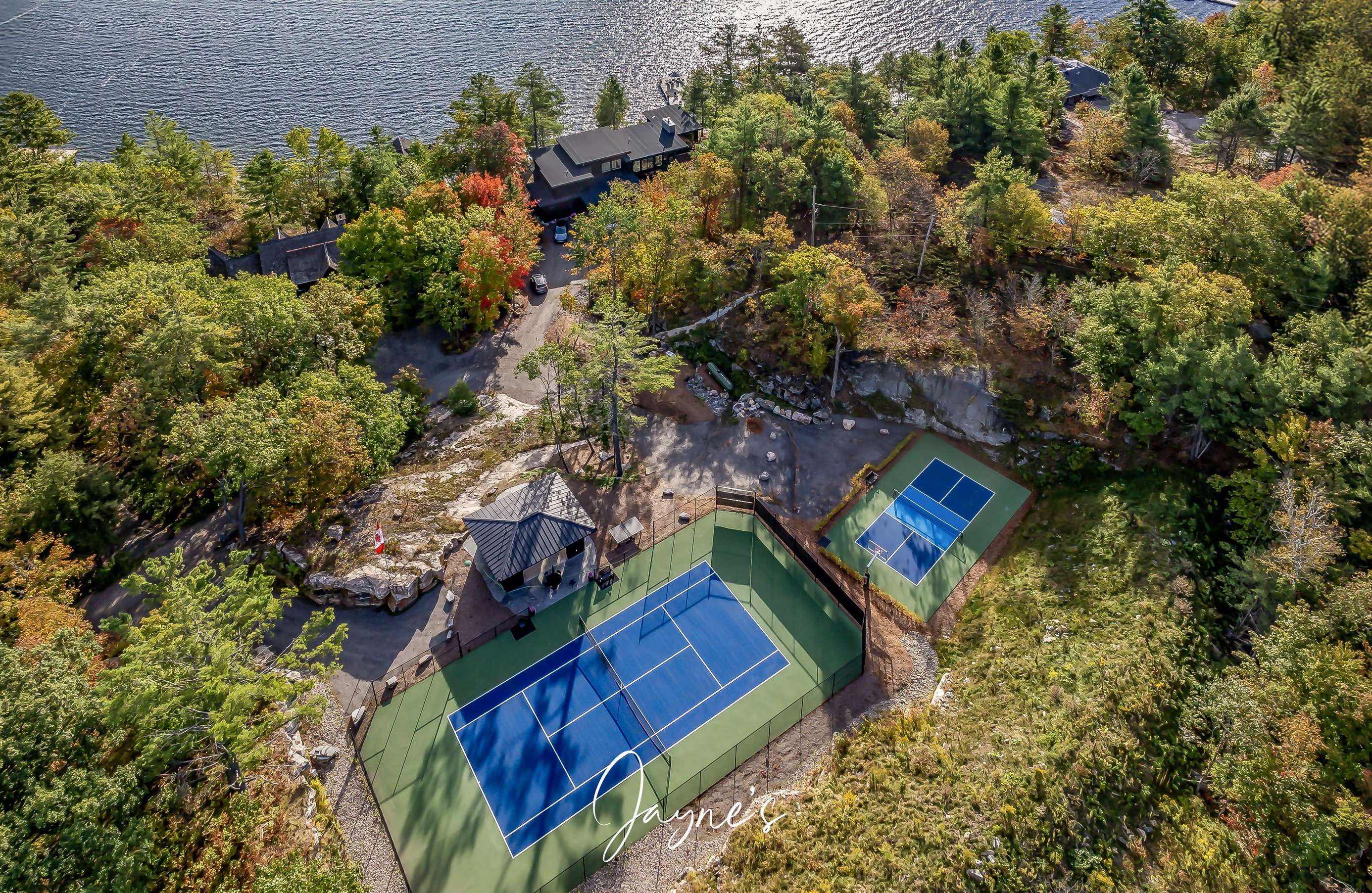 MODERN FUNHOUSE - A sweeping road framed by towering pine trees winds through the forest and brings you to the immaculate Modern Funhouse. Atop the property a Tennis Studio is complimented by a tennis court and a pickleball court with surrounded by beautiful Muskoka rock.