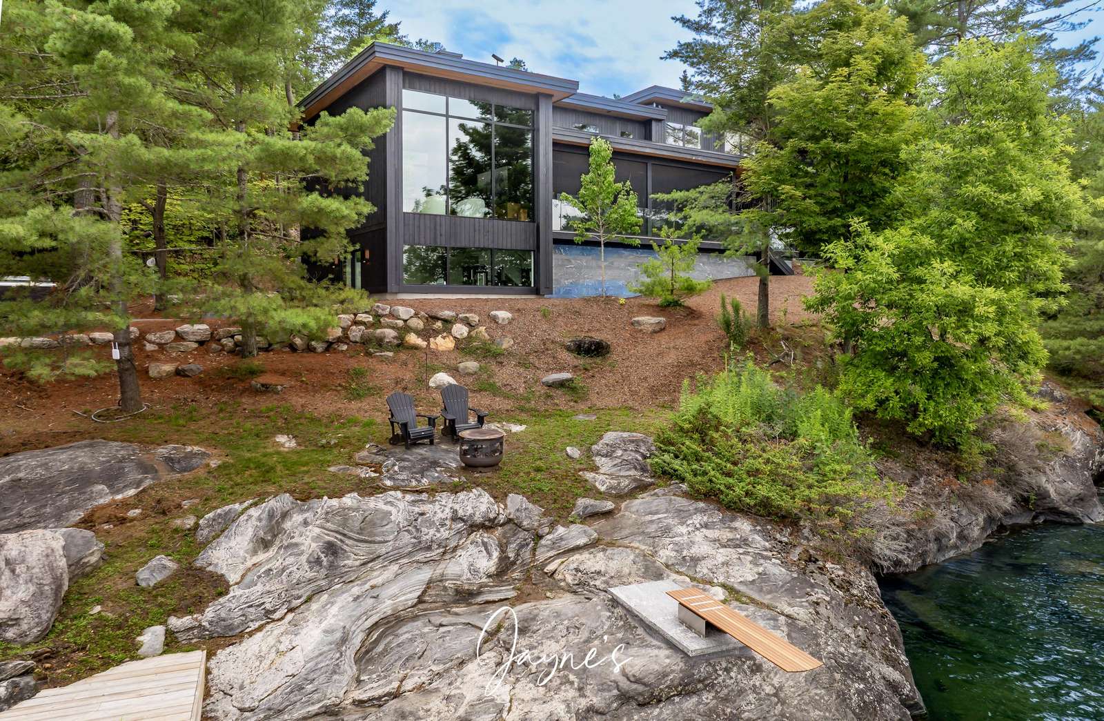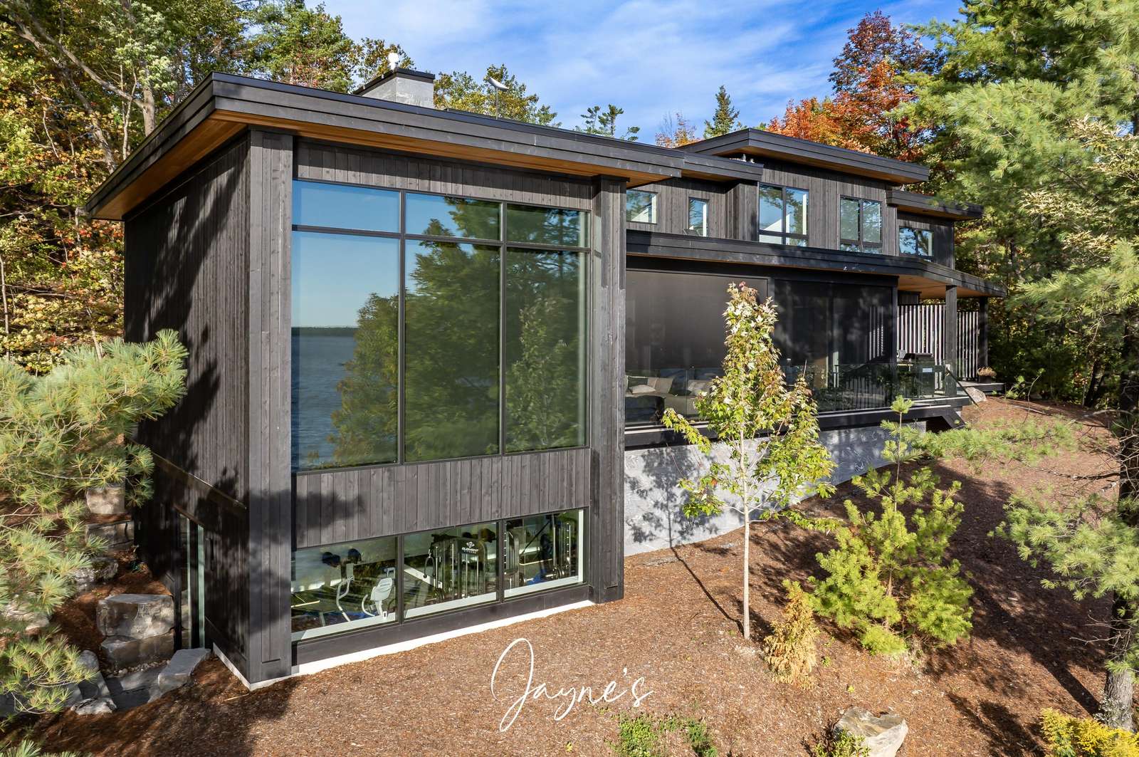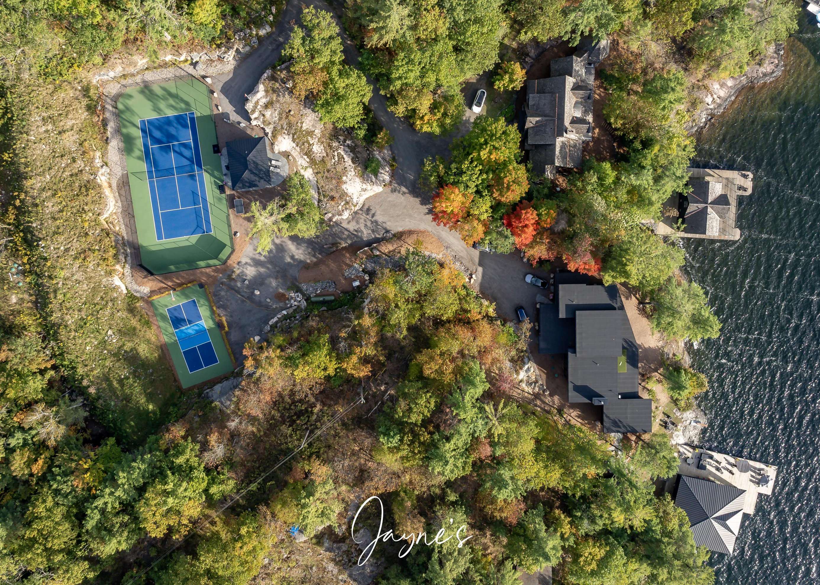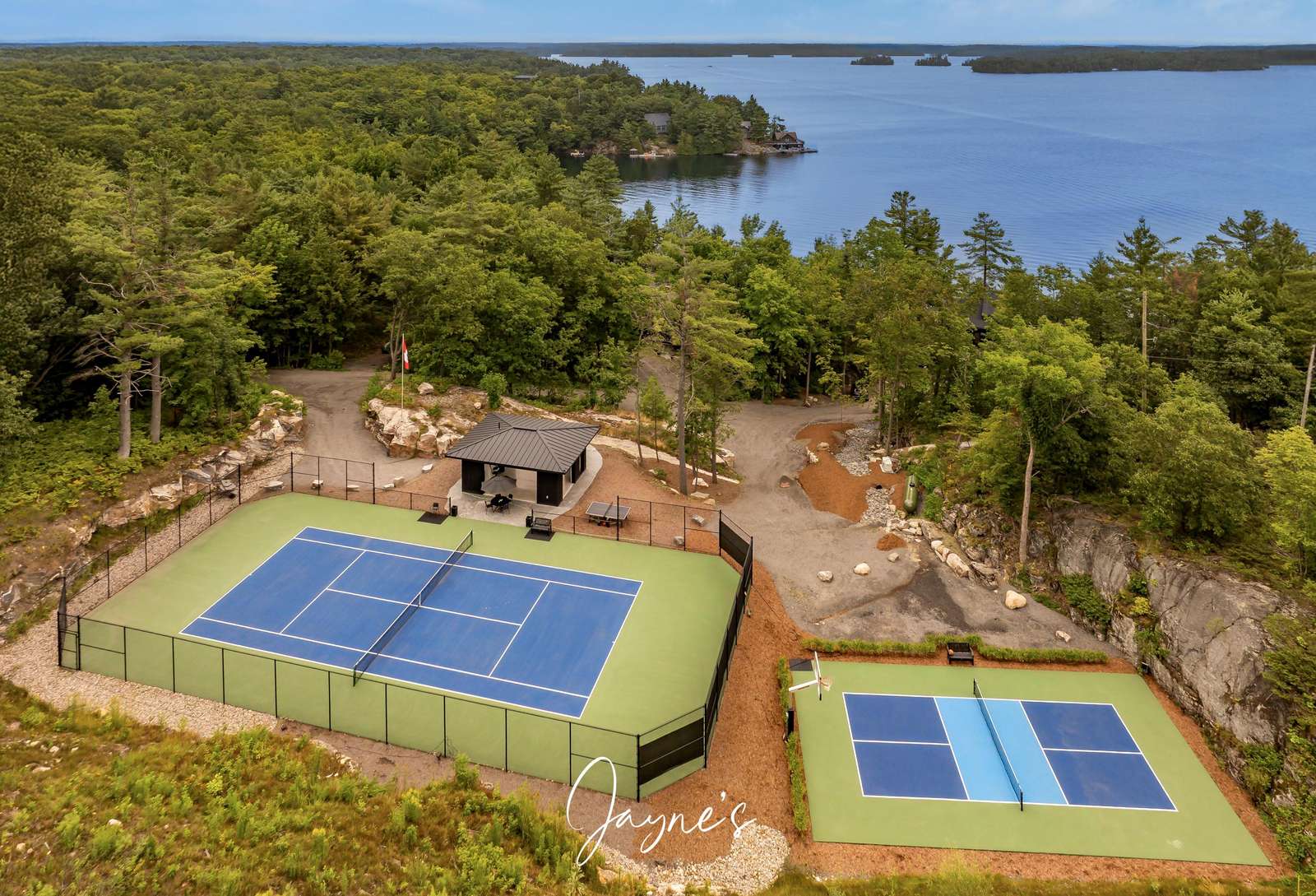 MODERN FUNHOUSE - A sweeping road framed by towering pine trees winds through the forest and brings you to the immaculate Modern Funhouse. Atop the property a Tennis Studio is complimented by a tennis court and a pickleball court with surrounded by beautiful Muskoka rock.