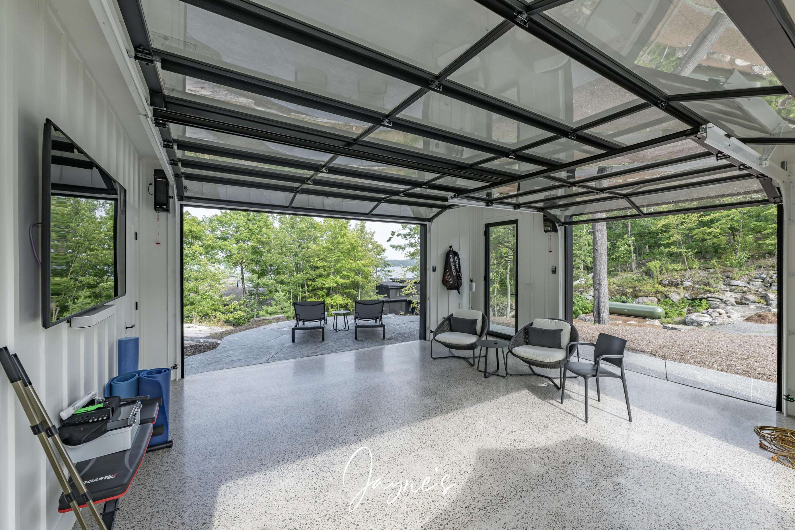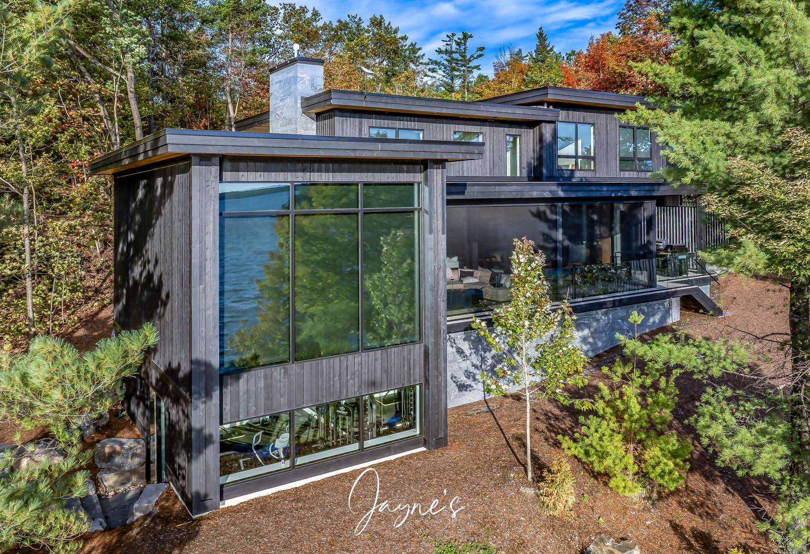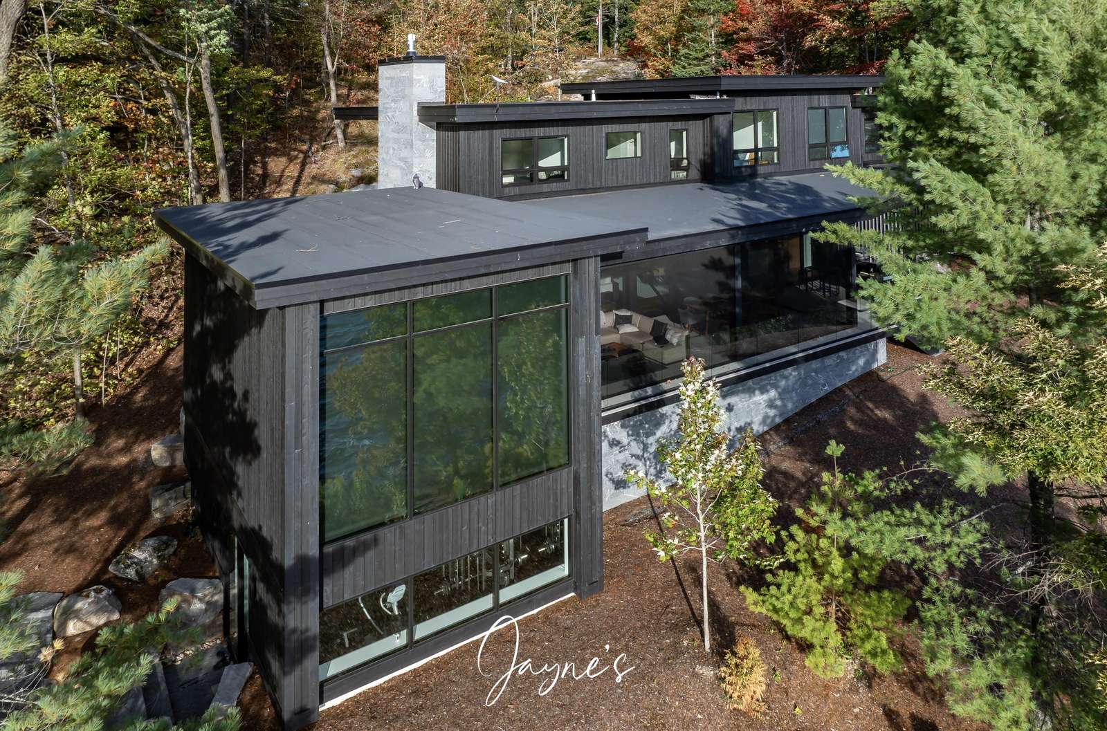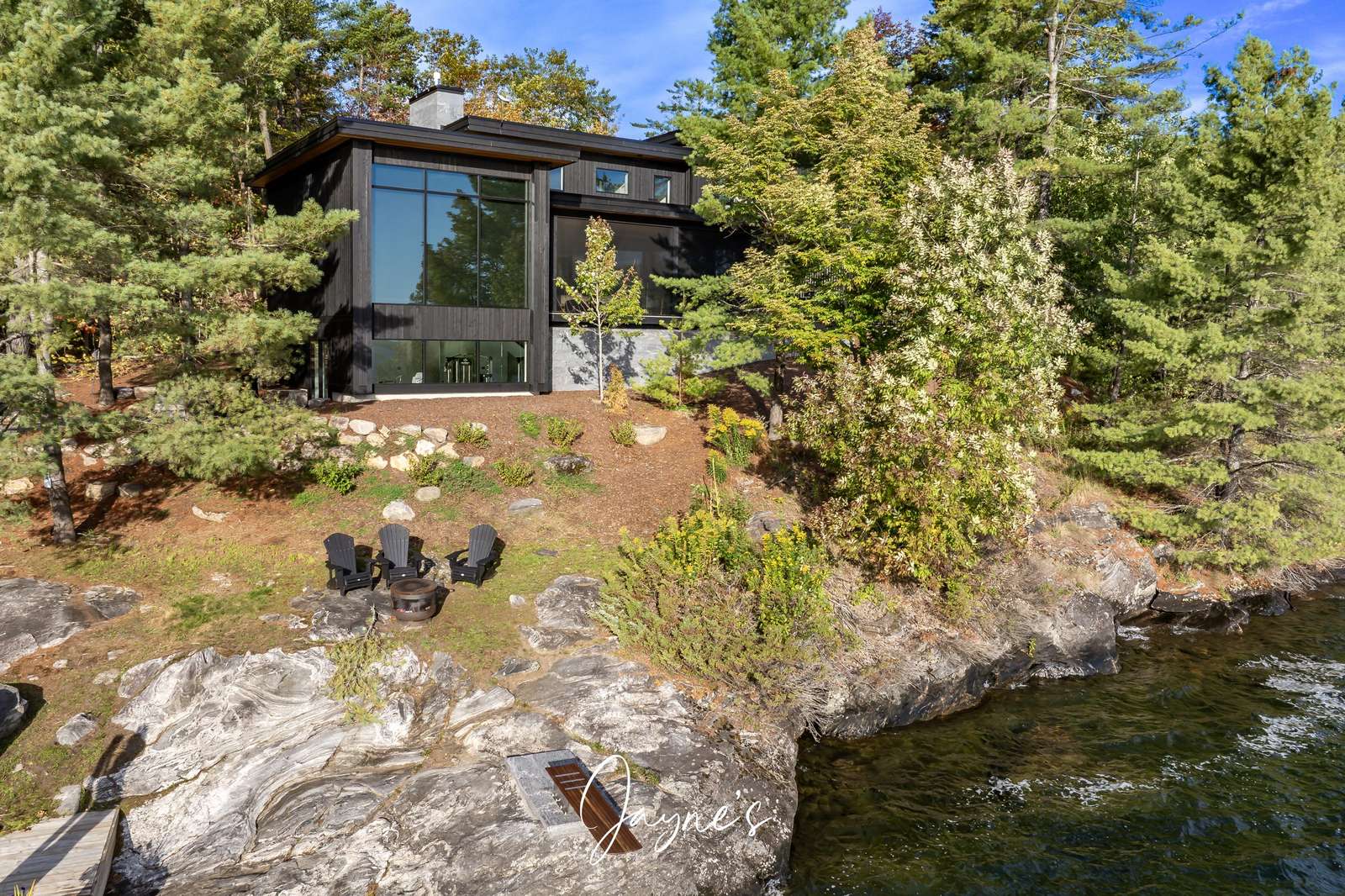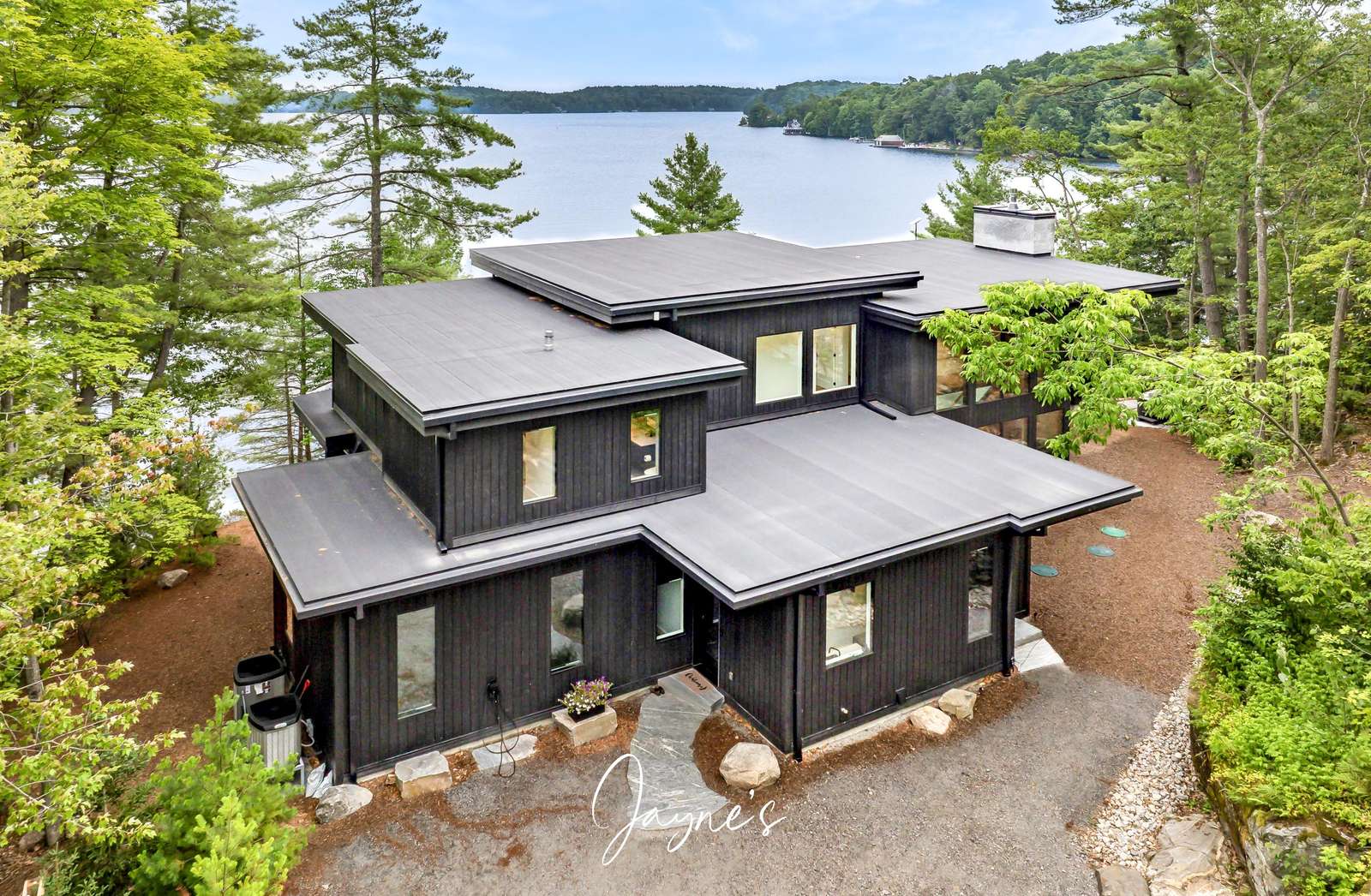 MODERN FUNHOUSE - A sweeping road framed by towering pine trees winds through the forest and brings you to the immaculate Modern Funhouse. Atop the property a Tennis Studio is complimented by a tennis court and a pickleball court with surrounded by beautiful Muskoka rock.