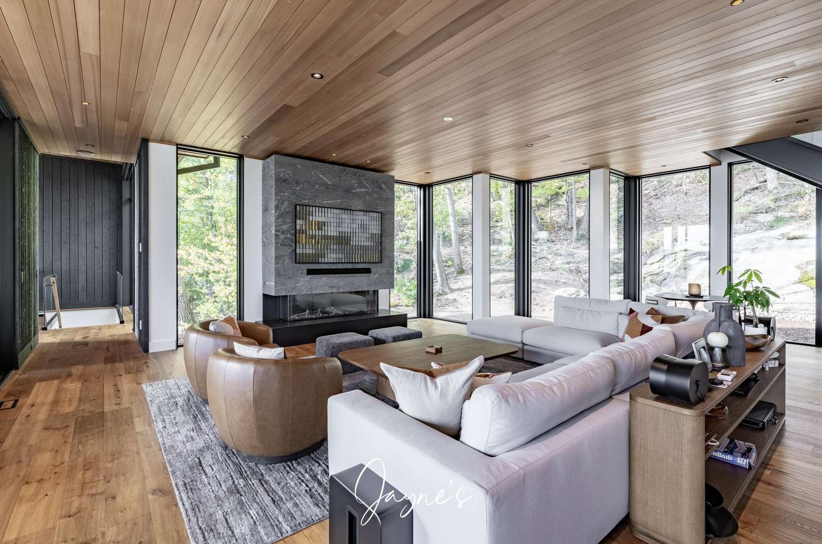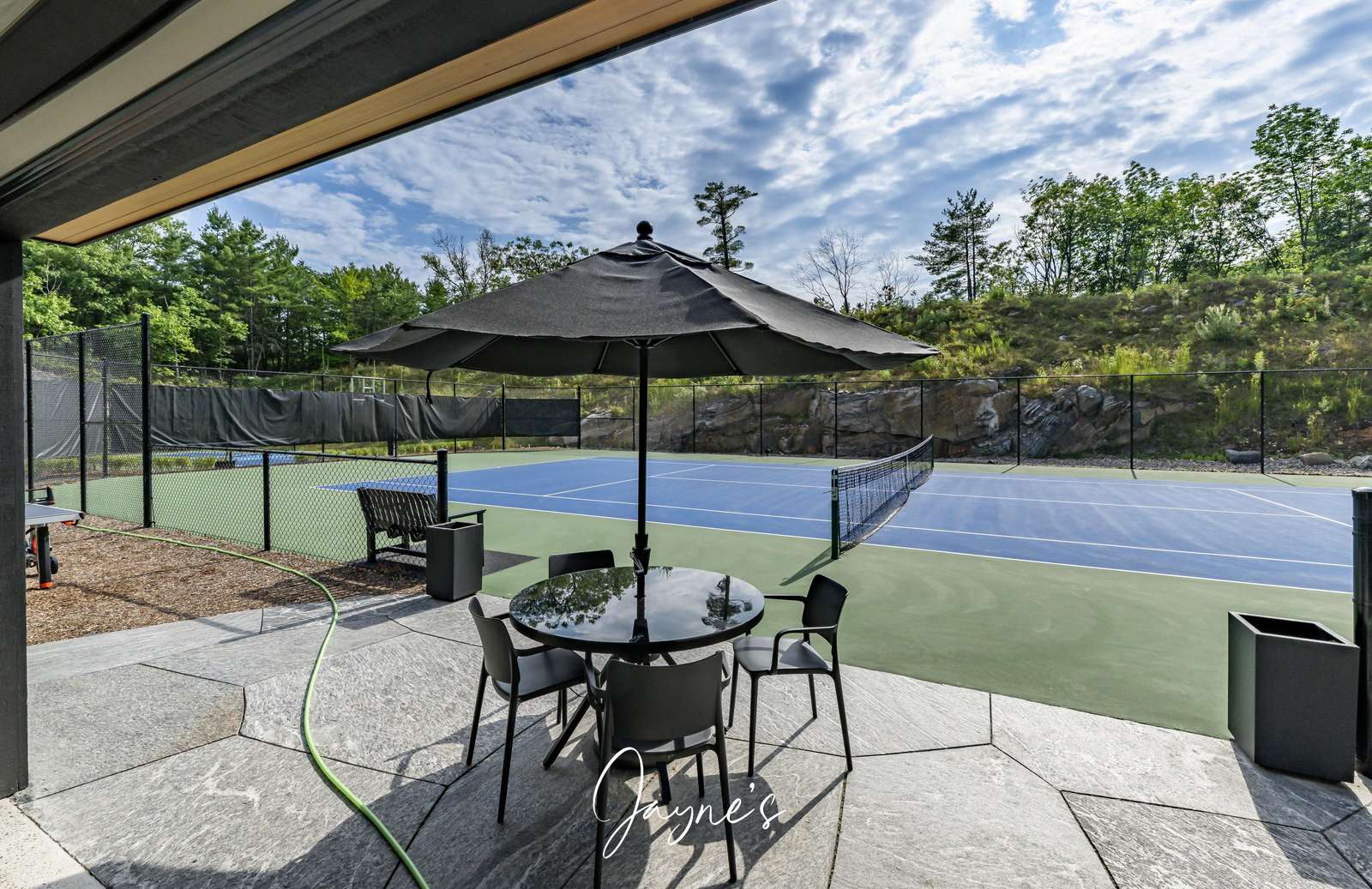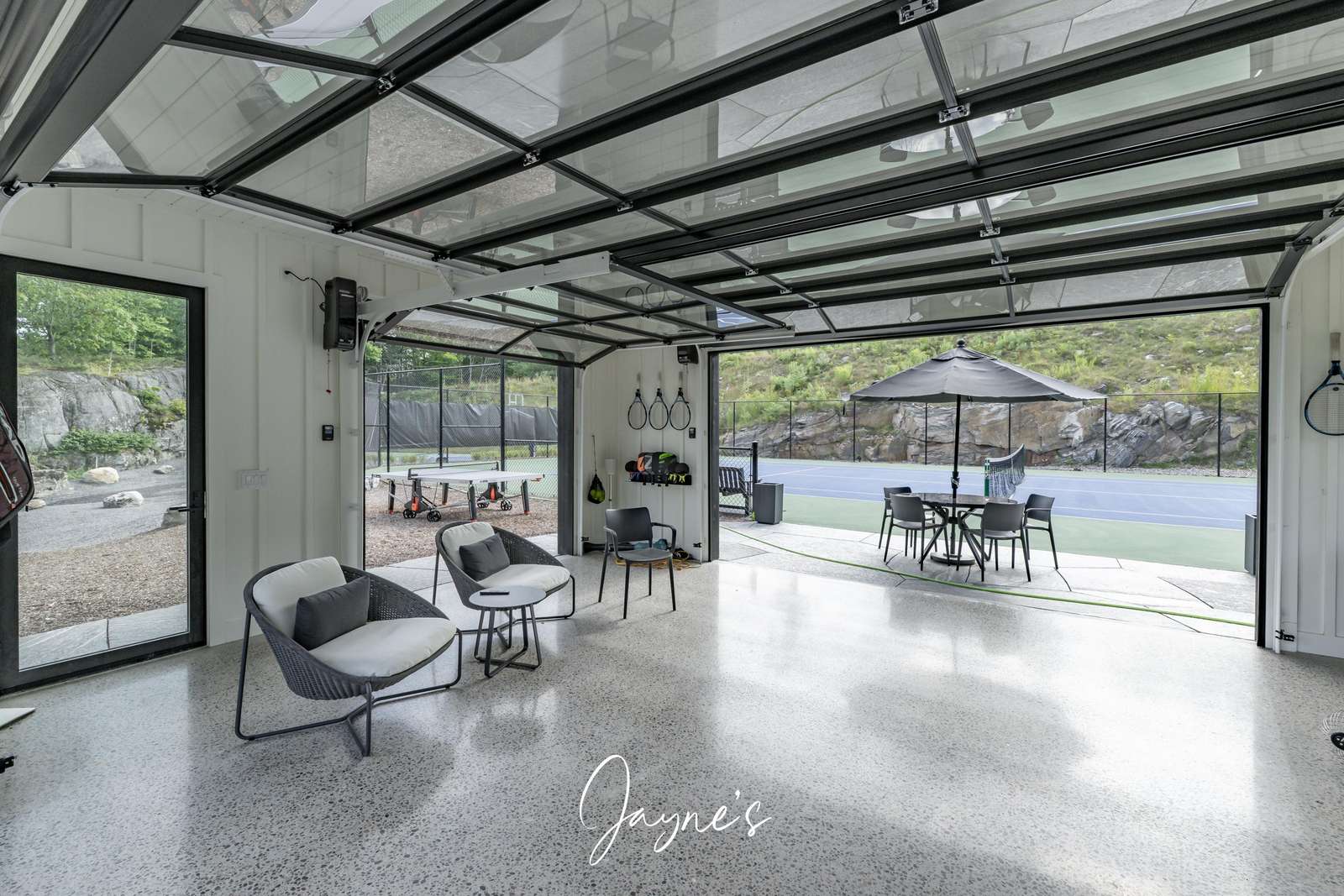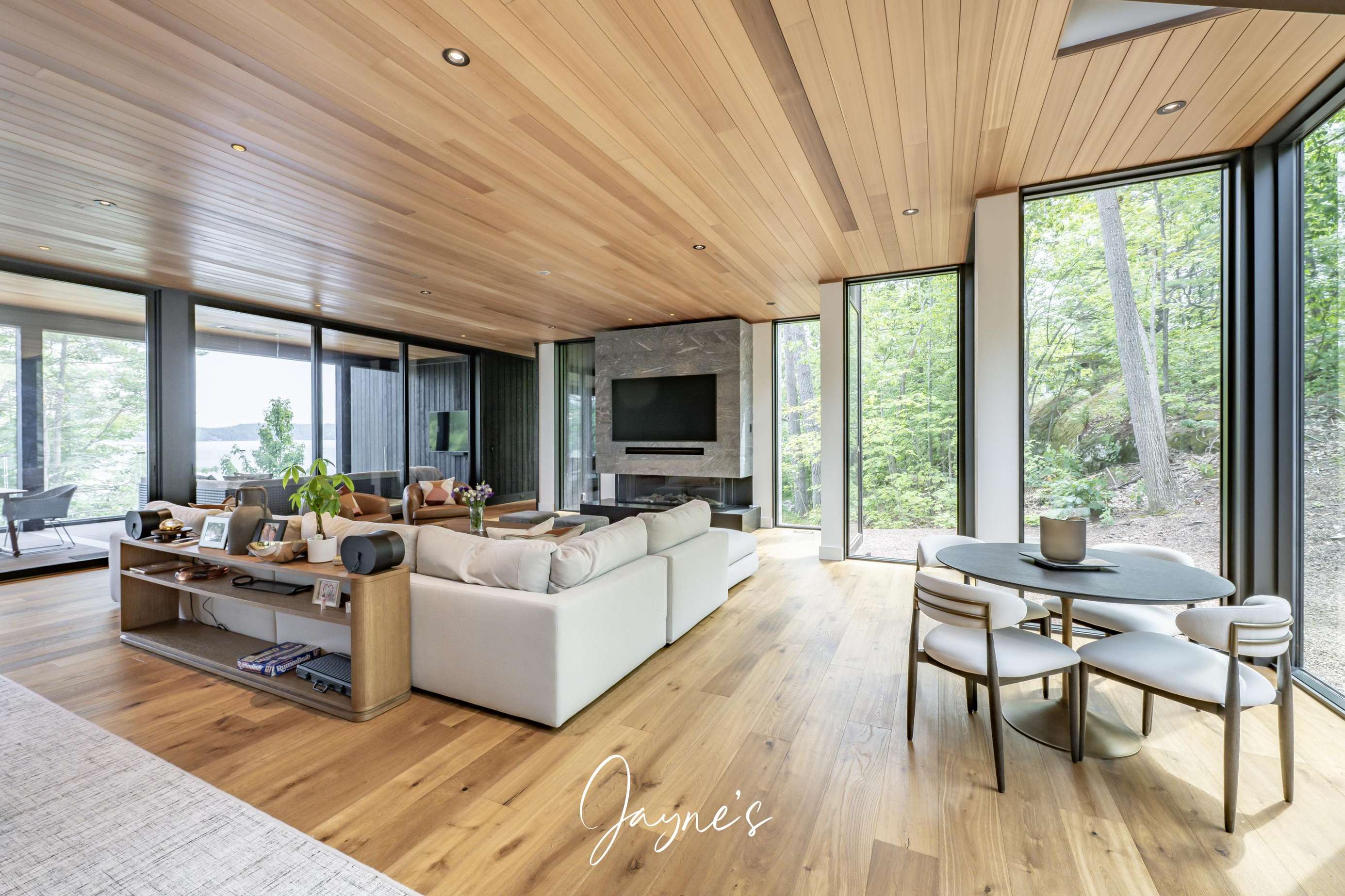 MODERN FUNHOUSE - A sweeping road framed by towering pine trees winds through the forest and brings you to the immaculate Modern Funhouse. Atop the property a Tennis Studio is complimented by a tennis court and a pickleball court with surrounded by beautiful Muskoka rock.