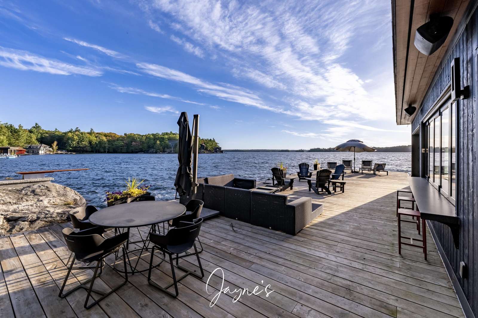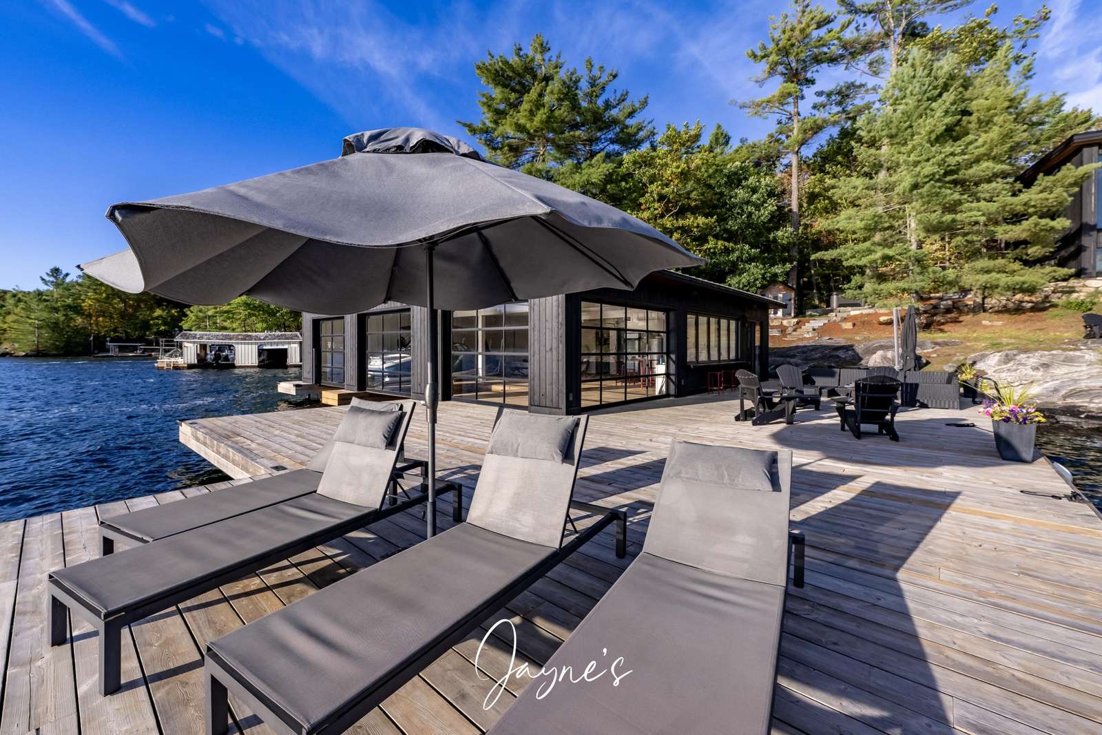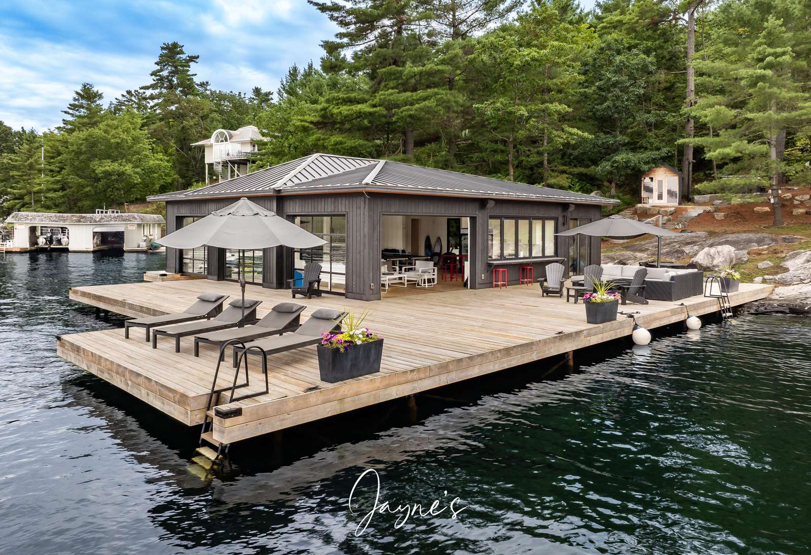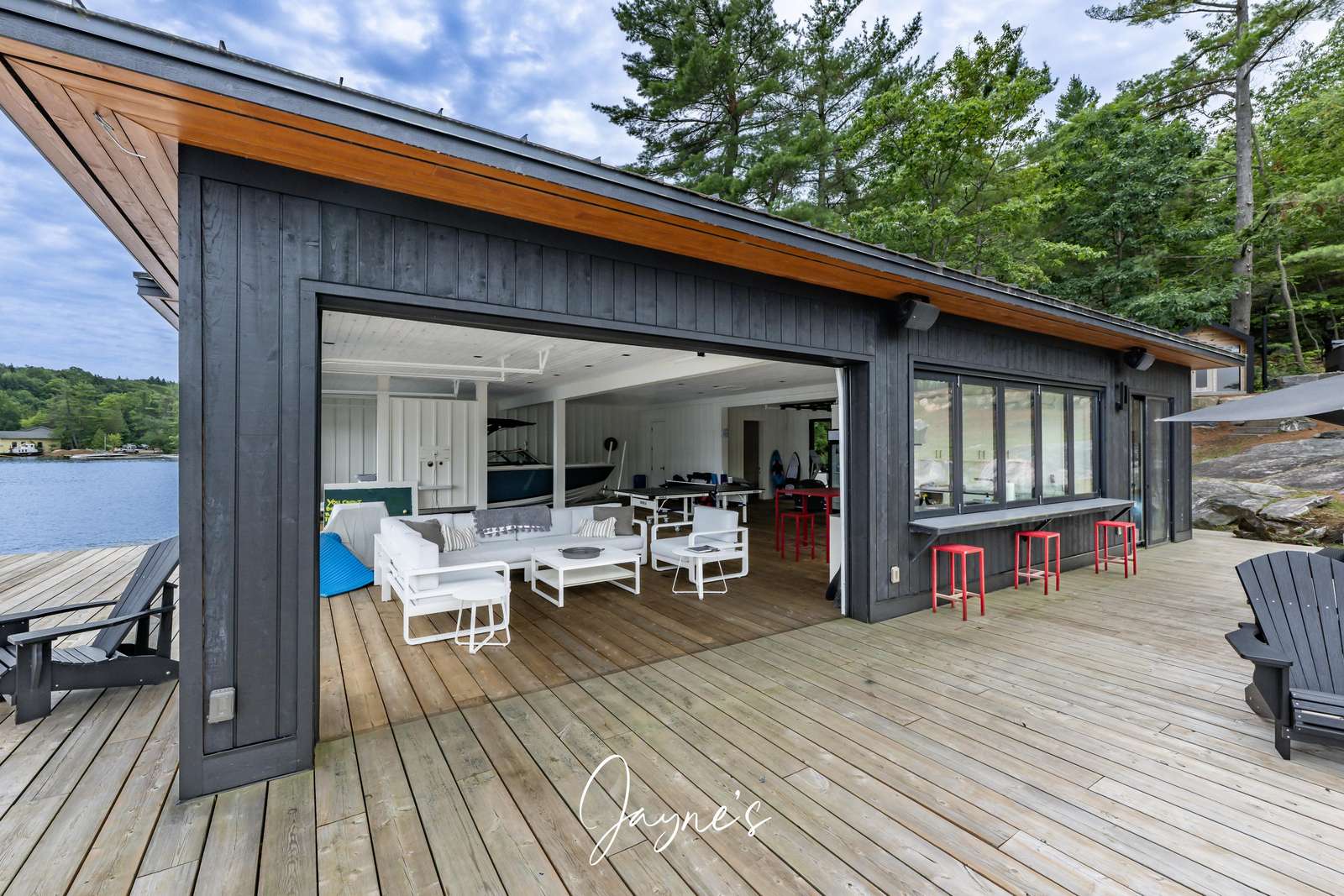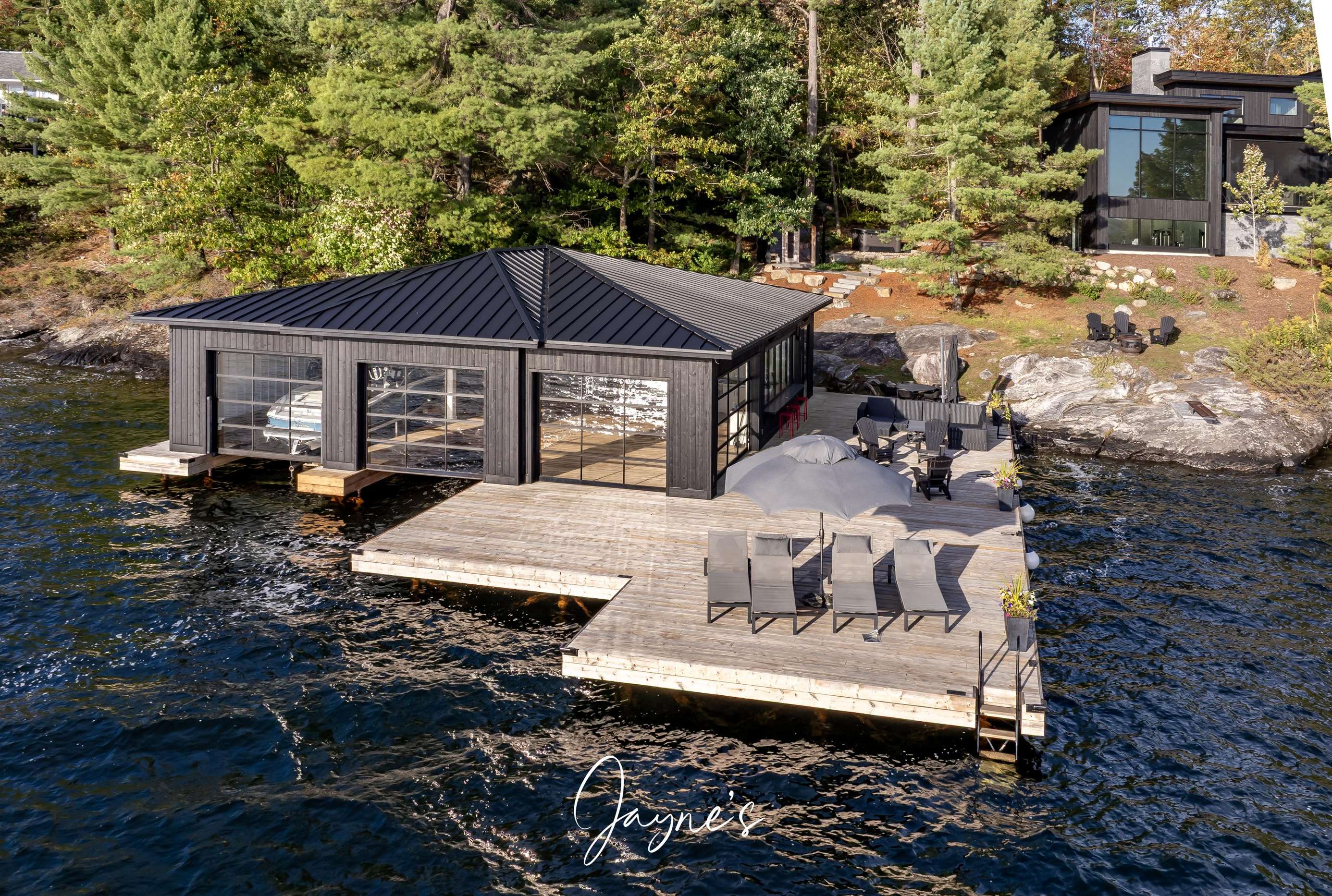 As you begin to descend down to the water, the sauna and hot tub are the perfect places to start your day. On the boathouse deck, bask in the sun on the outdoor sofa, lounge chairs or any of the many Muskoka chairs. When you are ready for a break, retreat into the boathouse oasis where electronic doors reveal a kitchette bar area. Deep water off the end of the dock allow you to show off your best cannonball!