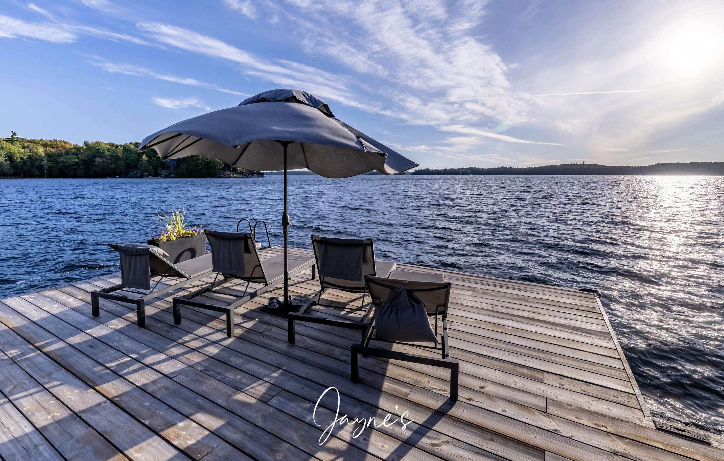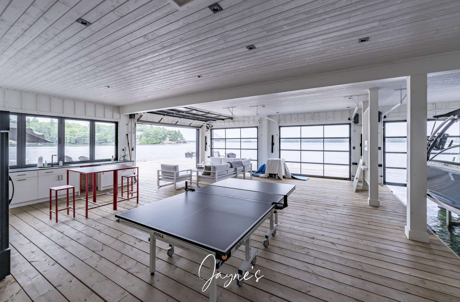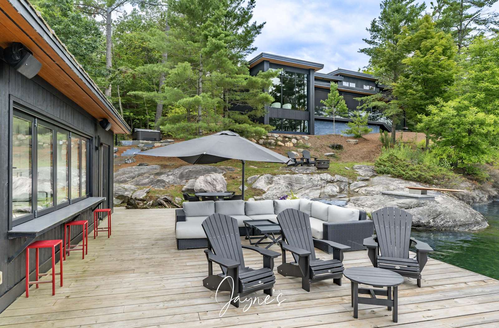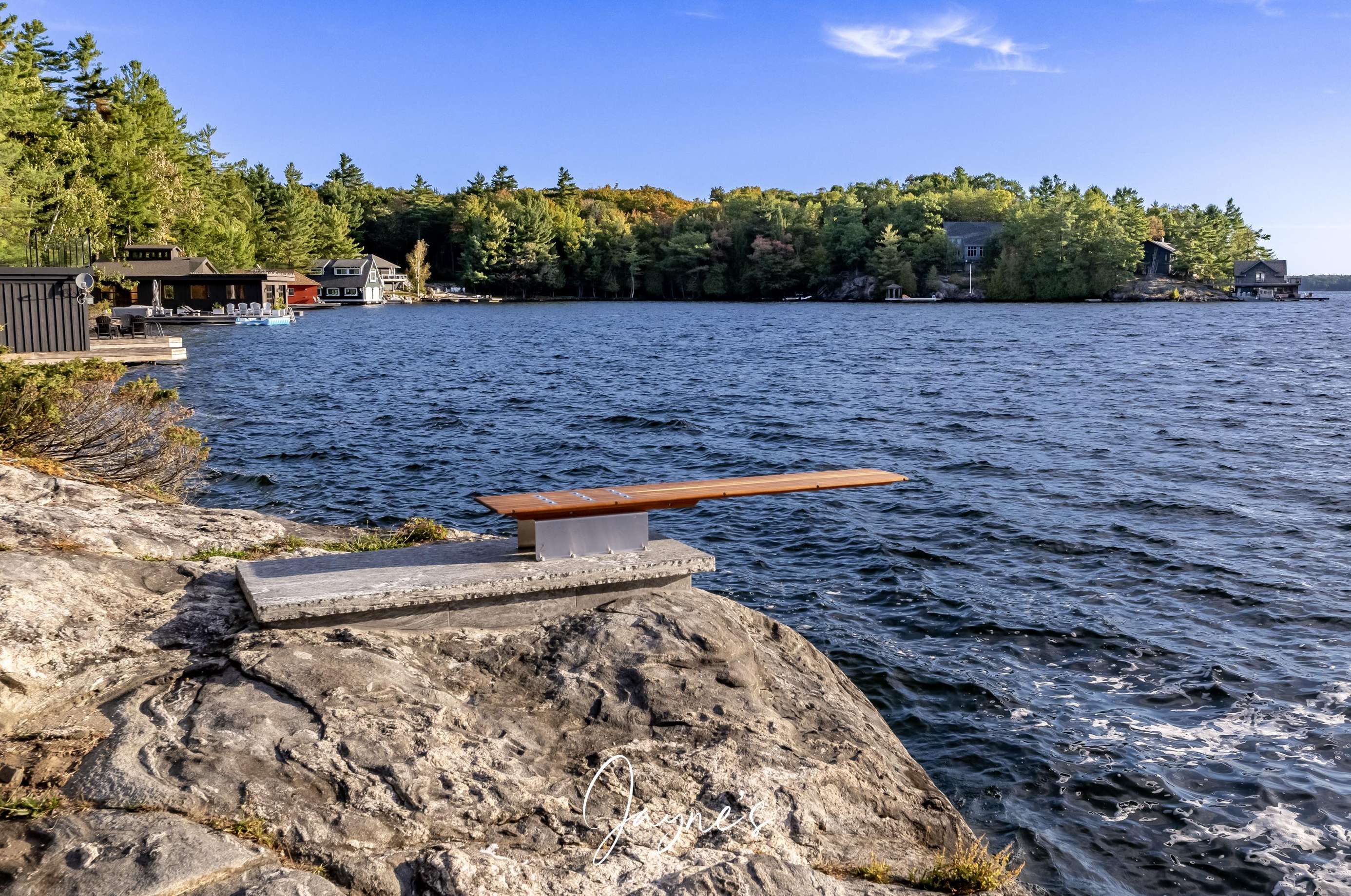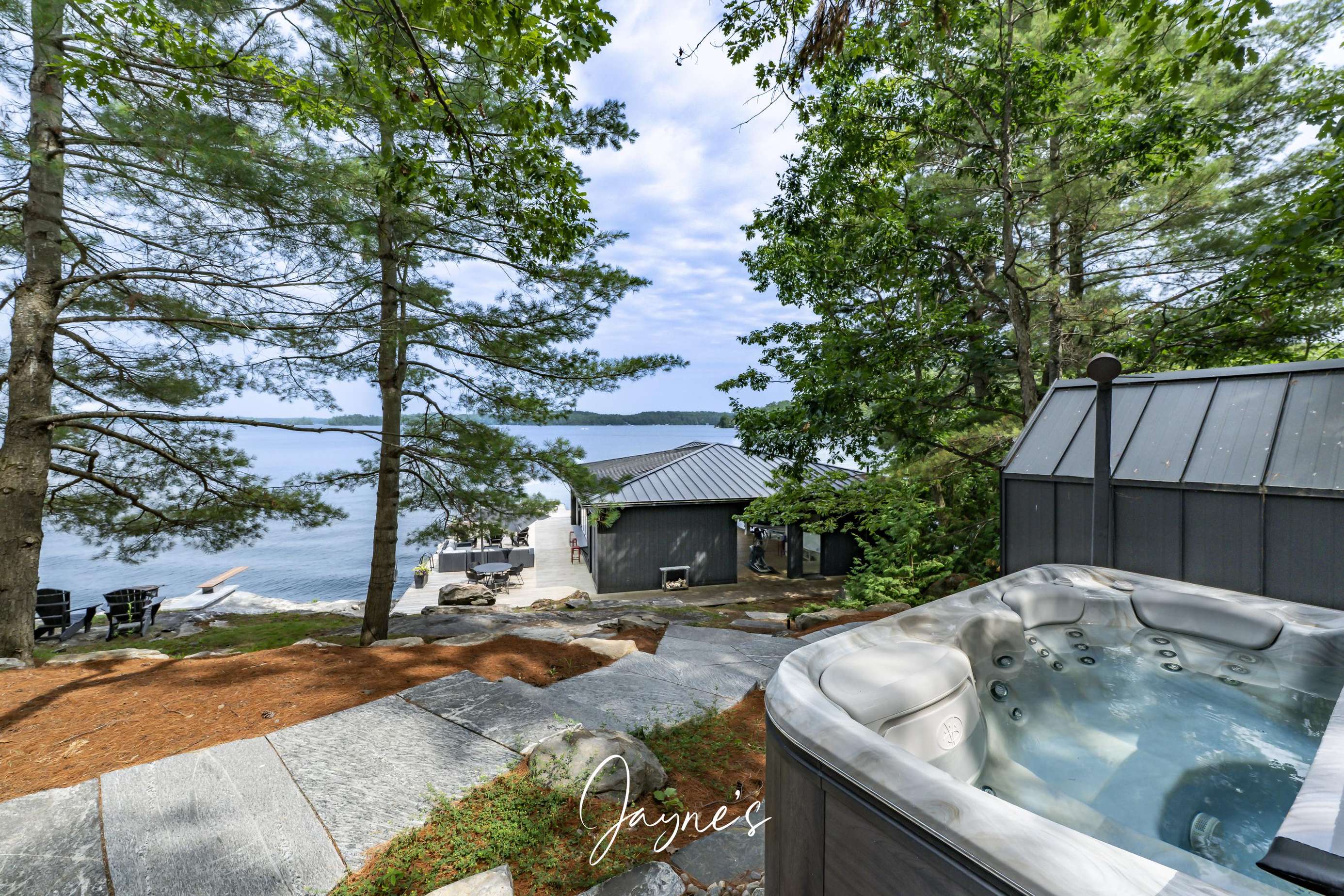 As you begin to descend down to the water, the sauna and hot tub are the perfect places to start your day. On the boathouse deck, bask in the sun on the outdoor sofa, lounge chairs or any of the many Muskoka chairs. When you are ready for a break, retreat into the boathouse oasis where electronic doors reveal a kitchette bar area. Deep water off the end of the dock allow you to show off your best cannonball!