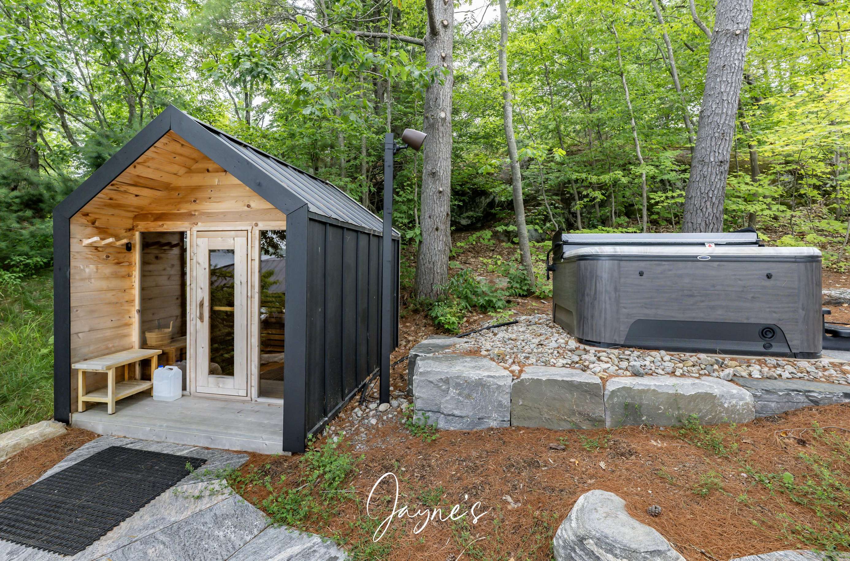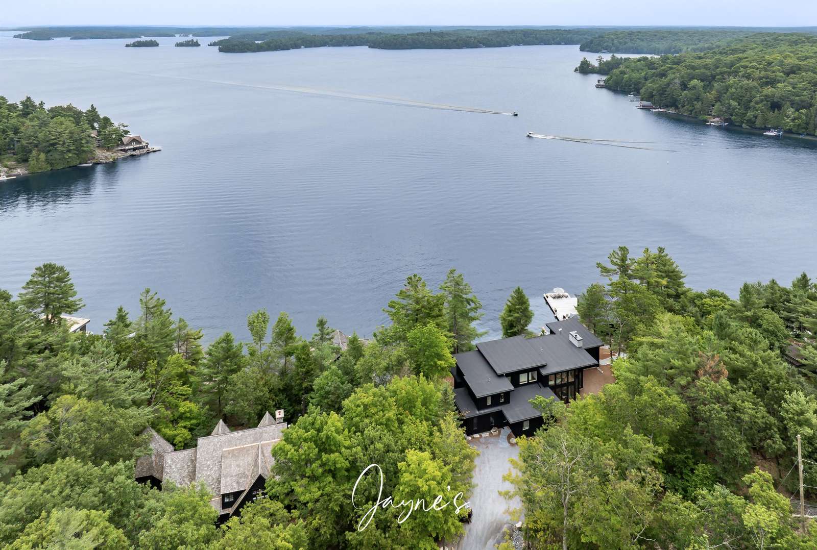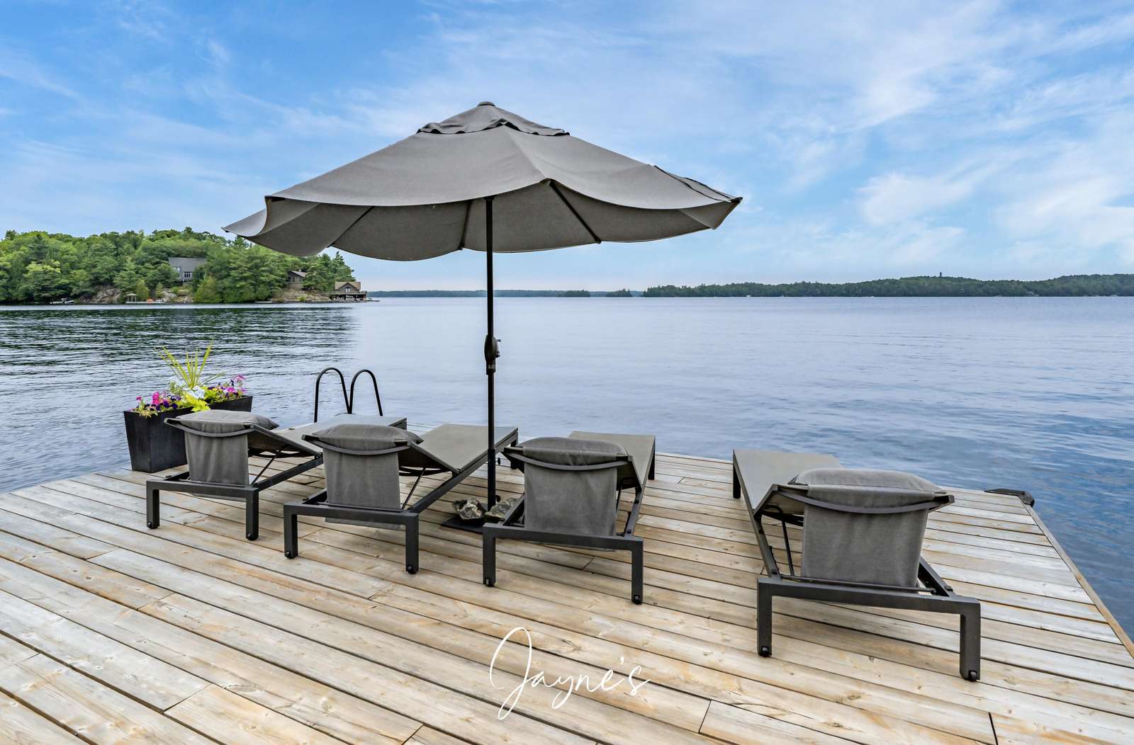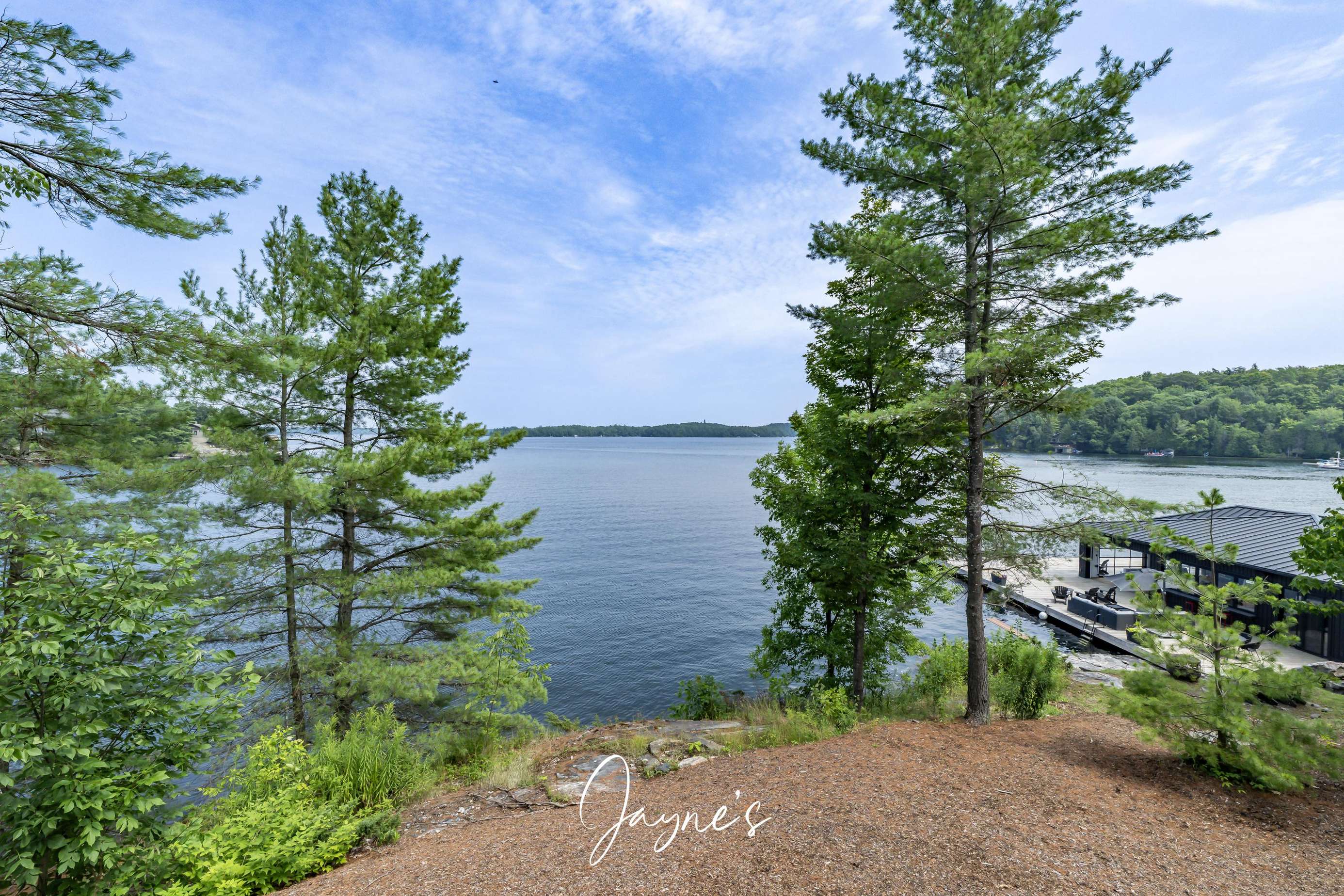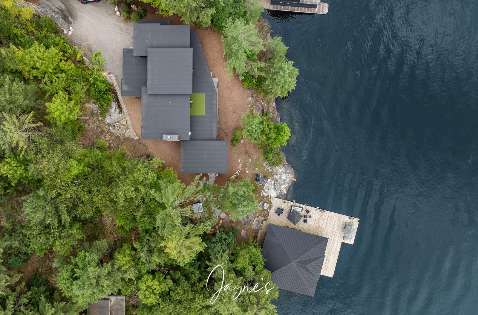 As you begin to descend down to the water, the sauna and hot tub are the perfect places to start your day. On the boathouse deck, bask in the sun on the outdoor sofa, lounge chairs or any of the many Muskoka chairs. When you are ready for a break, retreat into the boathouse oasis where electronic doors reveal a kitchette bar area. Deep water off the end of the dock allow you to show off your best cannonball!