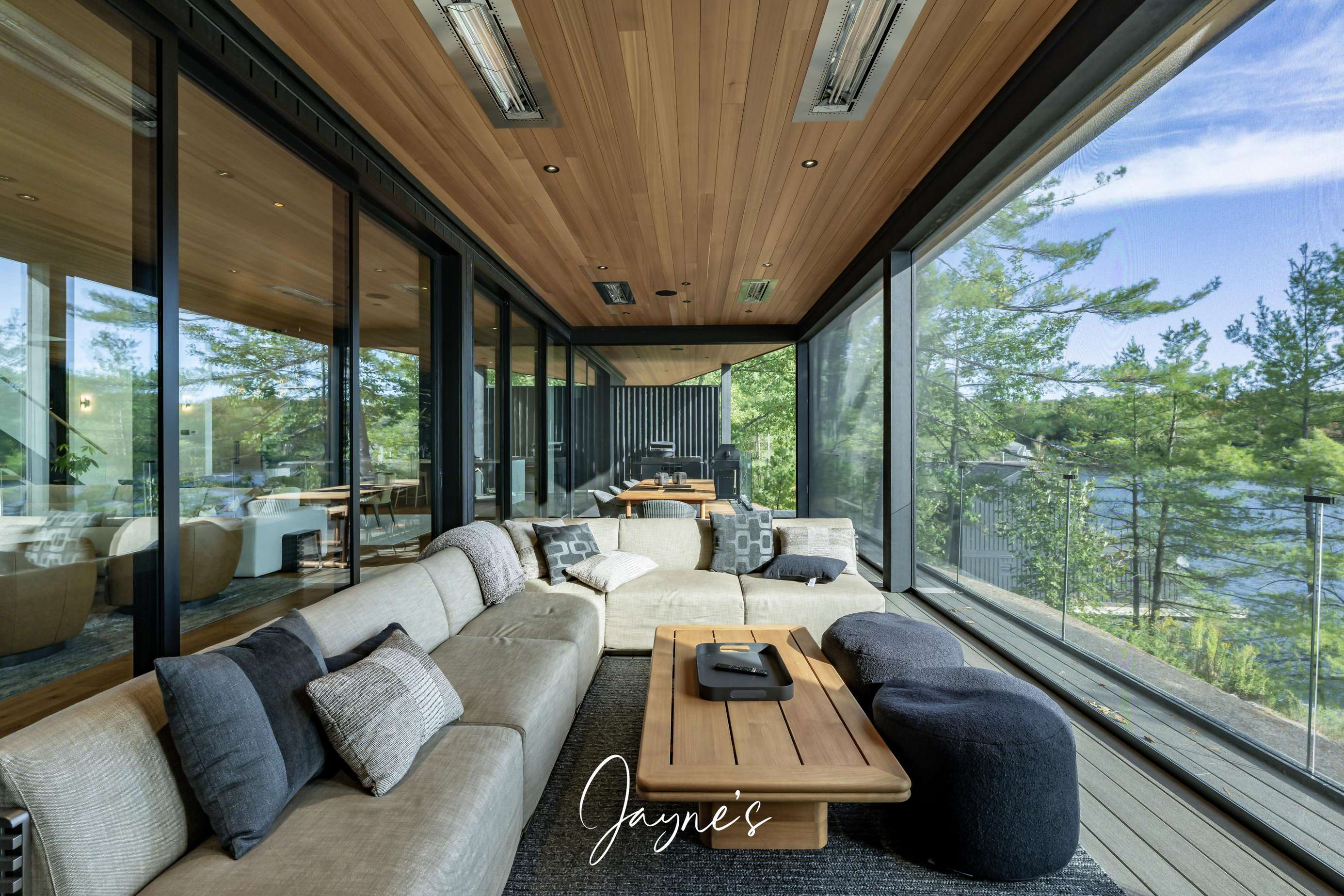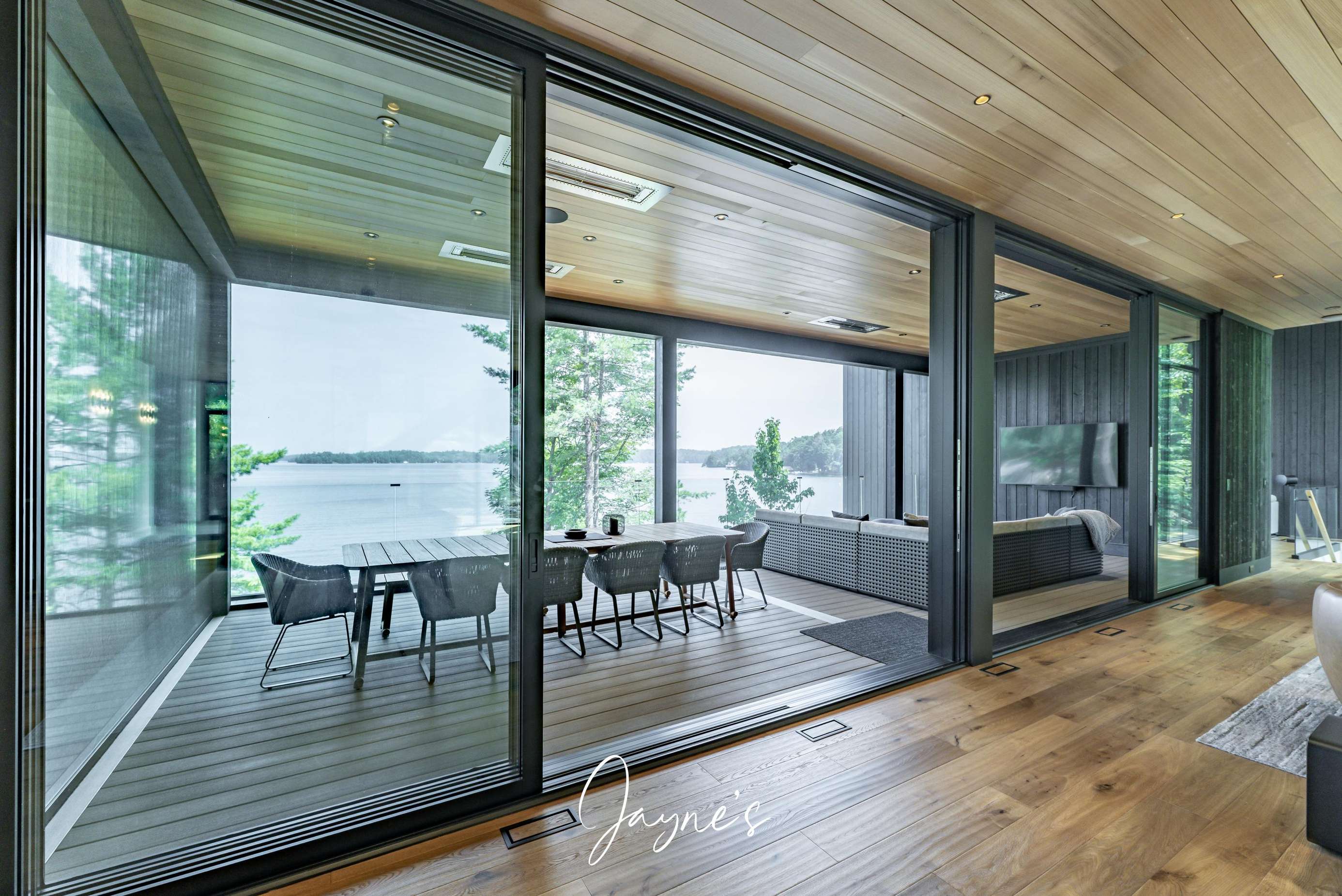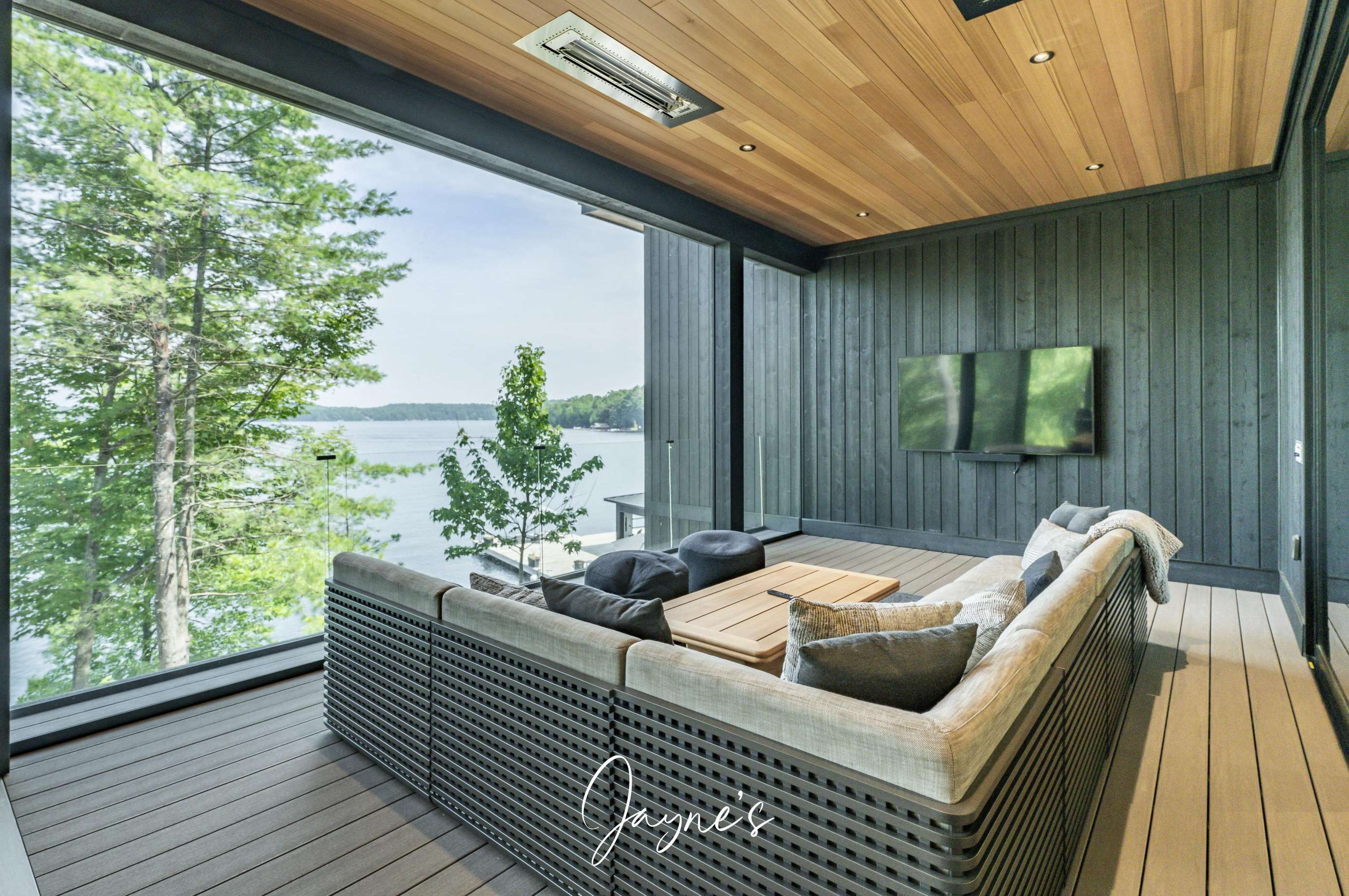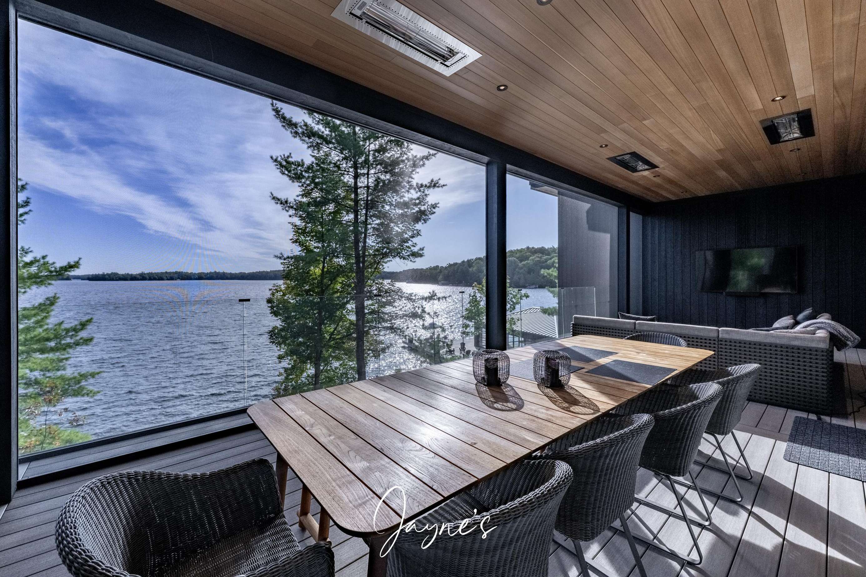 Situated off the Great Room, the Muskoka Room is a fully screened in room offering sweeping views of the lake. Here a dining table for 8 beneath, 2 heaters and a sofa + TV can be found.