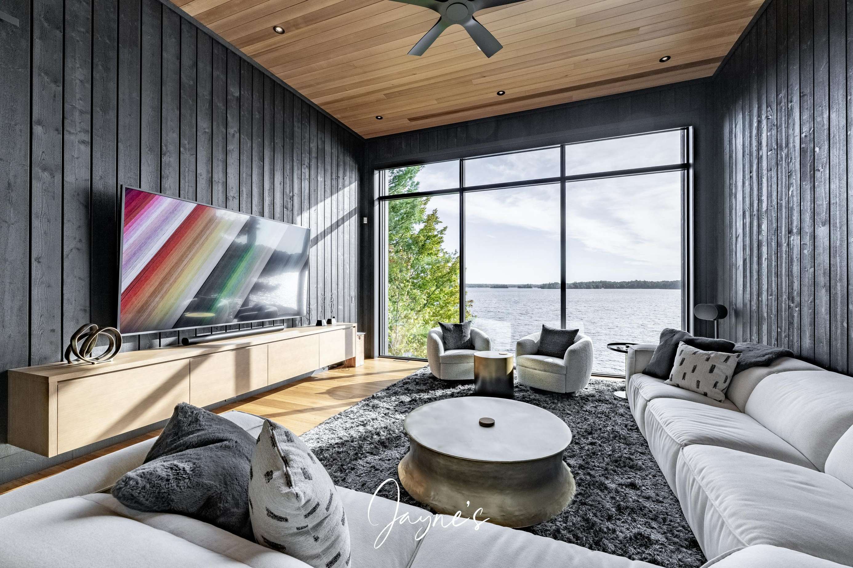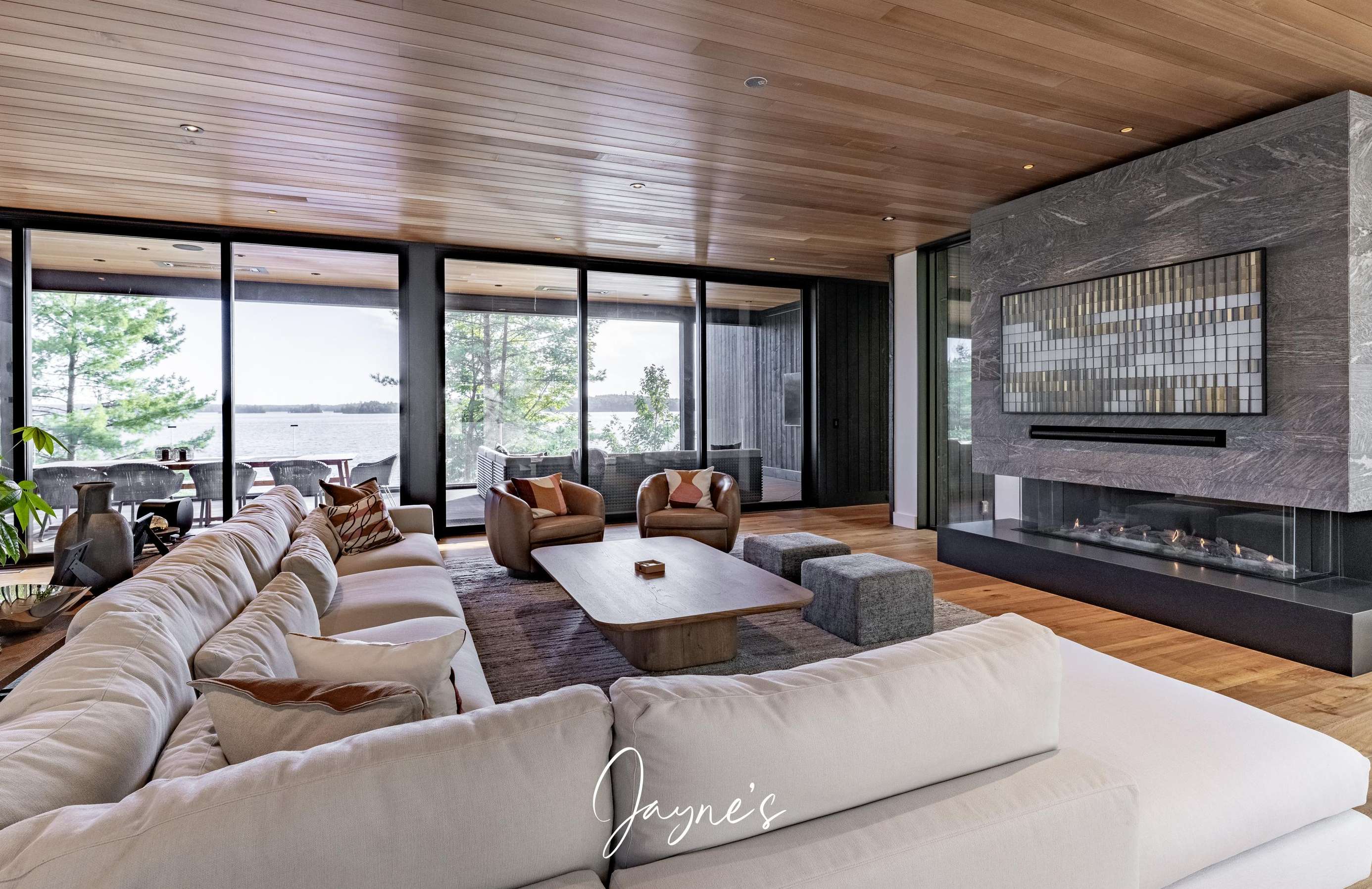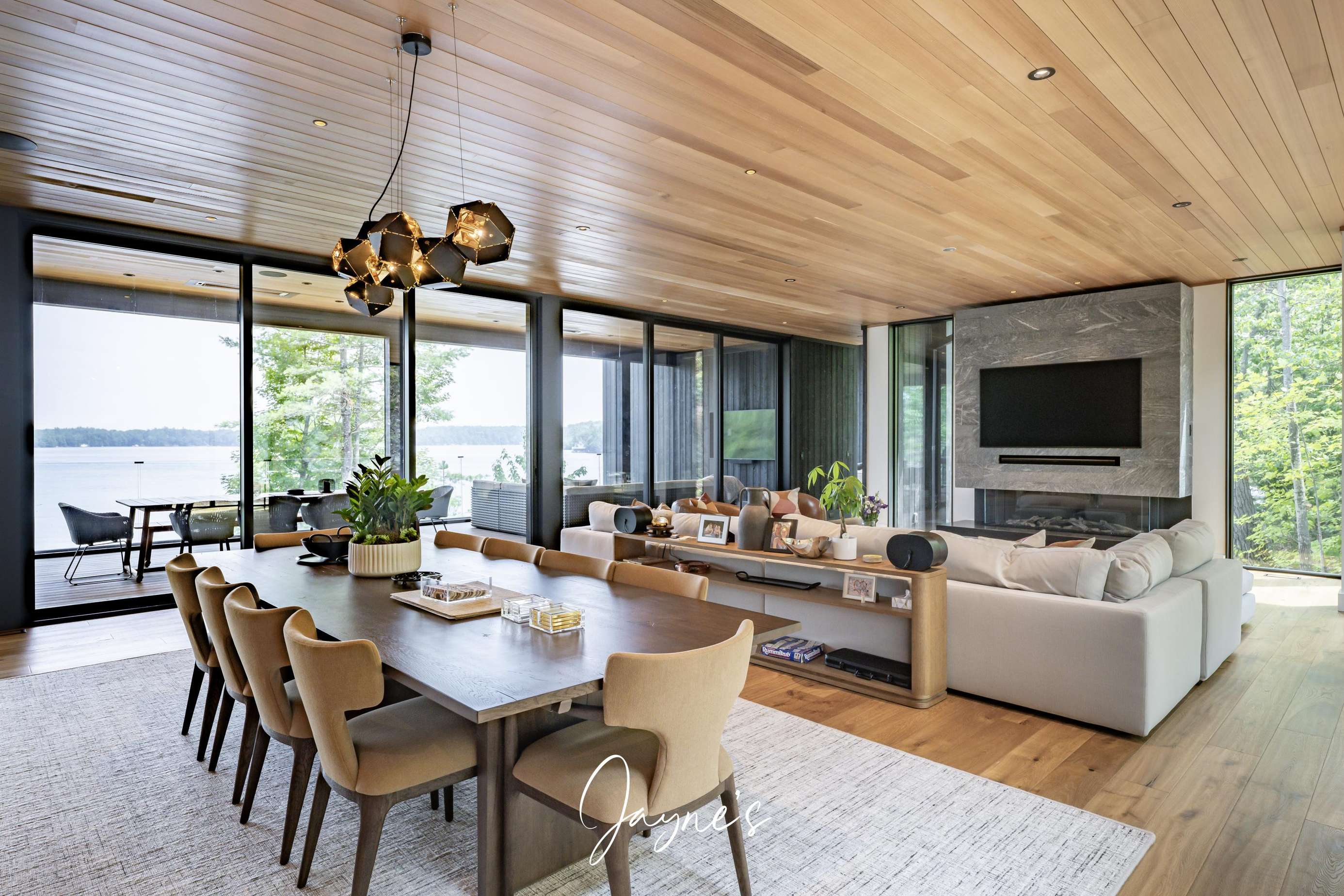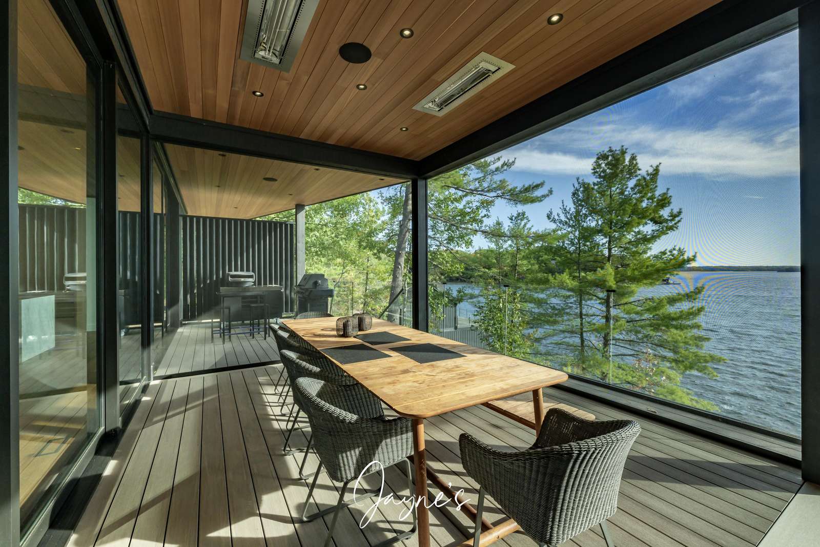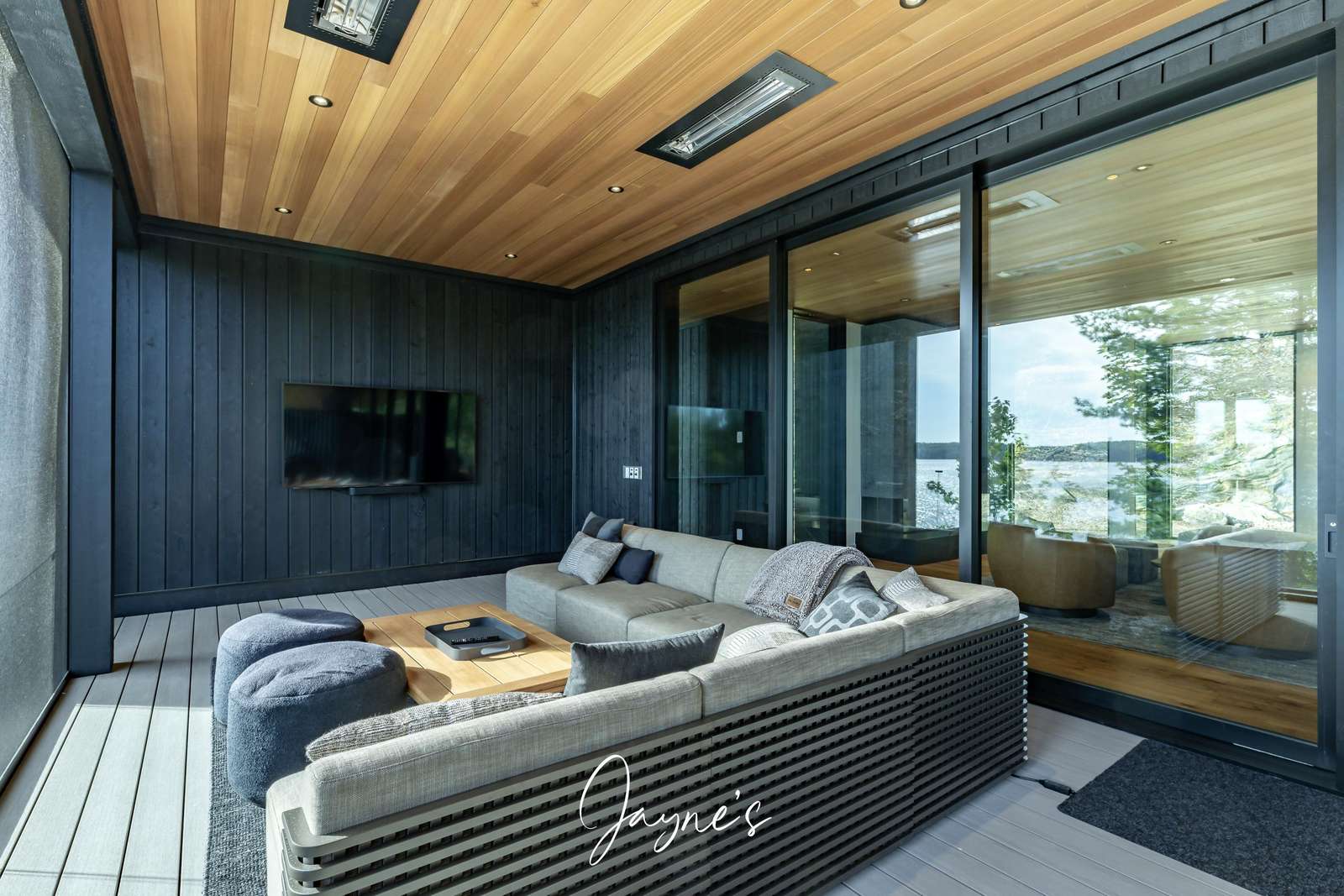 Situated off the Great Room, the Muskoka Room is a fully screened in room offering sweeping views of the lake. Here a dining table for 8 beneath, 2 heaters and a sofa + TV can be found.