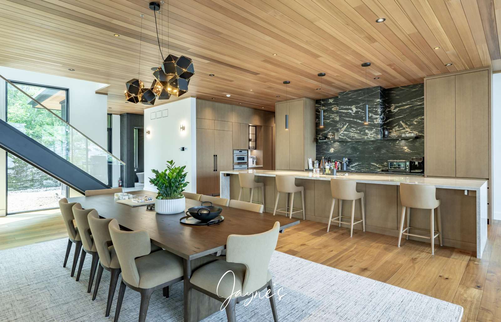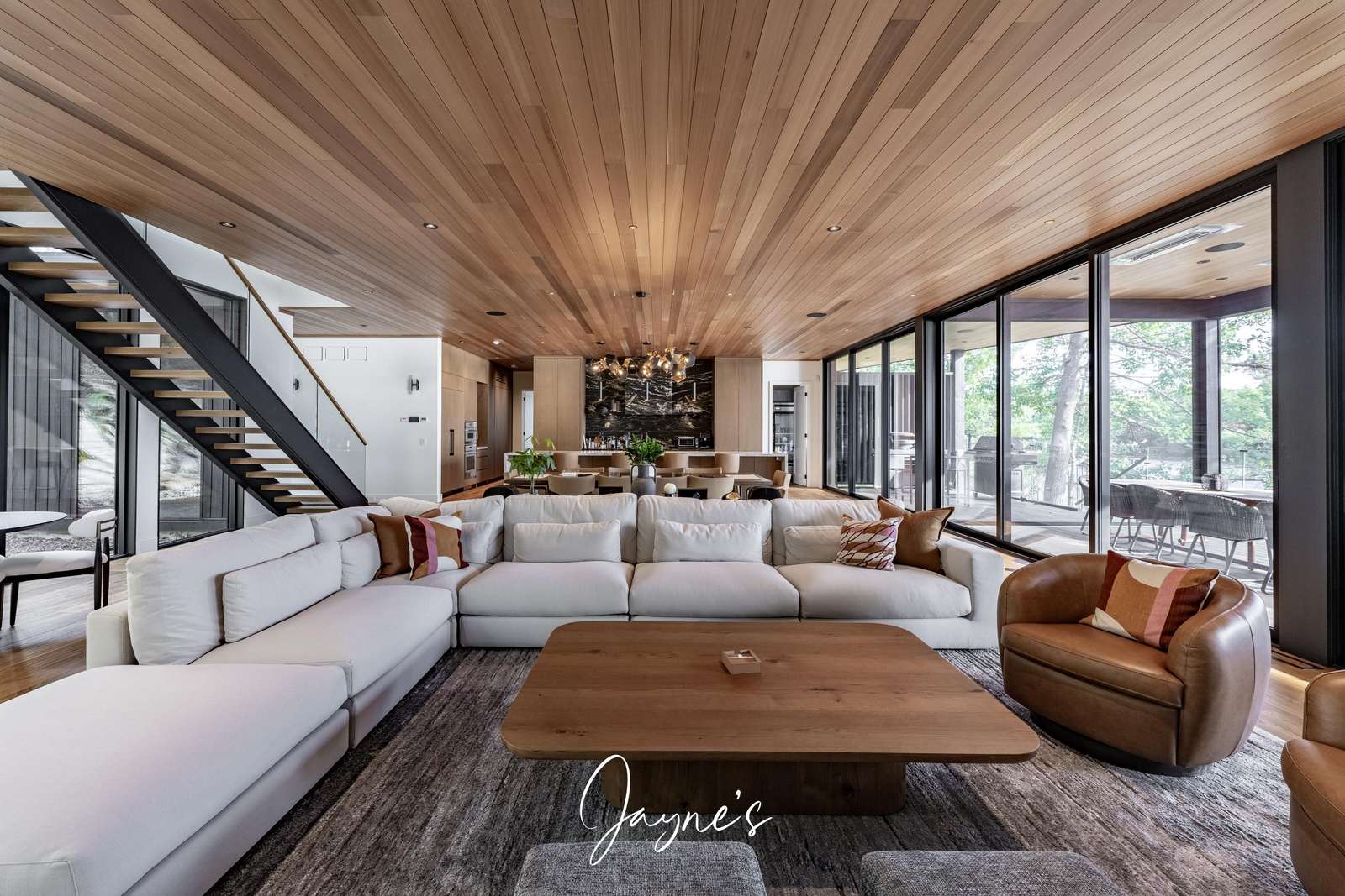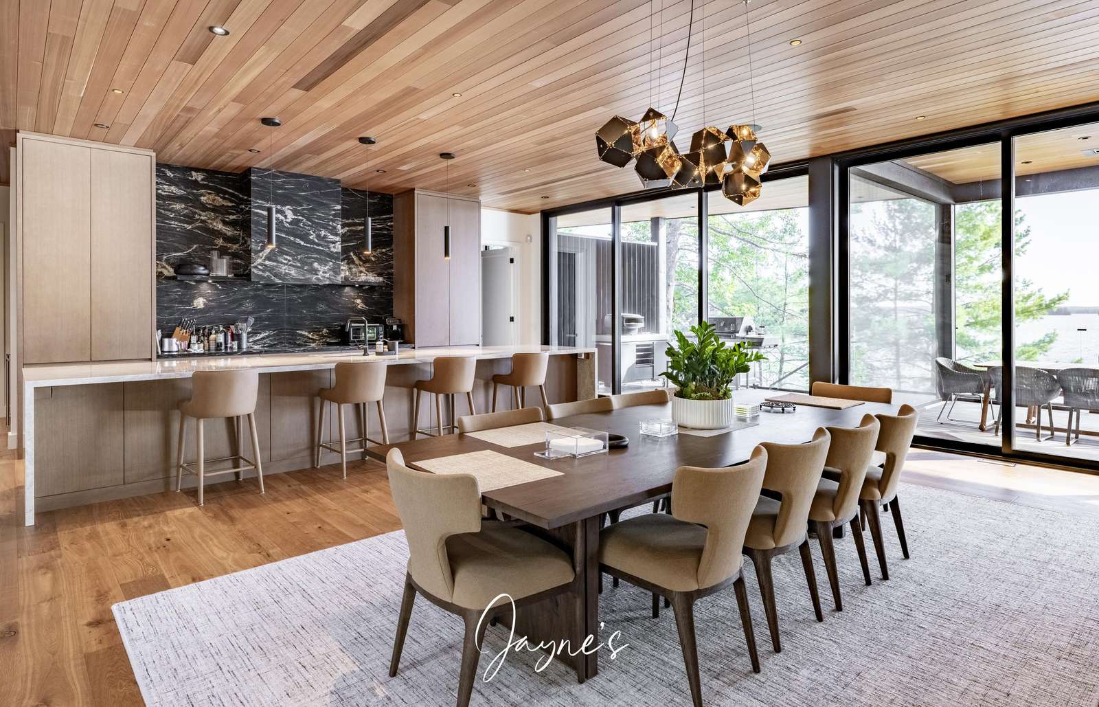 A breath-taking space with 180 views of the lake pour in through the windows. A large island with waterfall countertops seats 4. Enjoy a full butler's pantry with 2 additional fridges, a second sink, second dishwasher and set of wall ovens.