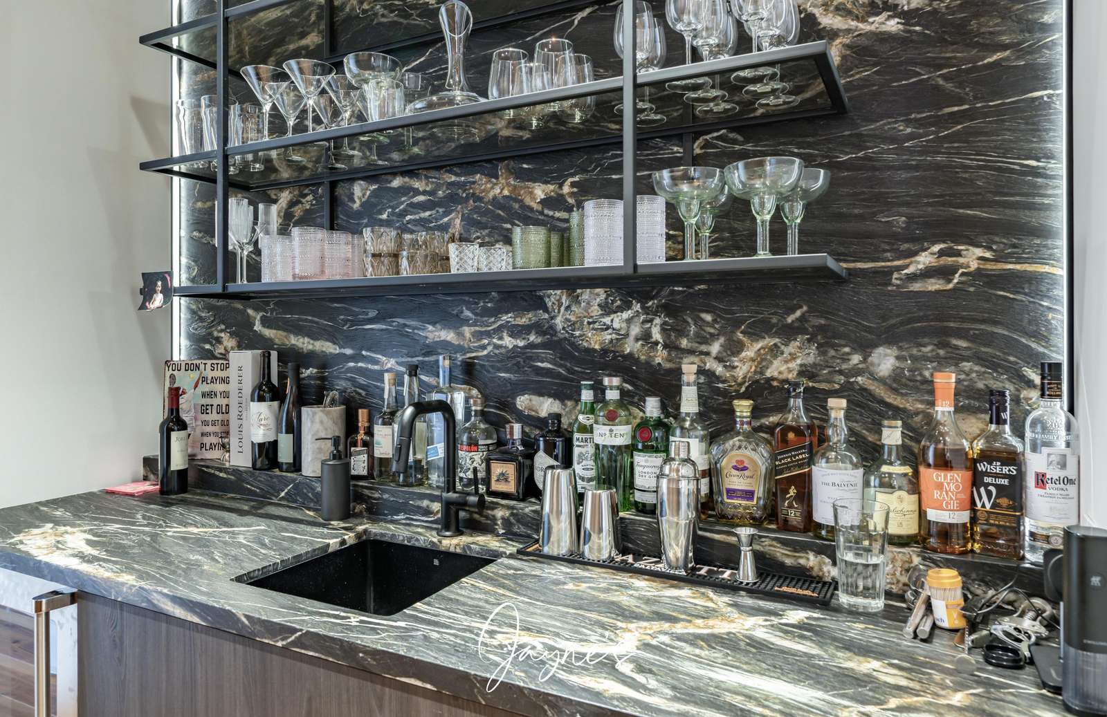 Around the corner a wet bar area offers two wine fridges.