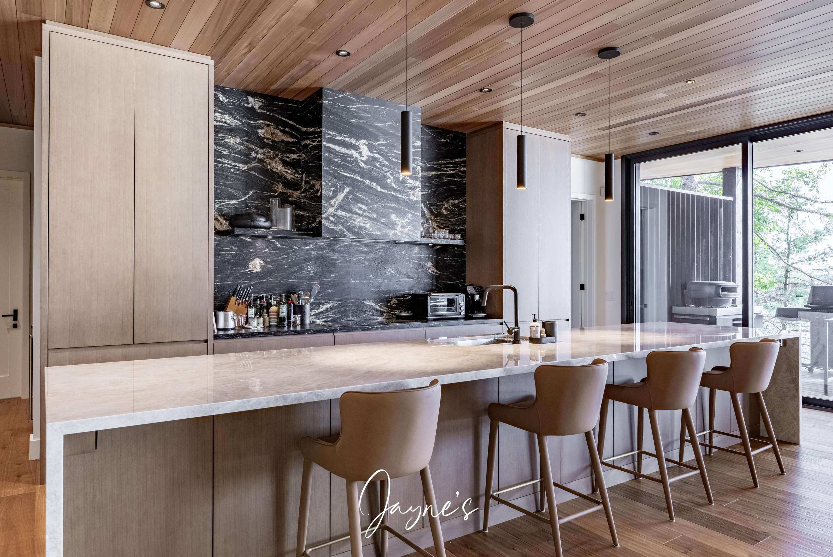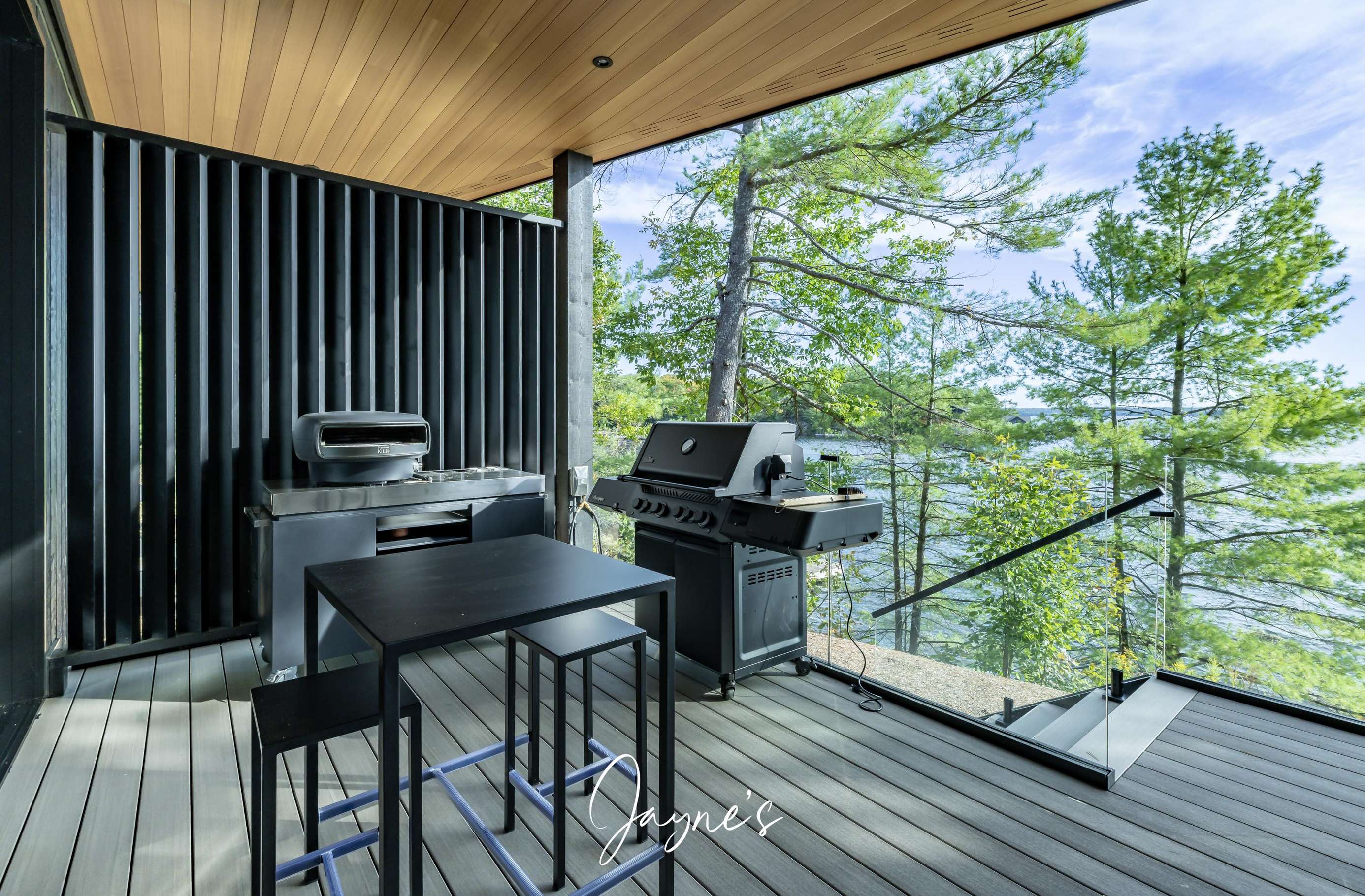 The cottage offers an abundance of outdoor spaces to soak in the Muskoka scenes. Off the Primary, enjoy a lounging on your private balcony. On outdoor kitchen is featured off the kitchen - with a BBQ and pizza oven.