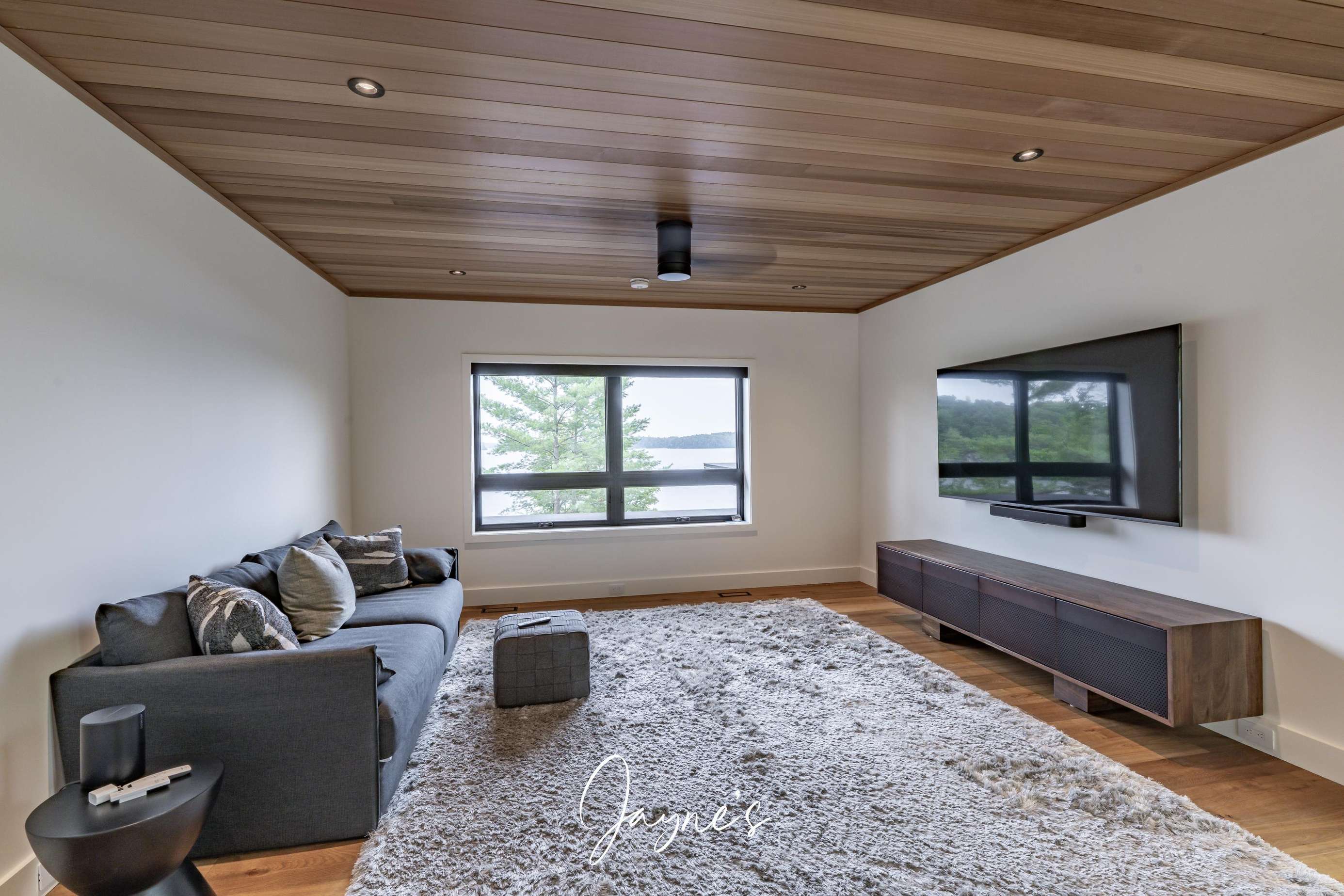 Arguably the best room in the house - with the illusion of floating! A plush L-shaped sofa is situated across from an oversized TV.