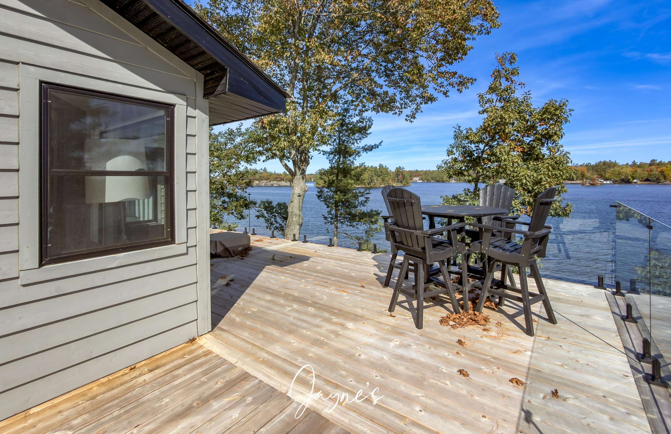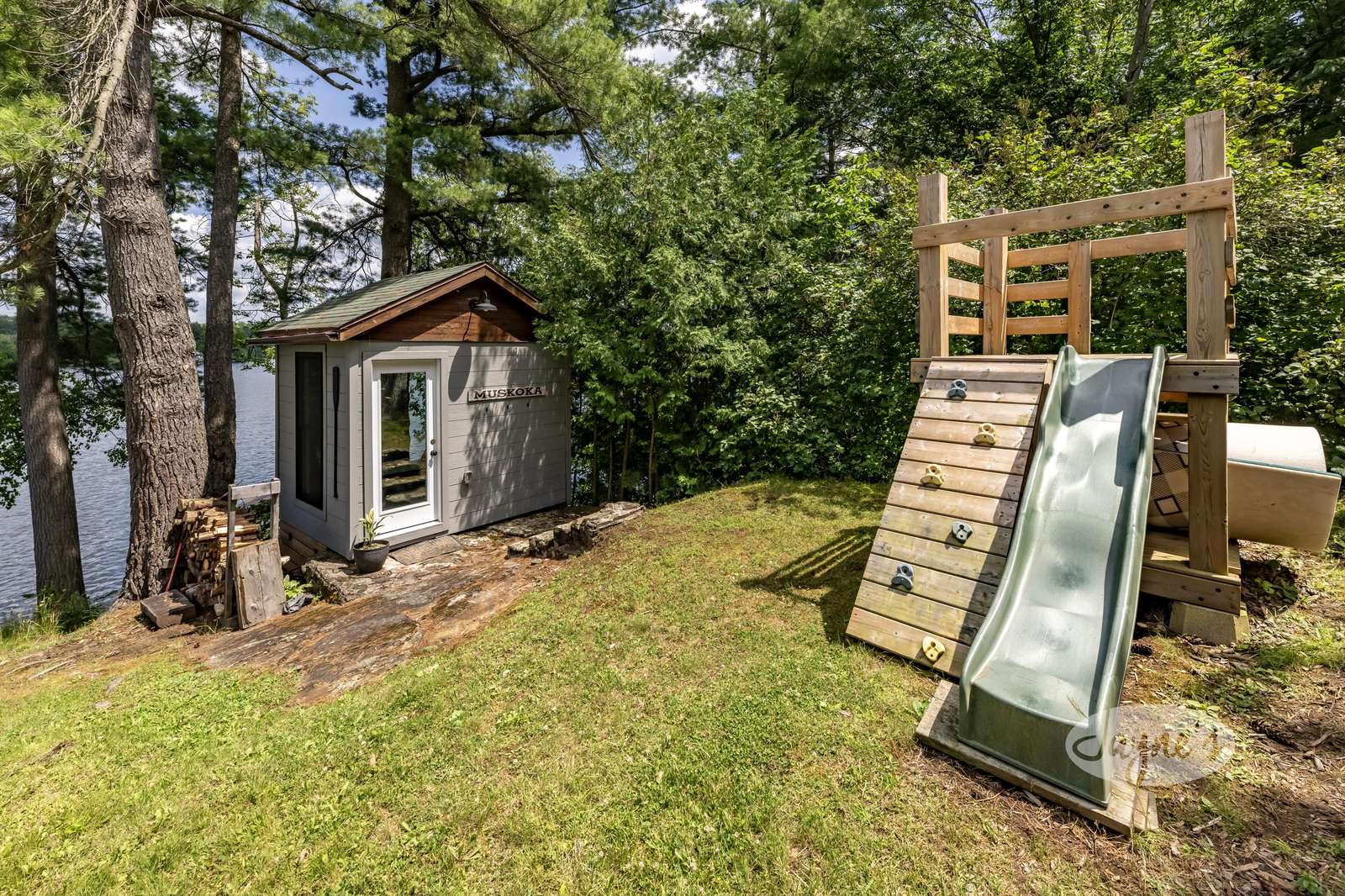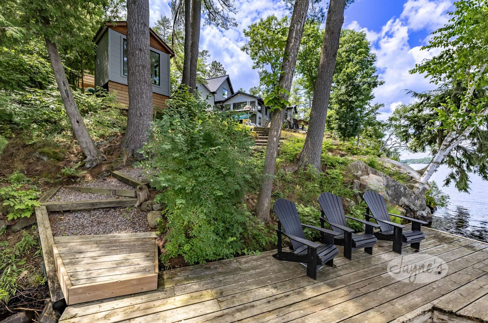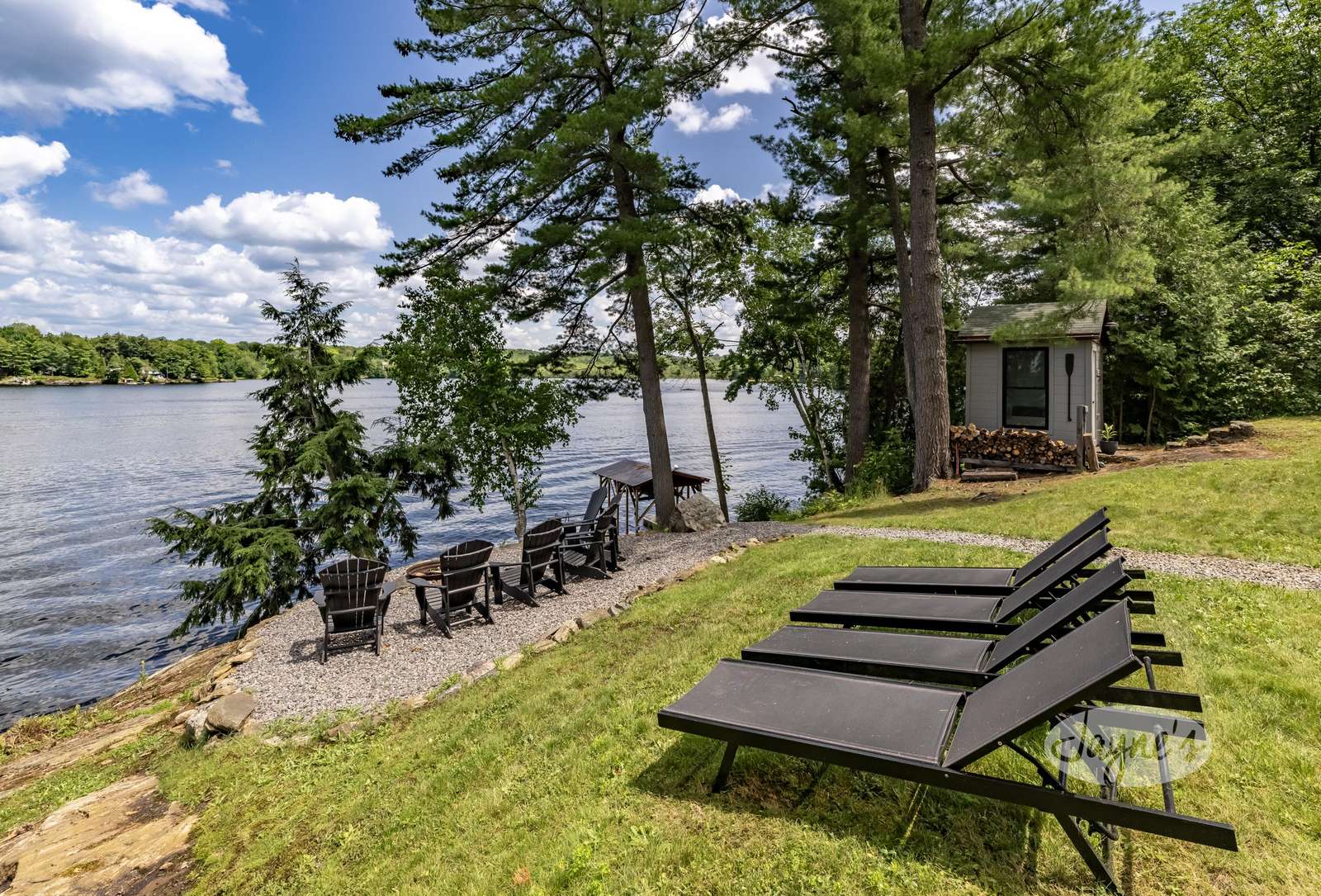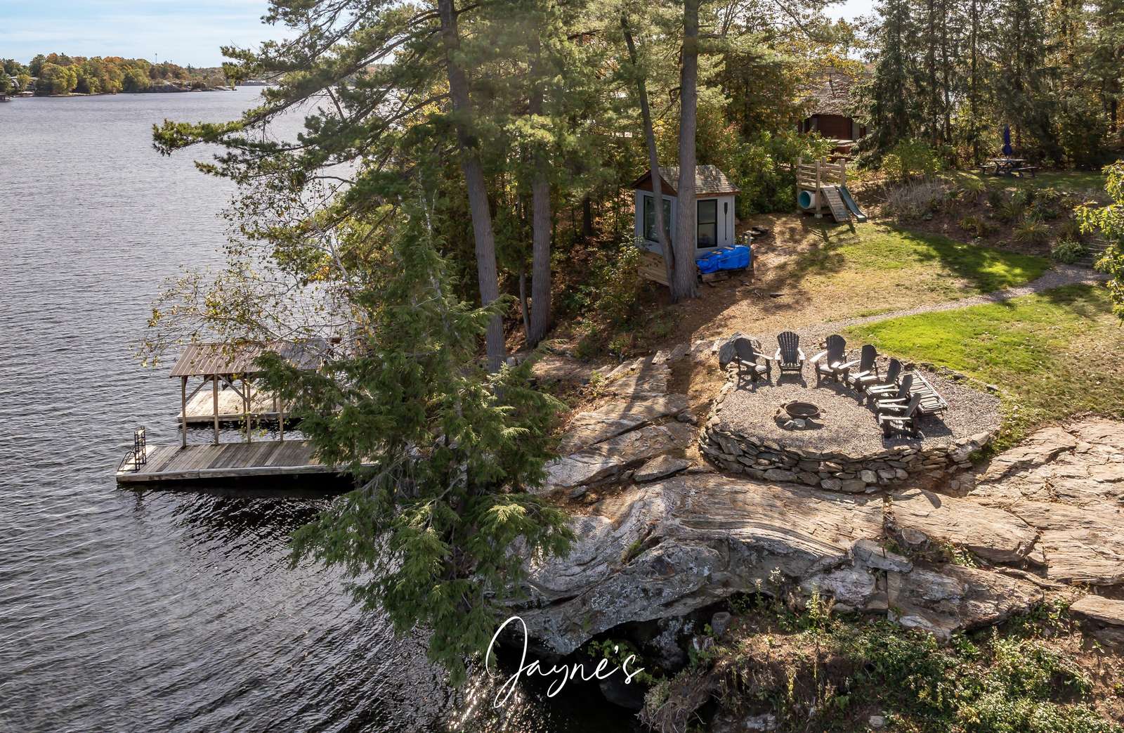 PARKERS POINT rests on a stunning property at the end of a peninsula on the south west side of Lake Muskoka. With water surrounding the point on three sides, Parkers Point provides renters with an authentic Muskoka experience! With multiple outdoor seating areas, there are many vantage points to take in the views while supervising the children. The deck is located right off of the great room and features 4 high-top Muskoka chairs with a matching round table. A propane BBQ and 2 additional Muskoka chairs sit on opposite ends of the deck, making this the perfect place to entertain! The deck leads you towards level grassy land that gently slopes towards the waterfront. The grassy lawns and 148 feet of frontage makes this destination a wonderful place for families of all ages. On your way to the water, you will notice a beautiful Muskoka-esque rock face that is level to the land. Beside the rock sits the fire pit with 5 Muskoka chairs looking out into the surrounding bay. The winterized bunkie and children's play-set sits not far away. A naturally designed stone walkway brings you down towards the timber frame boathouse with docks on either side. 2 Muskoka chairs sit beside the open-concept boathouse that offers 1-slip for boat docking.