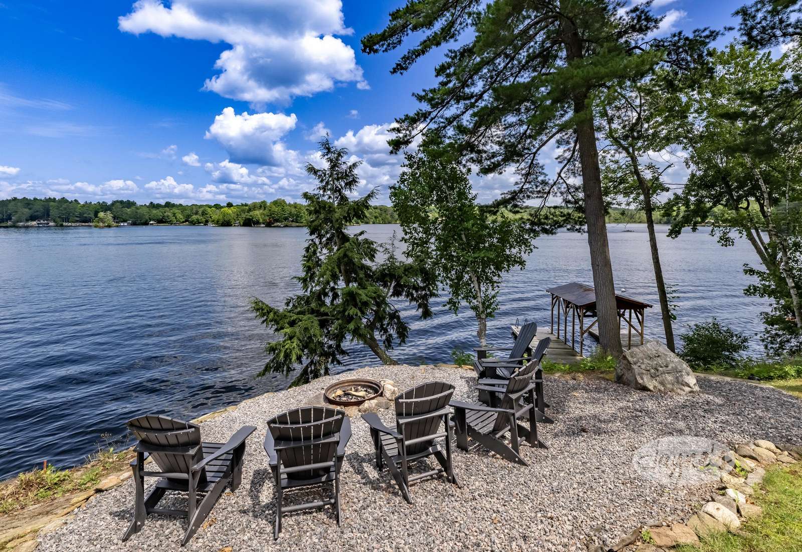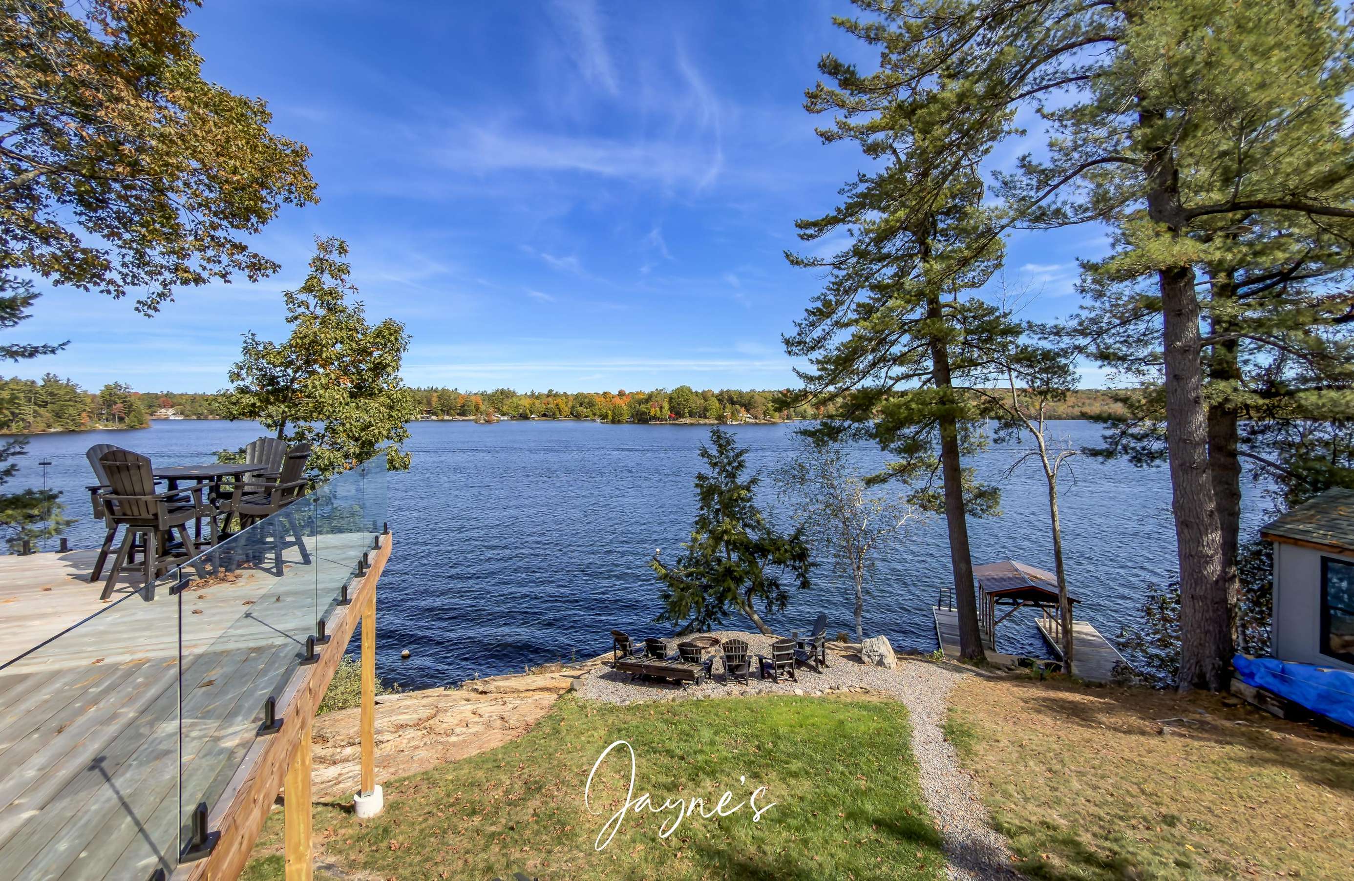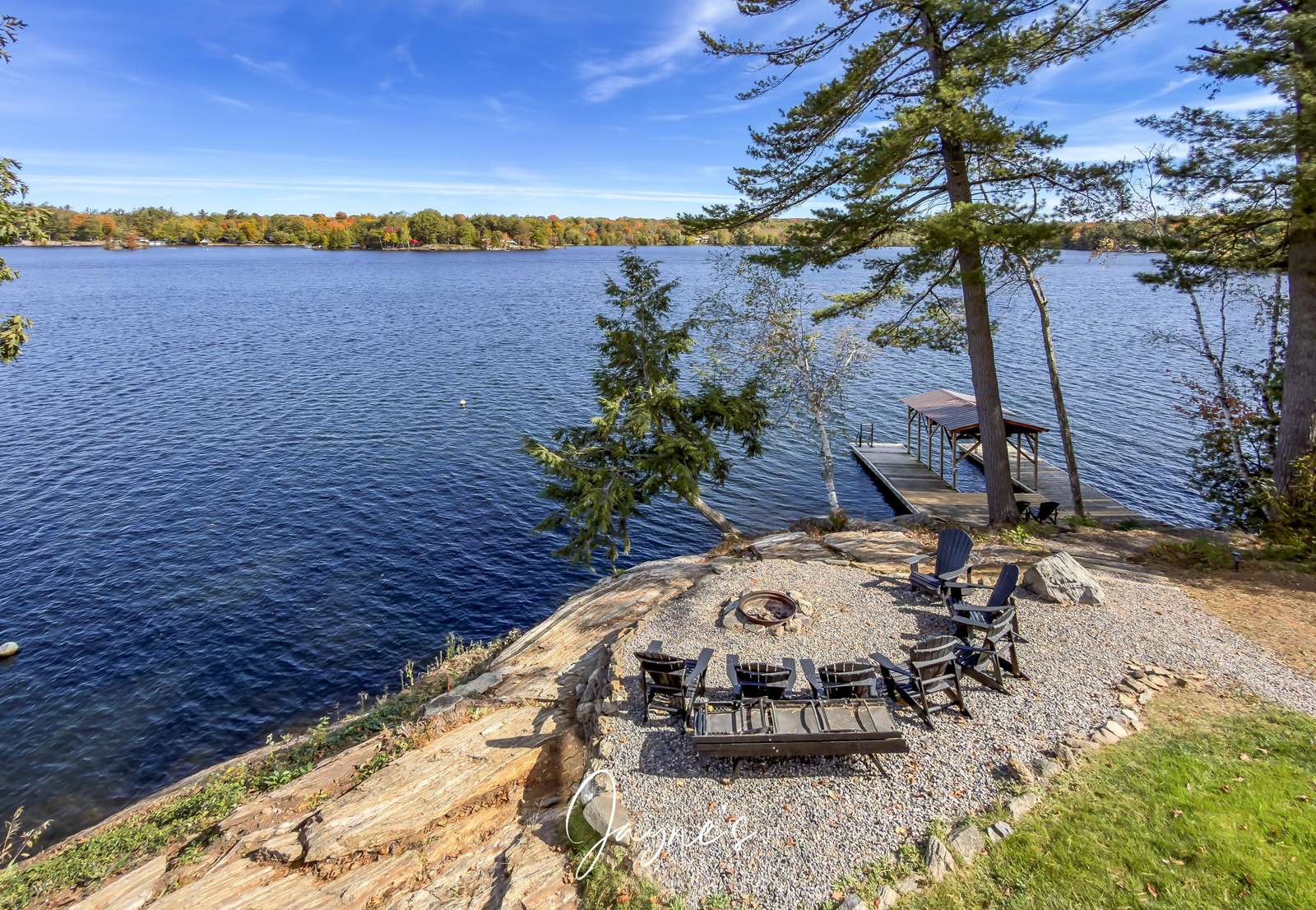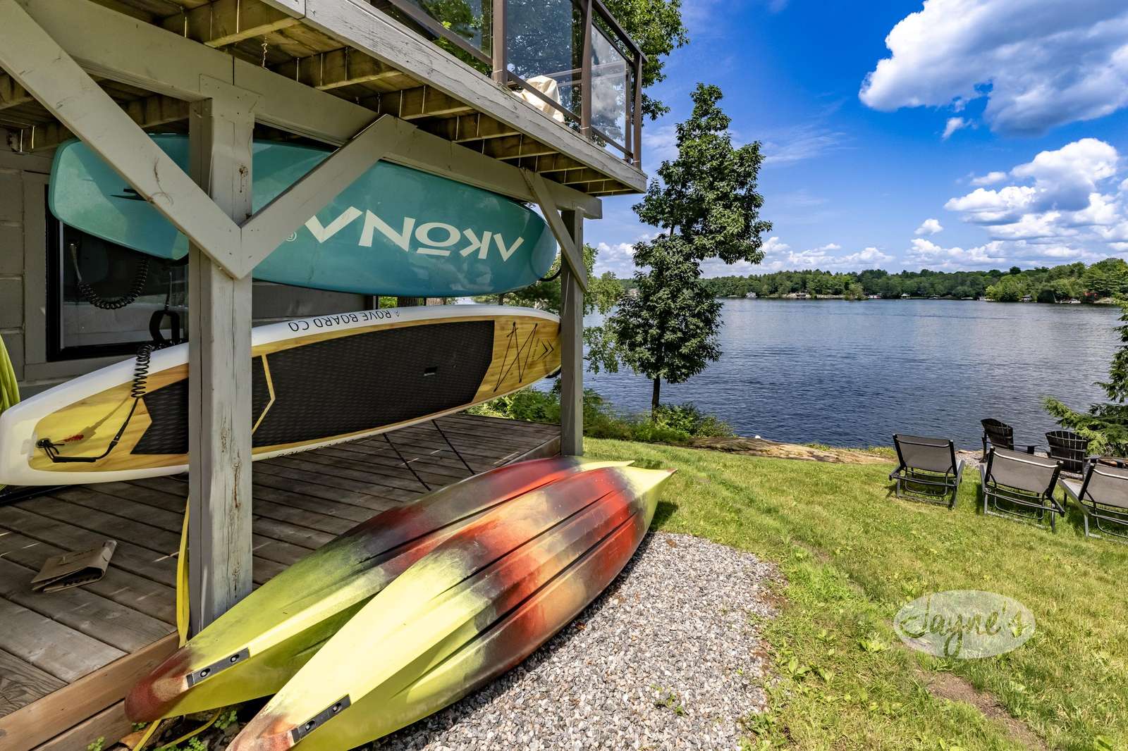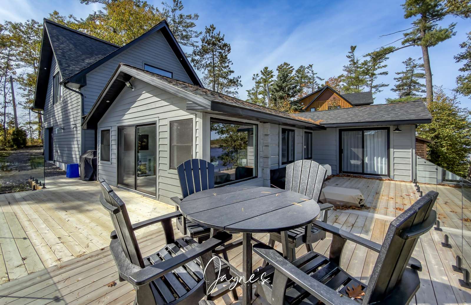 PARKERS POINT rests on a stunning property at the end of a peninsula on the south west side of Lake Muskoka. With water surrounding the point on three sides, Parkers Point provides renters with an authentic Muskoka experience! With multiple outdoor seating areas, there are many vantage points to take in the views while supervising the children. The deck is located right off of the great room and features 4 high-top Muskoka chairs with a matching round table. A propane BBQ and 2 additional Muskoka chairs sit on opposite ends of the deck, making this the perfect place to entertain! The deck leads you towards level grassy land that gently slopes towards the waterfront. The grassy lawns and 148 feet of frontage makes this destination a wonderful place for families of all ages. On your way to the water, you will notice a beautiful Muskoka-esque rock face that is level to the land. Beside the rock sits the fire pit with 5 Muskoka chairs looking out into the surrounding bay. The winterized bunkie and children's play-set sits not far away. A naturally designed stone walkway brings you down towards the timber frame boathouse with docks on either side. 2 Muskoka chairs sit beside the open-concept boathouse that offers 1-slip for boat docking.