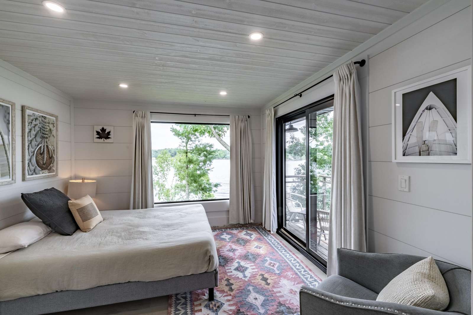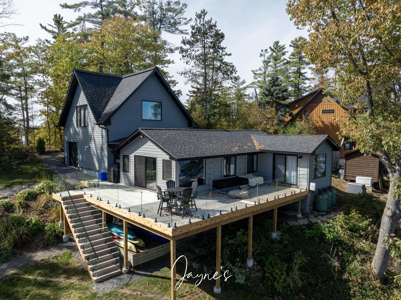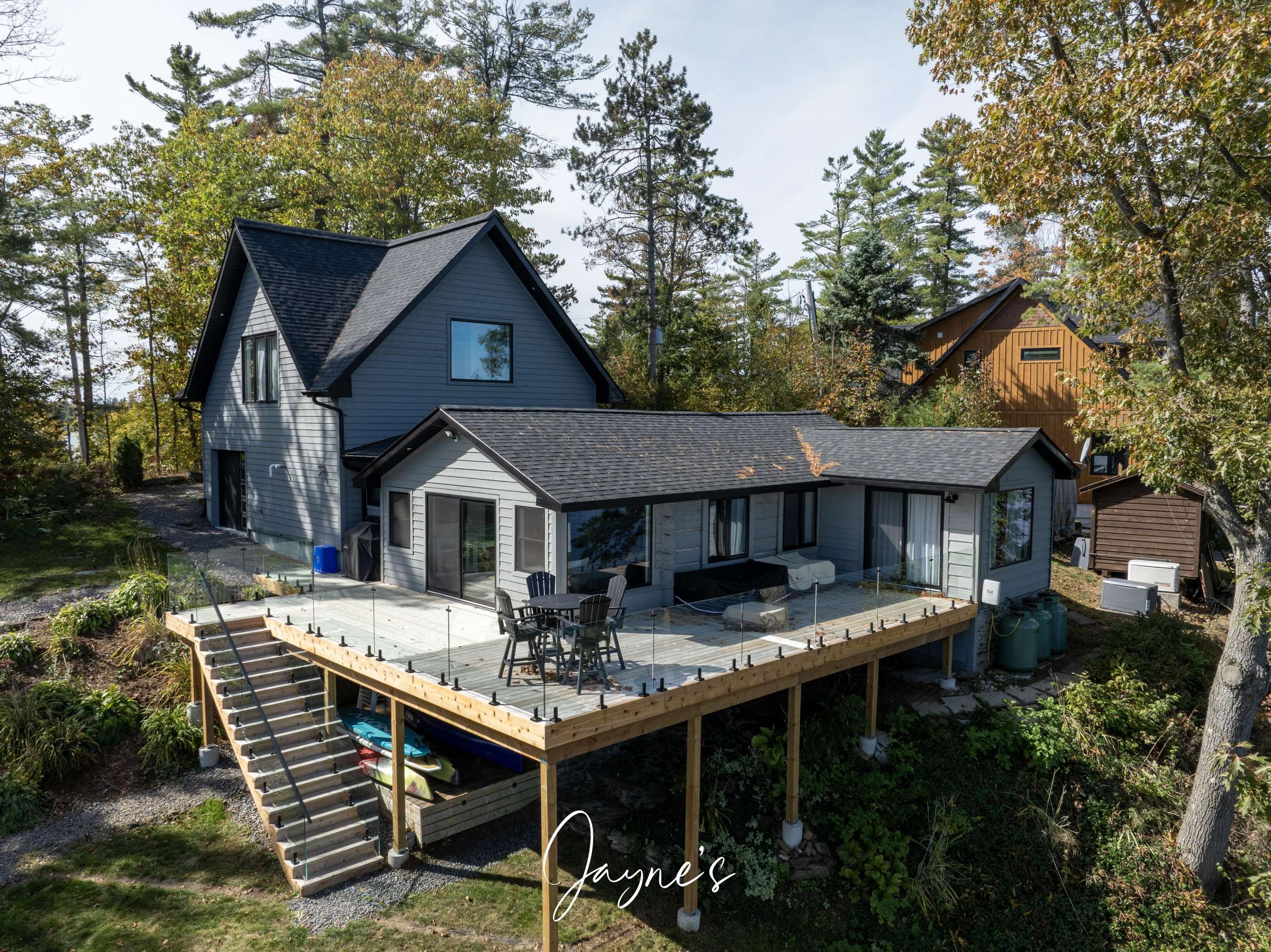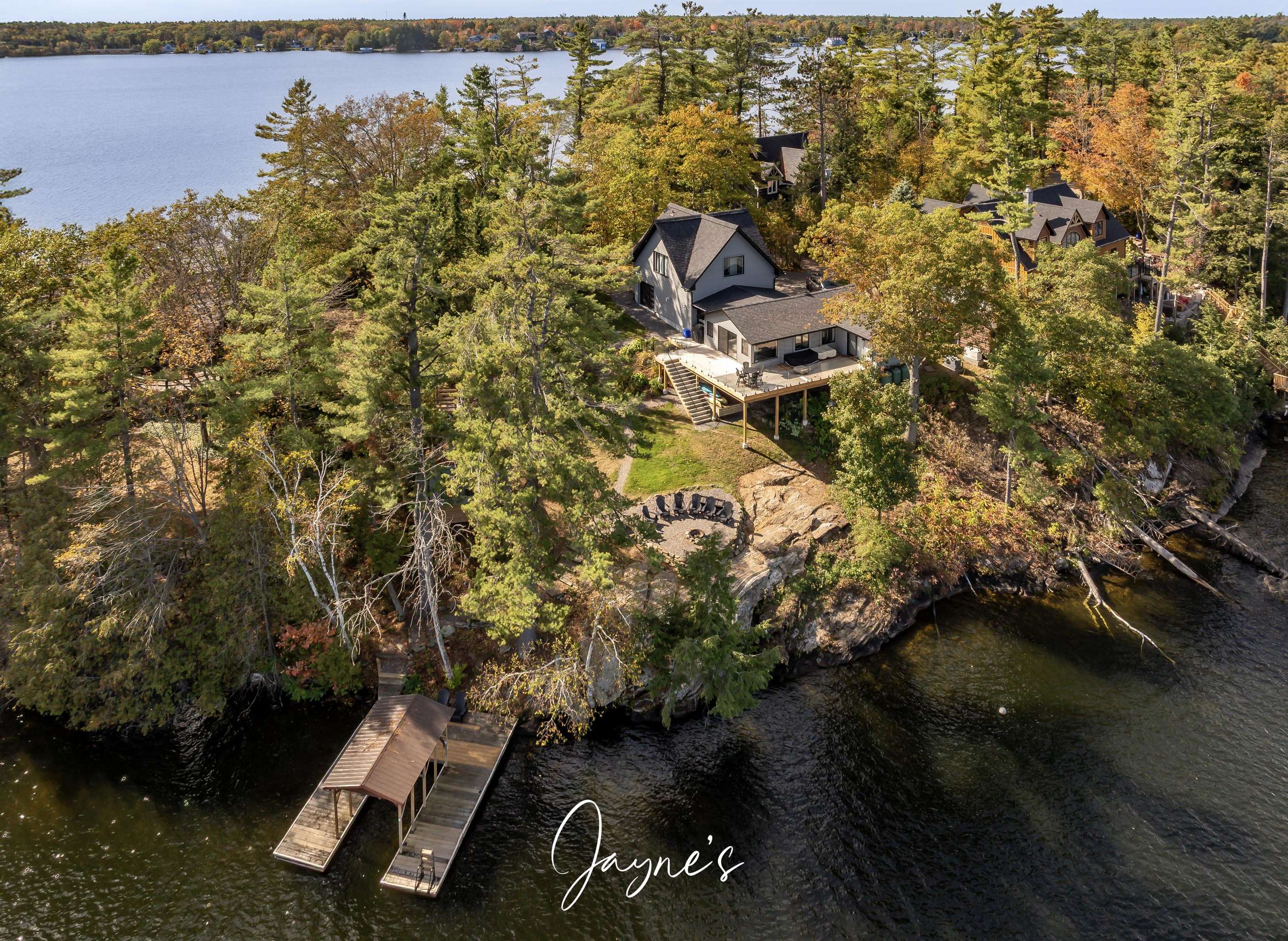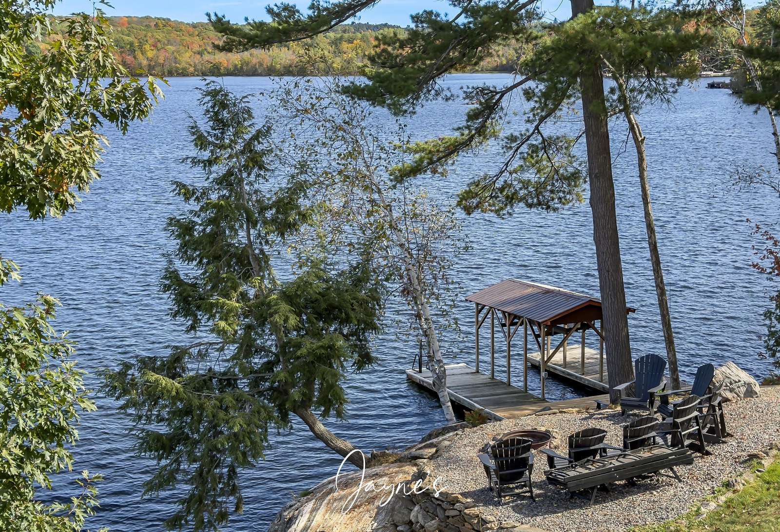 PARKERS POINT rests on a stunning property at the end of a peninsula on the south west side of Lake Muskoka. With water surrounding the point on three sides, Parkers Point provides renters with an authentic Muskoka experience! With multiple outdoor seating areas, there are many vantage points to take in the views while supervising the children. The deck is located right off of the great room and features 4 high-top Muskoka chairs with a matching round table. A propane BBQ and 2 additional Muskoka chairs sit on opposite ends of the deck, making this the perfect place to entertain! The deck leads you towards level grassy land that gently slopes towards the waterfront. The grassy lawns and 148 feet of frontage makes this destination a wonderful place for families of all ages. On your way to the water, you will notice a beautiful Muskoka-esque rock face that is level to the land. Beside the rock sits the fire pit with 5 Muskoka chairs looking out into the surrounding bay. The winterized bunkie and children's play-set sits not far away. A naturally designed stone walkway brings you down towards the timber frame boathouse with docks on either side. 2 Muskoka chairs sit beside the open-concept boathouse that offers 1-slip for boat docking.
