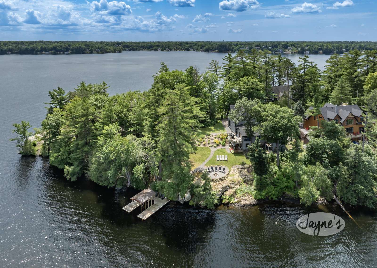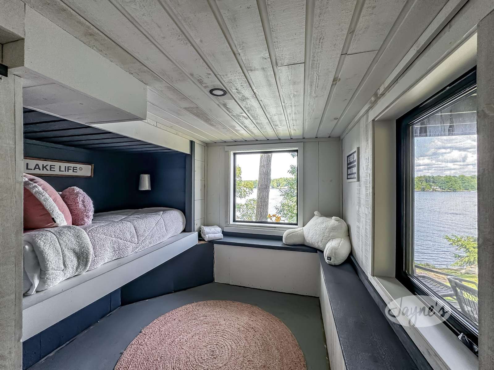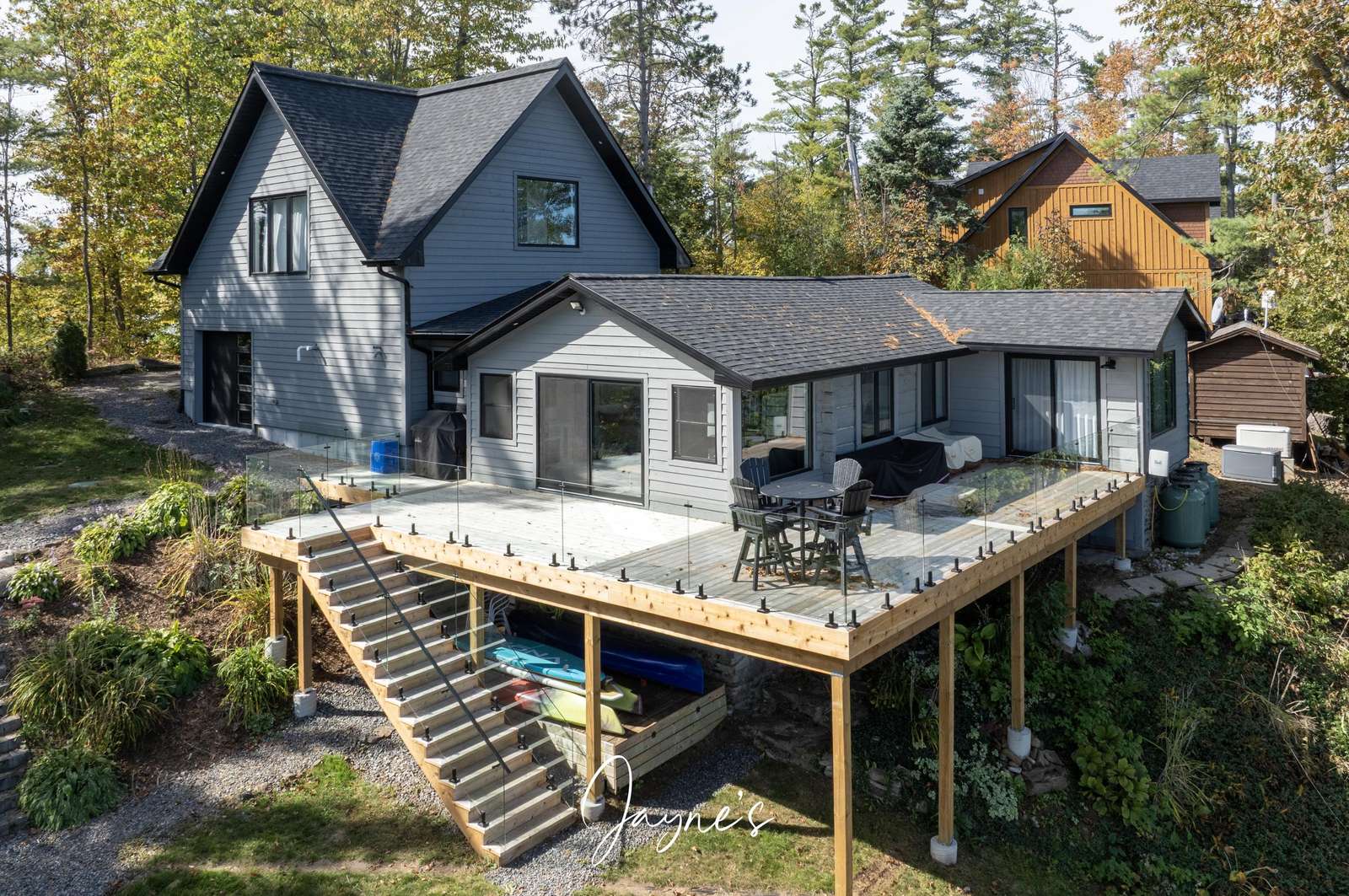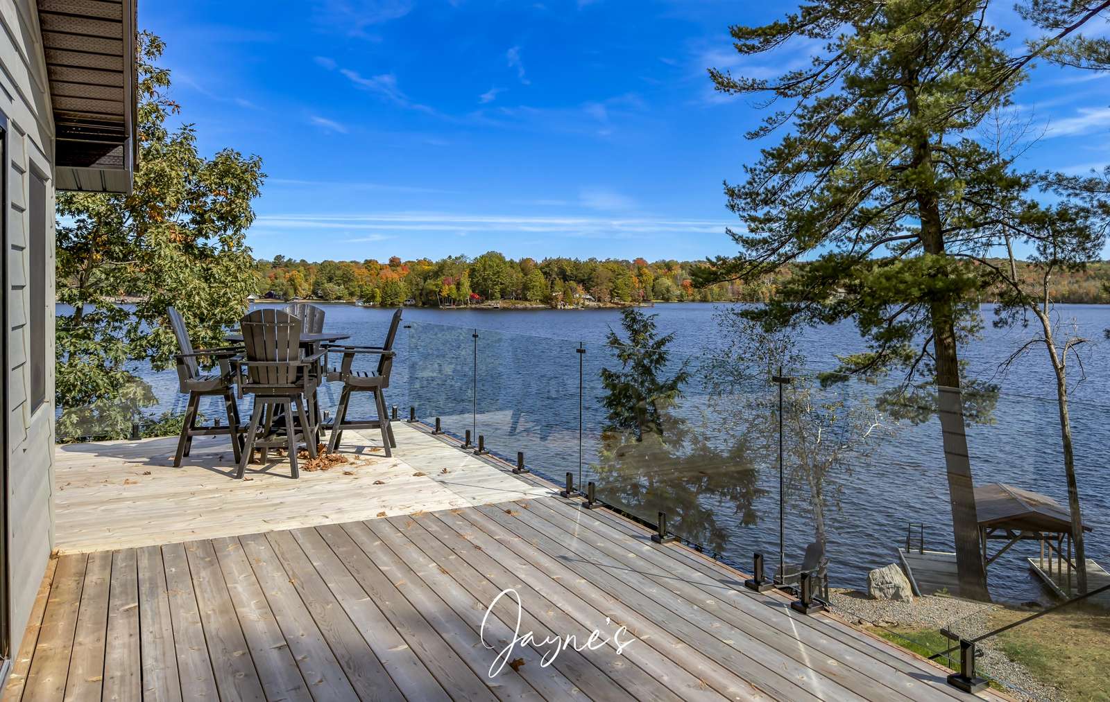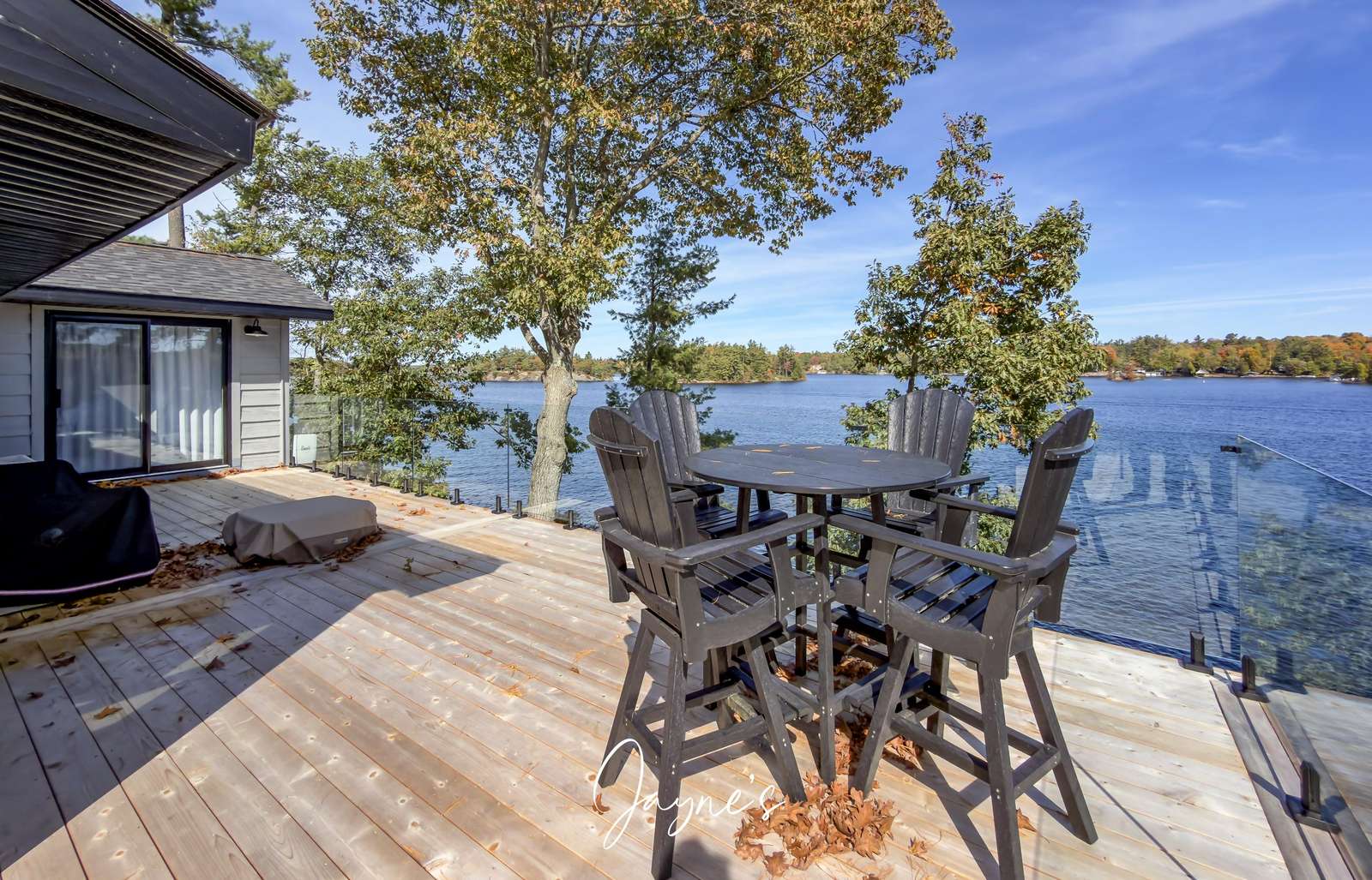PARKERS POINT rests on a stunning property at the end of a peninsula on the south west side of Lake Muskoka. With water surrounding the point on three sides, Parkers Point provides renters with an authentic Muskoka experience! With multiple outdoor seating areas, there are many vantage points to take in the views while supervising the children. The deck is located right off of the great room and features 4 high-top Muskoka chairs with a matching round table. A propane BBQ and 2 additional Muskoka chairs sit on opposite ends of the deck, making this the perfect place to entertain! The deck leads you towards level grassy land that gently slopes towards the waterfront. The grassy lawns and 148 feet of frontage makes this destination a wonderful place for families of all ages. On your way to the water, you will notice a beautiful Muskoka-esque rock face that is level to the land. Beside the rock sits the fire pit with 5 Muskoka chairs looking out into the surrounding bay. The winterized bunkie and children's play-set sits not far away. A naturally designed stone walkway brings you down towards the timber frame boathouse with docks on either side. 2 Muskoka chairs sit beside the open-concept boathouse that offers 1-slip for boat docking.