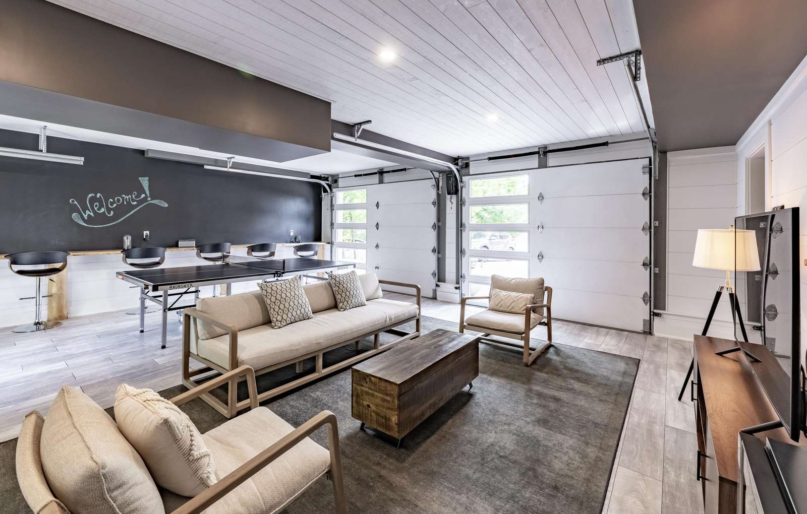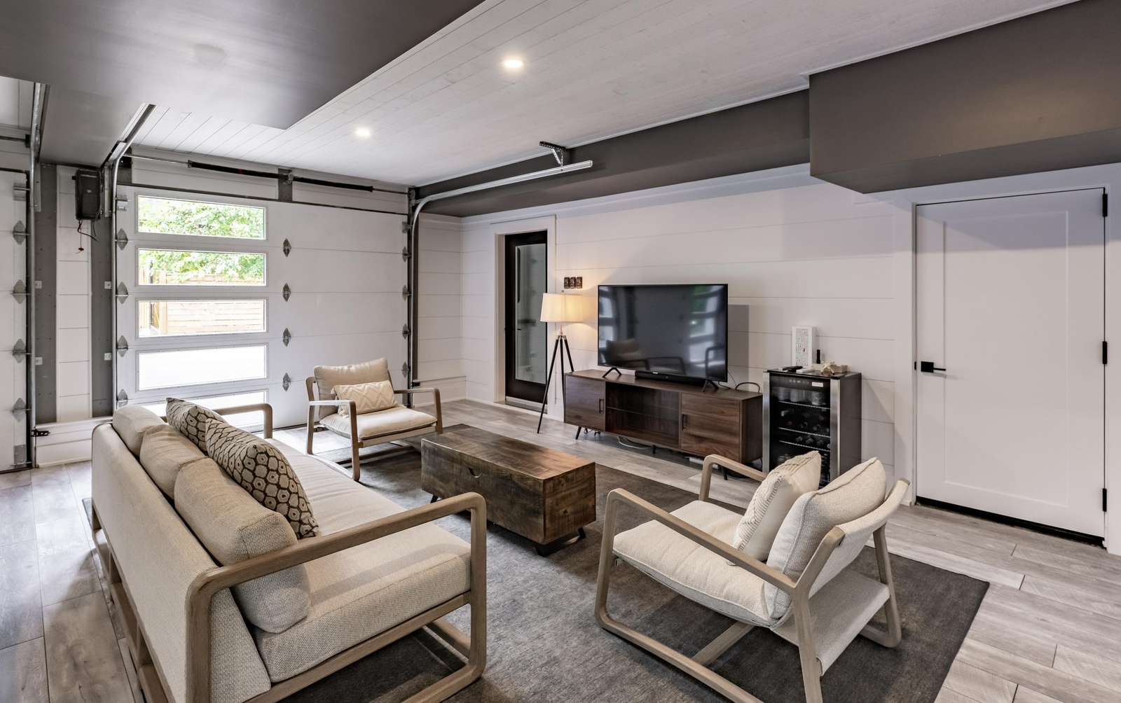The great room is furnished with a couch, 2 wing chairs and a flat screen TV.