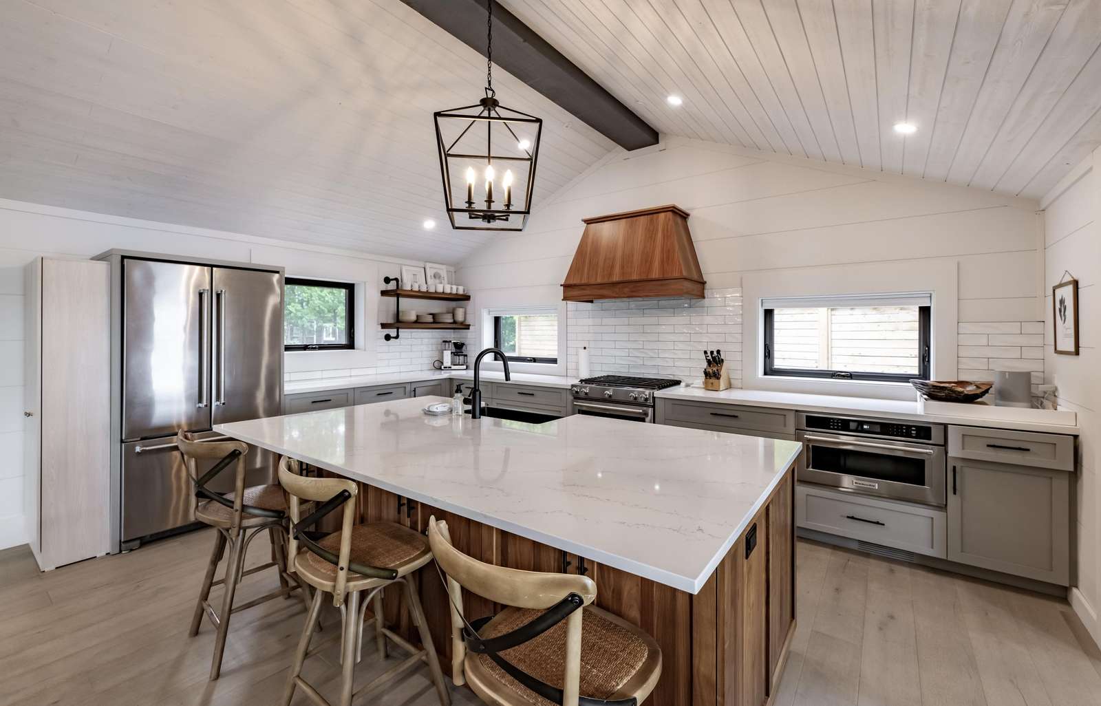 The open-concept kitchen features wrap-around countertops, high-end appliances and a spacious island with seating for 3.