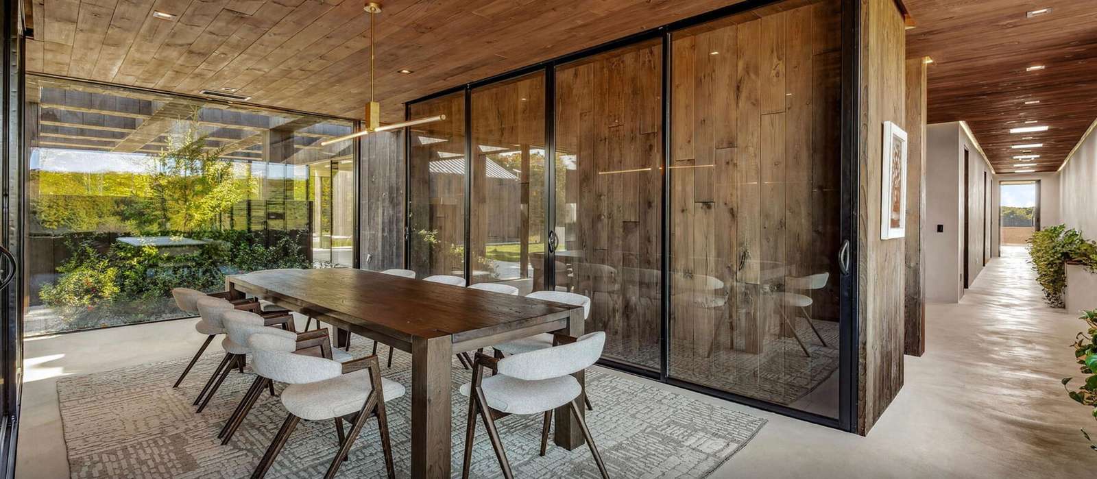 Seating for 10 with floor to ceiling windows on each end and elegant wine cabinets on each side.