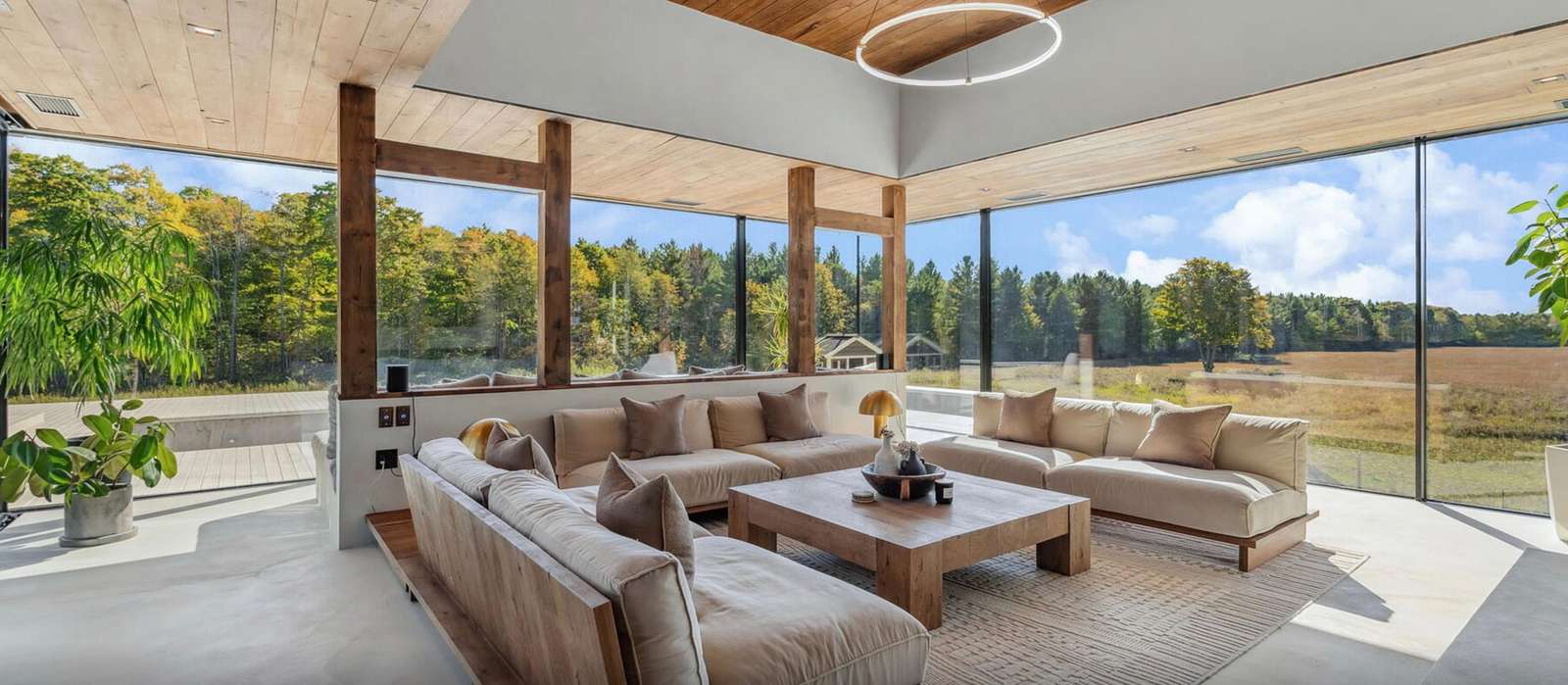 This private sanctuary with hiking trails and 2 ponds is surrounded by managed forests and open fields. The outdoor living space includes patios, multiple seating areas, an outdoor kitchen featuring a pizza oven and wood burning barbeque, large T-shaped pool, oversized built-in hot tub and a level grassy area perfect for lawn games. The pool and hot tub are available in all seasons, with the pool becoming a cold plunge in the winter months.