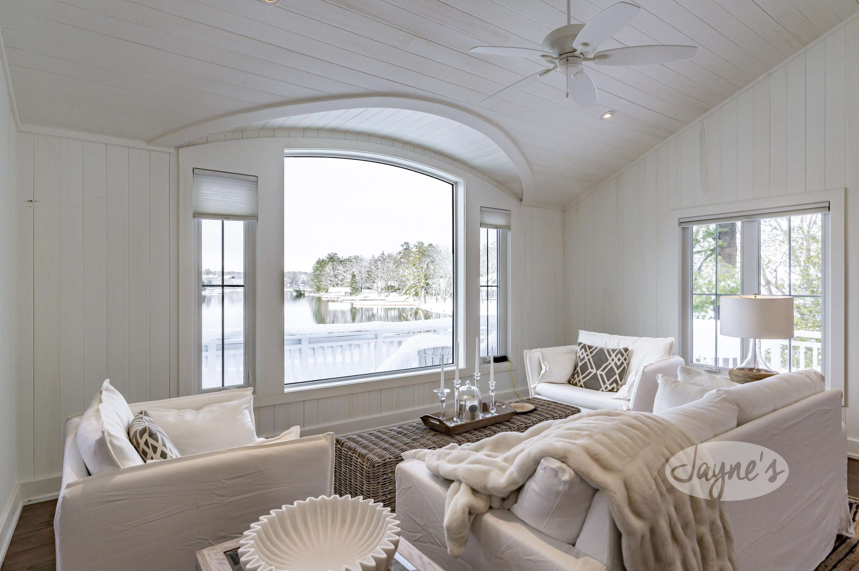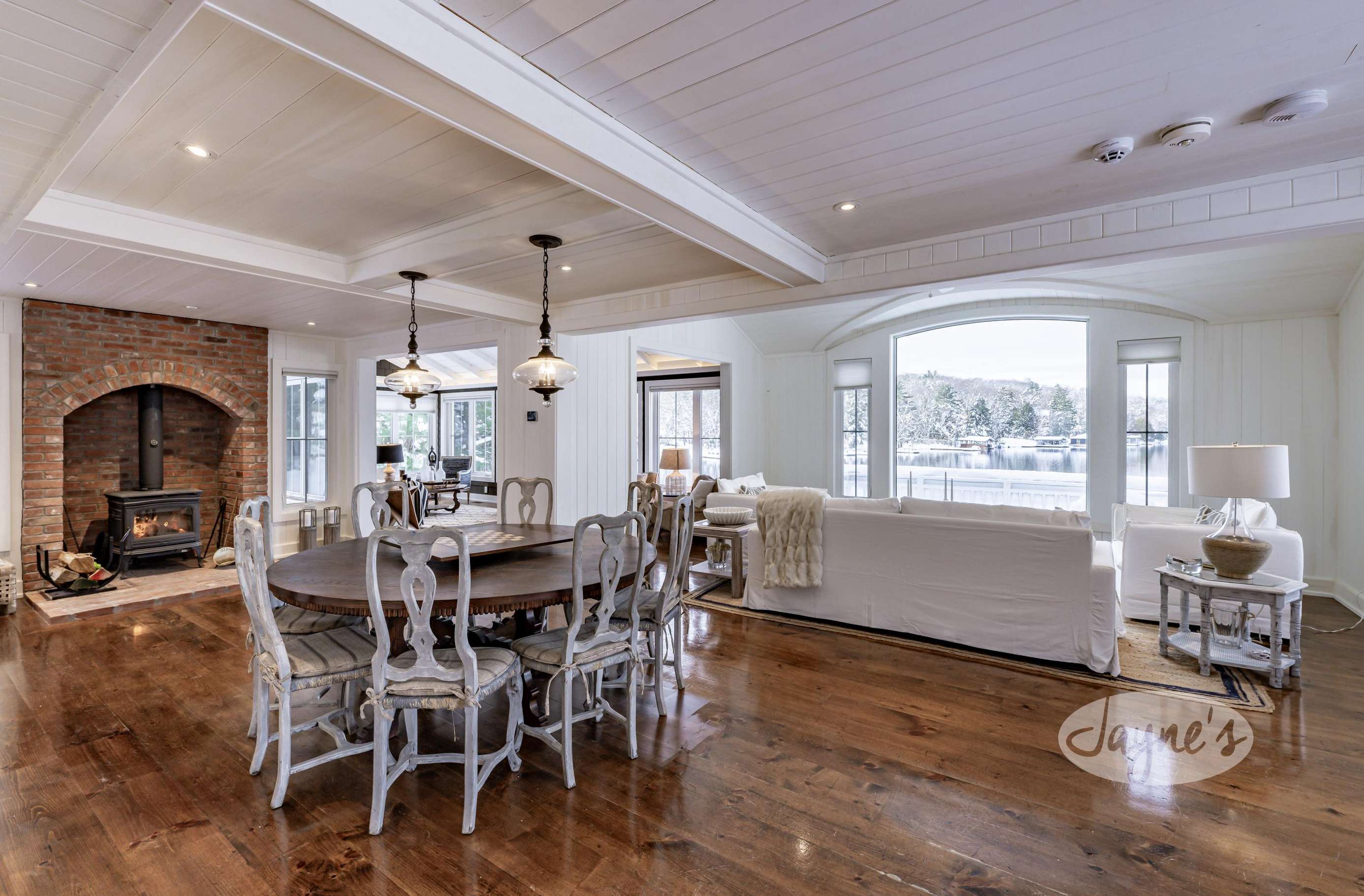 Spacious well lit room with sectional sofa, gas stove, 65' TV and walkout to the water