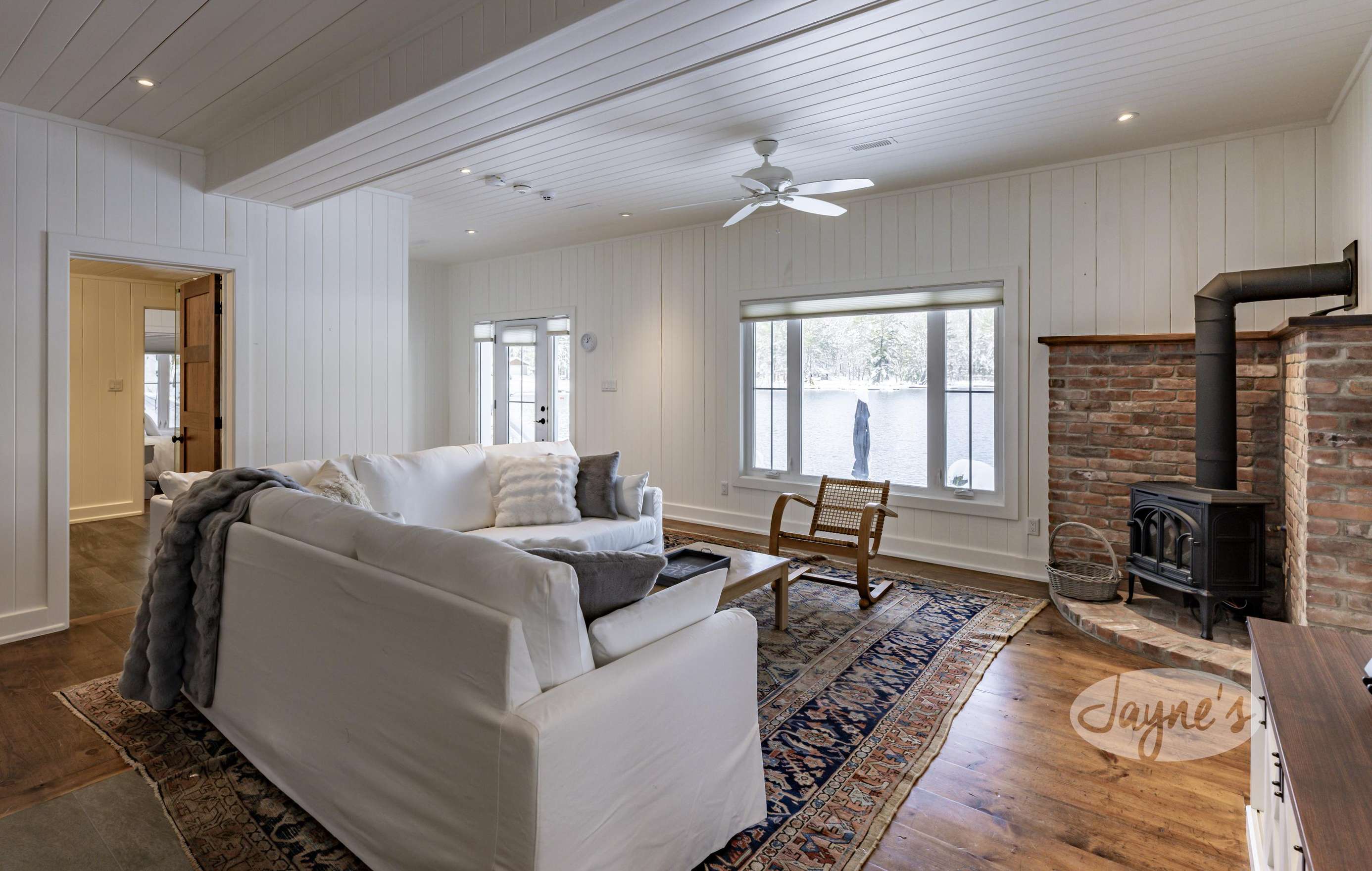 Spacious open concept with a wood burning stove, 3 seater sofa and two chairs