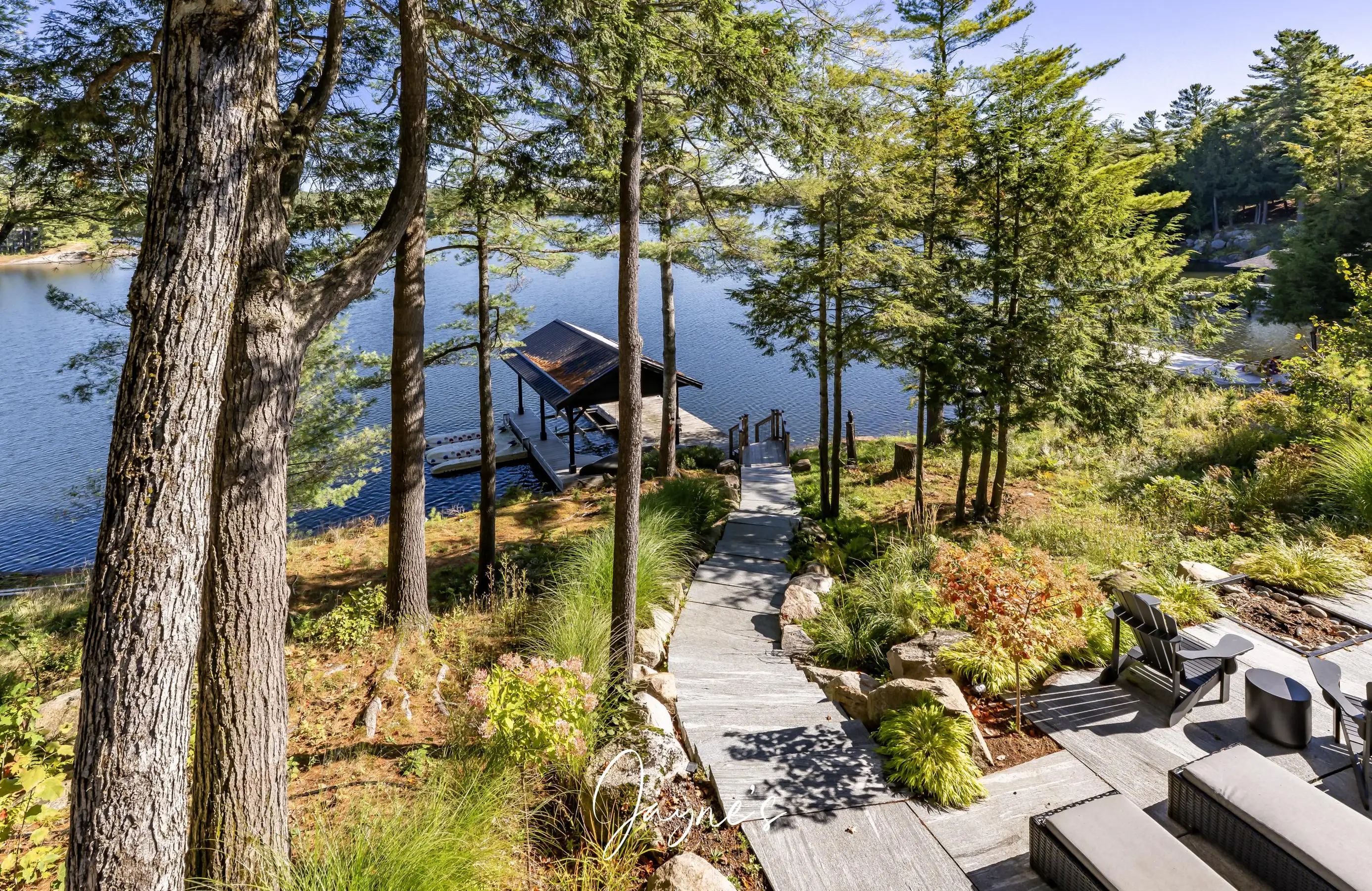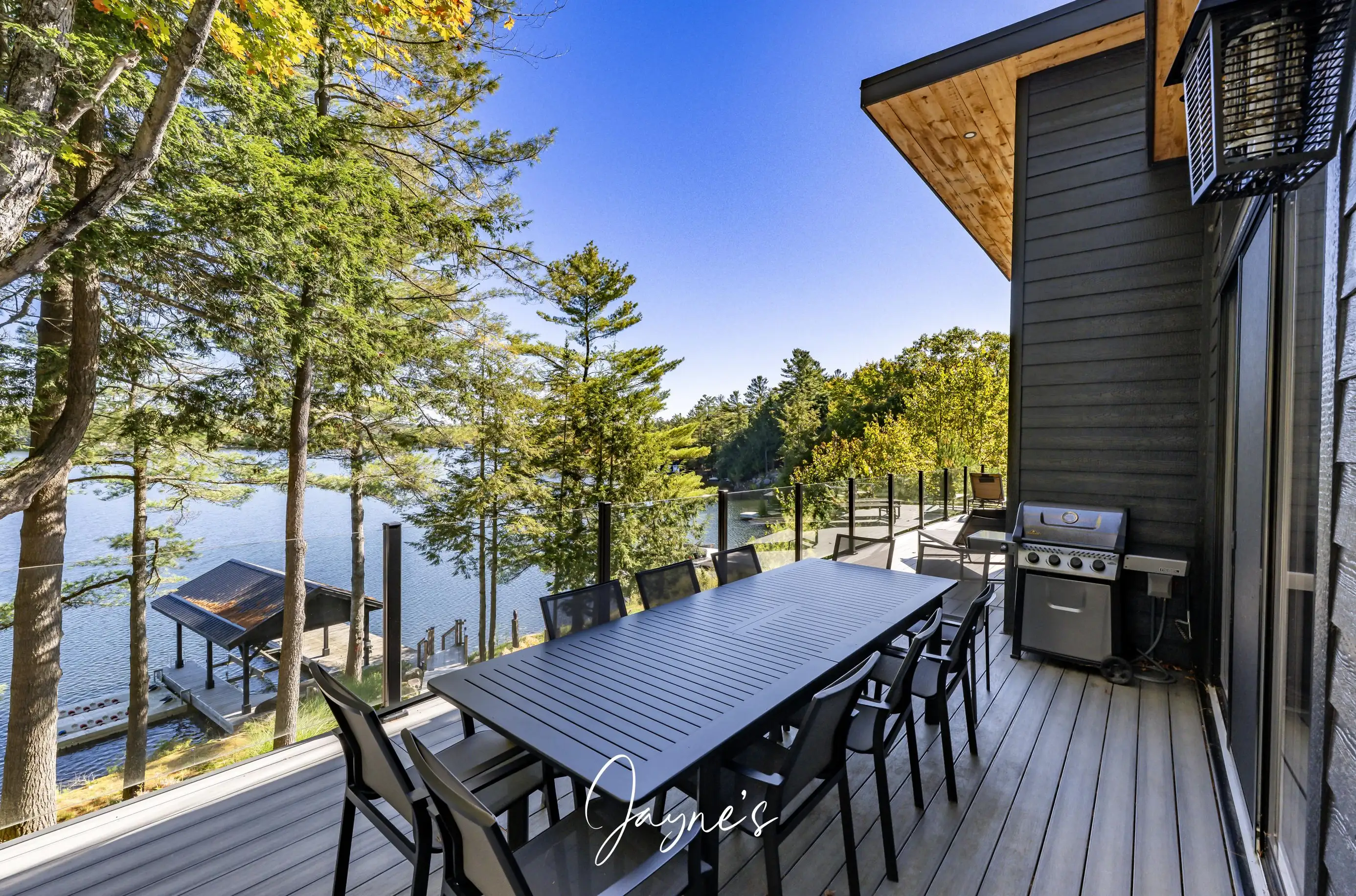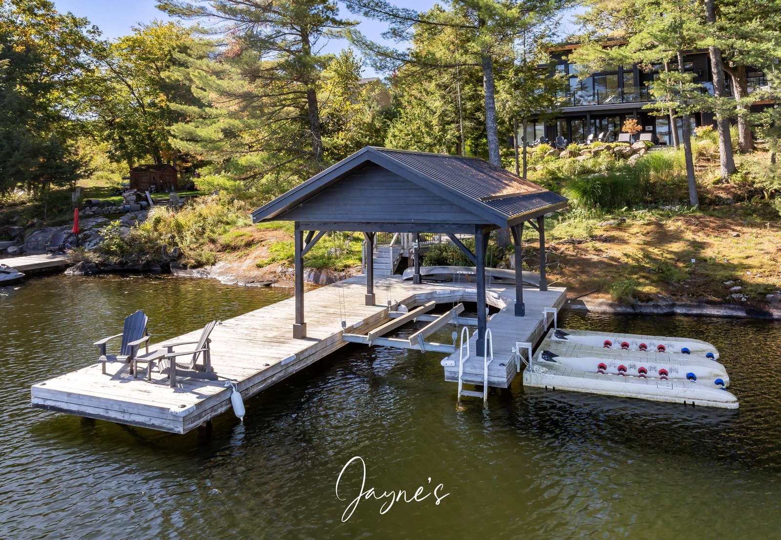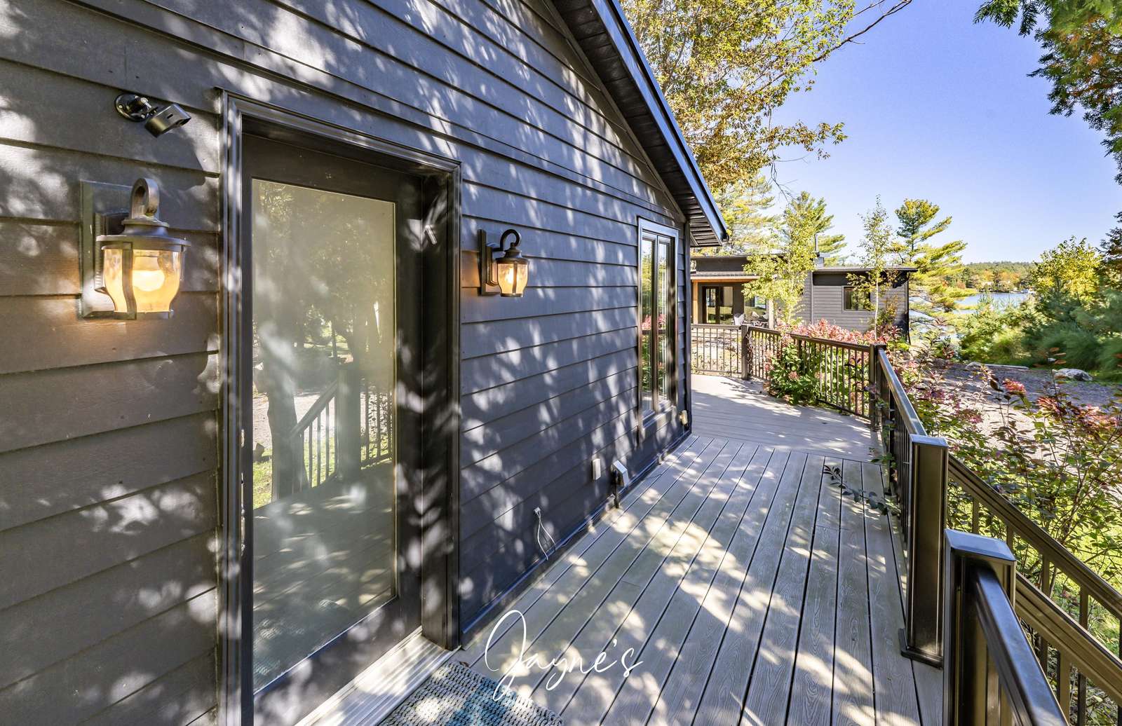 PENNEY FOR YOUR THOUGHTS - This gorgeous lakeside cottage provides a perfect blend of modern elegance and comfort, featuring spacious living areas, a well-equipped kitchen for large gatherings, and a cozy screened Muskoka room for relaxing. The expansive deck with outdoor seating, BBQ, and stunning views enhances outdoor entertaining, while the lower level offers a variety of indoor and outdoor games. The beautifully landscaped granite patio with a firepit creates a inviting outdoor space that leads to the lake, where you can enjoy serene views from the dock and benefit from a covered boat slip for easy access to water activities.