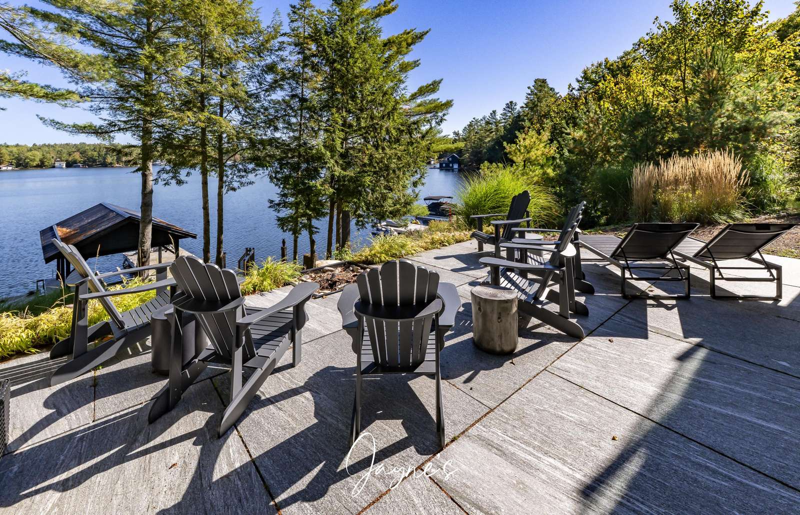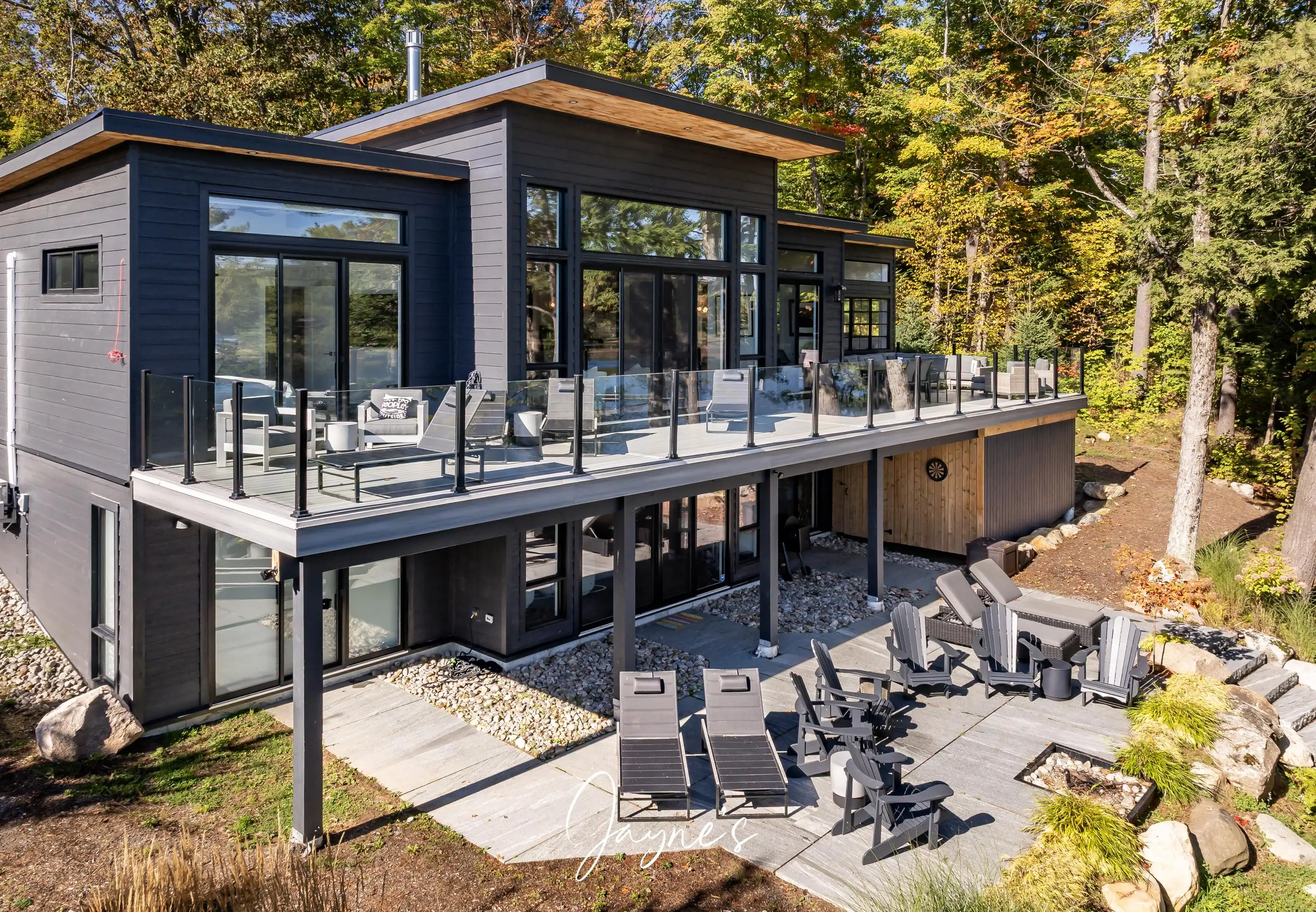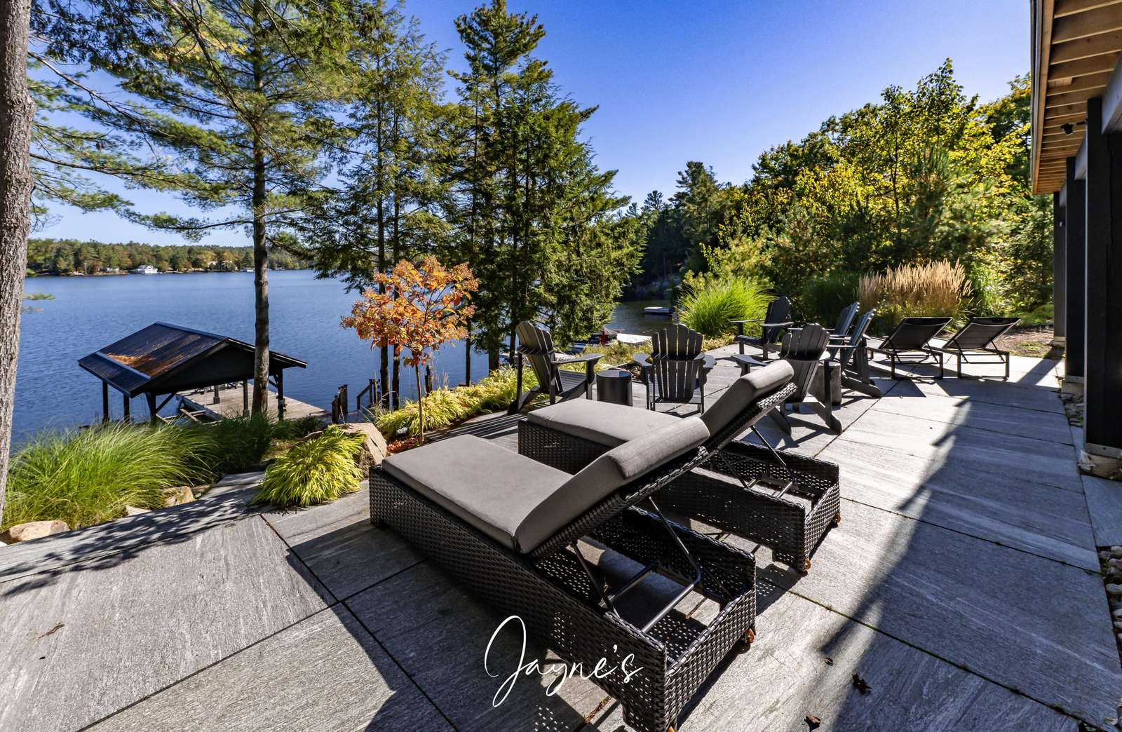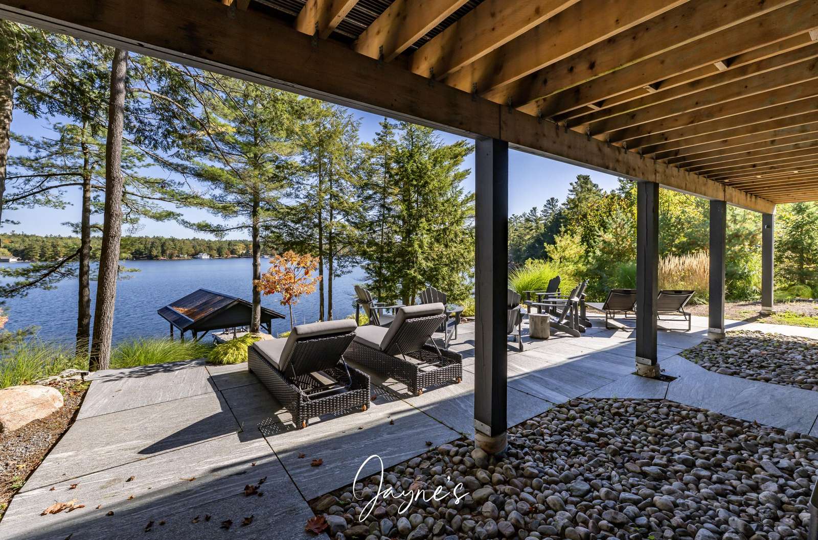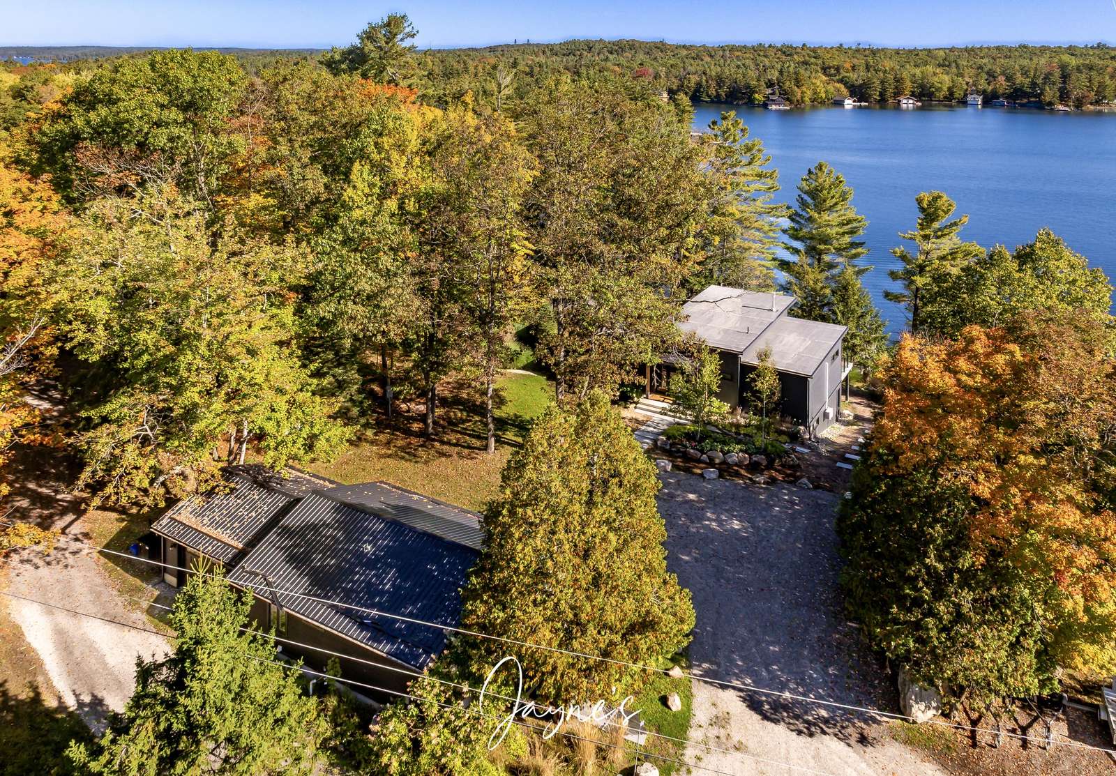 PENNEY FOR YOUR THOUGHTS - This gorgeous lakeside cottage provides a perfect blend of modern elegance and comfort, featuring spacious living areas, a well-equipped kitchen for large gatherings, and a cozy screened Muskoka room for relaxing. The expansive deck with outdoor seating, BBQ, and stunning views enhances outdoor entertaining, while the lower level offers a variety of indoor and outdoor games. The beautifully landscaped granite patio with a firepit creates a inviting outdoor space that leads to the lake, where you can enjoy serene views from the dock and benefit from a covered boat slip for easy access to water activities.