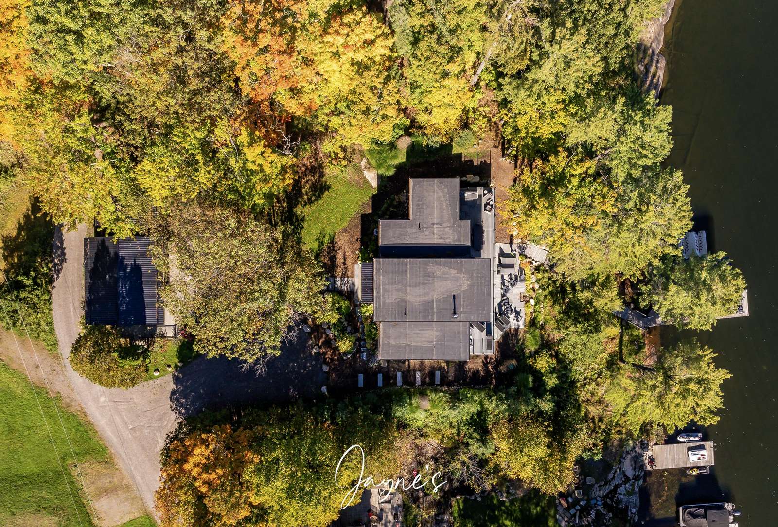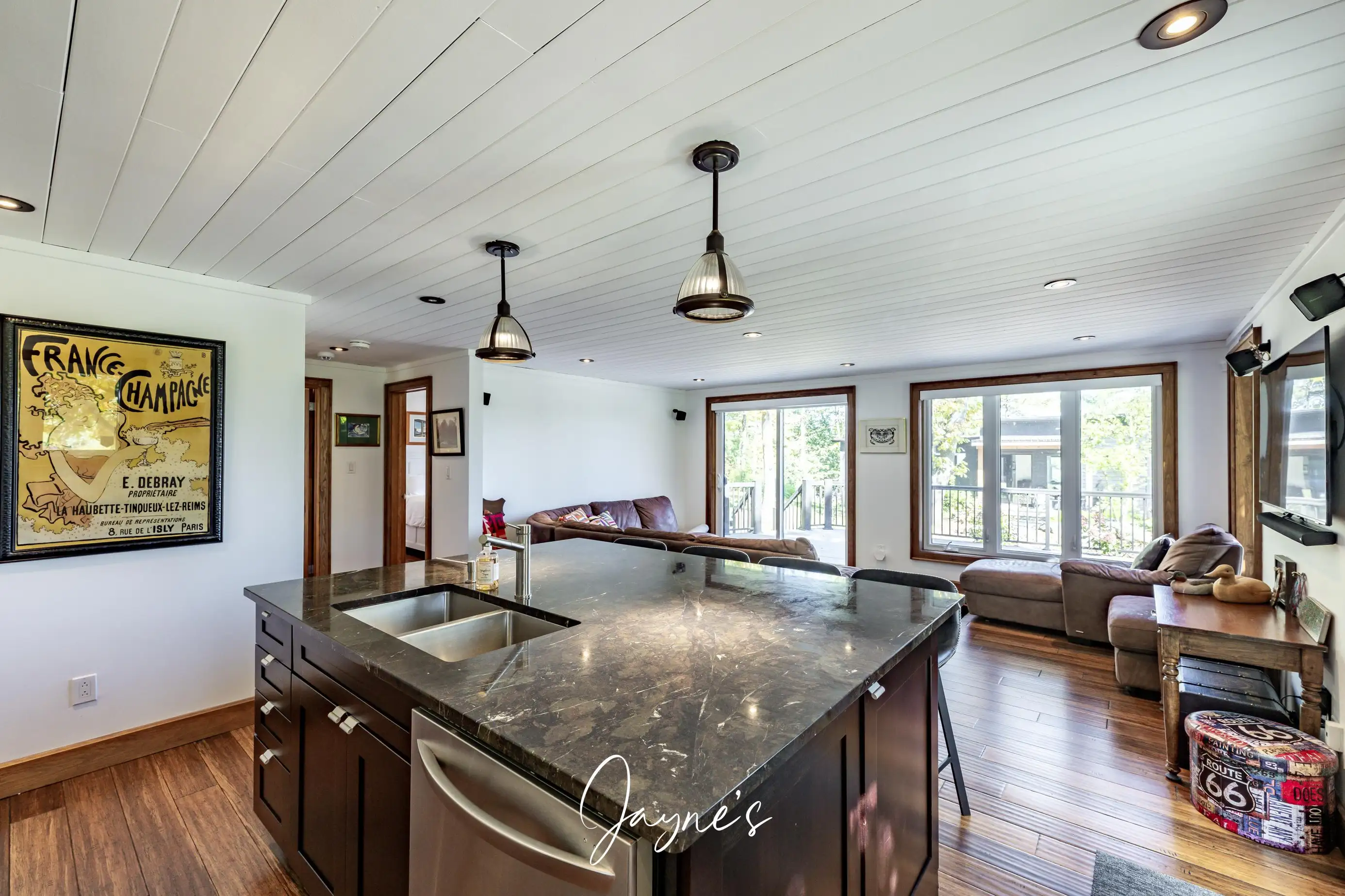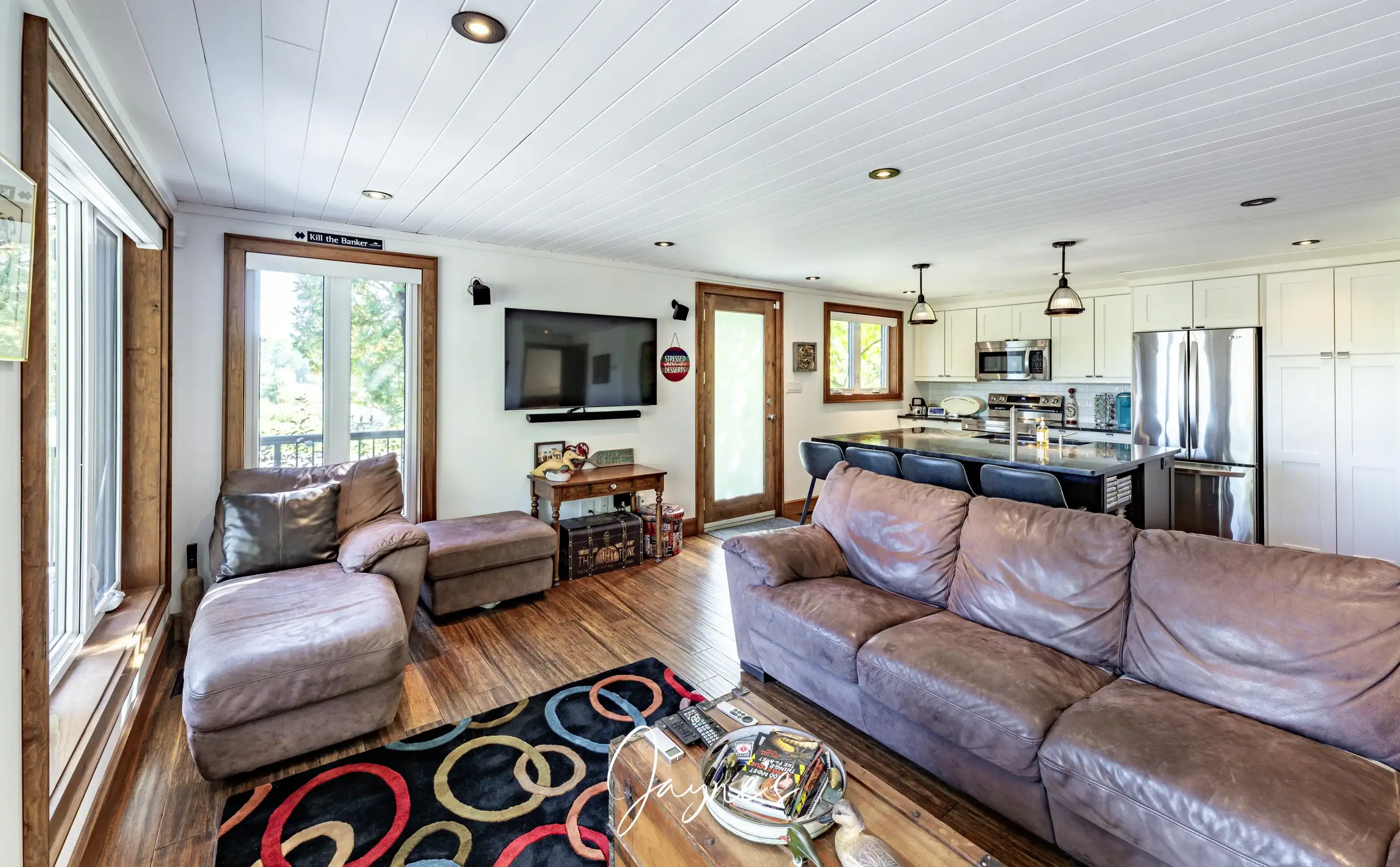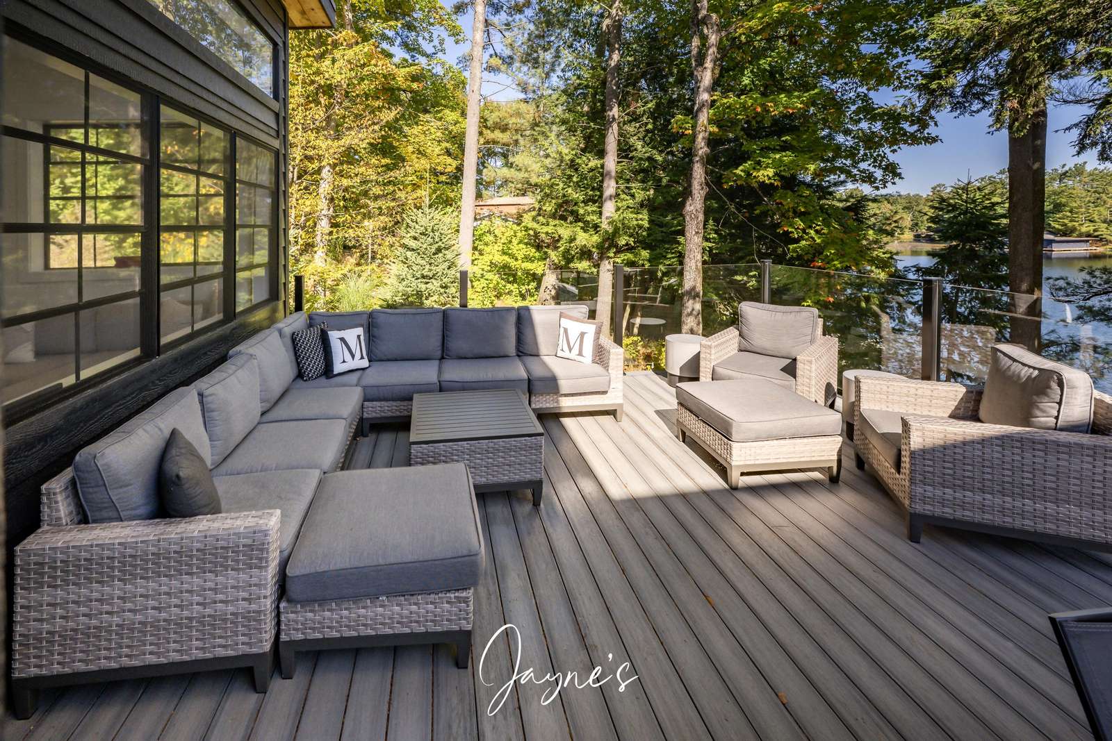 PENNEY FOR YOUR THOUGHTS - This gorgeous lakeside cottage provides a perfect blend of modern elegance and comfort, featuring spacious living areas, a well-equipped kitchen for large gatherings, and a cozy screened Muskoka room for relaxing. The expansive deck with outdoor seating, BBQ, and stunning views enhances outdoor entertaining, while the lower level offers a variety of indoor and outdoor games. The beautifully landscaped granite patio with a firepit creates a inviting outdoor space that leads to the lake, where you can enjoy serene views from the dock and benefit from a covered boat slip for easy access to water activities.