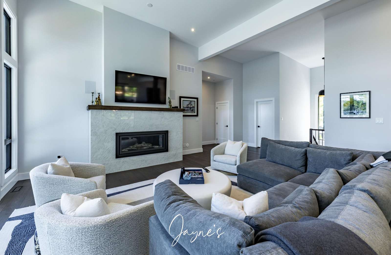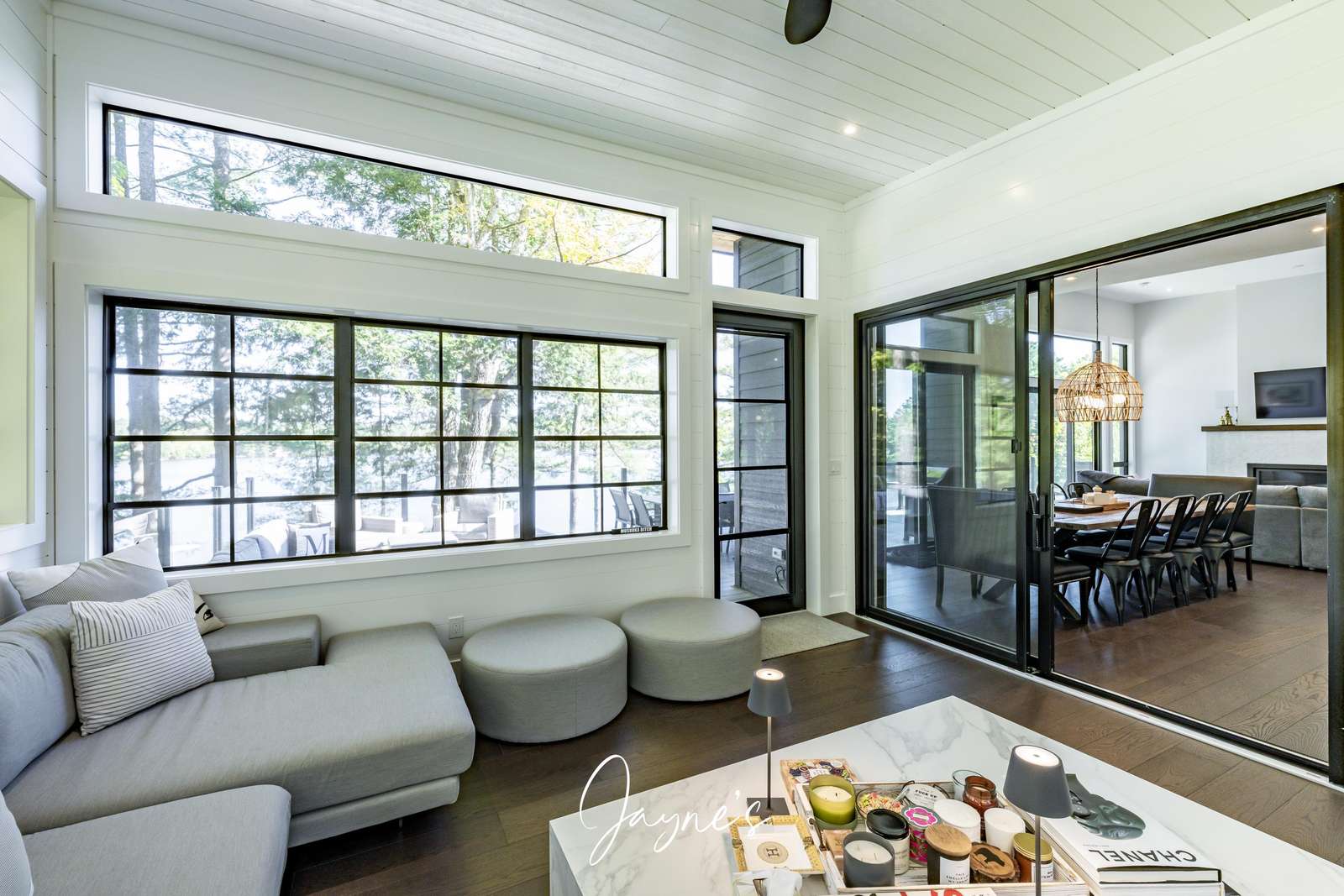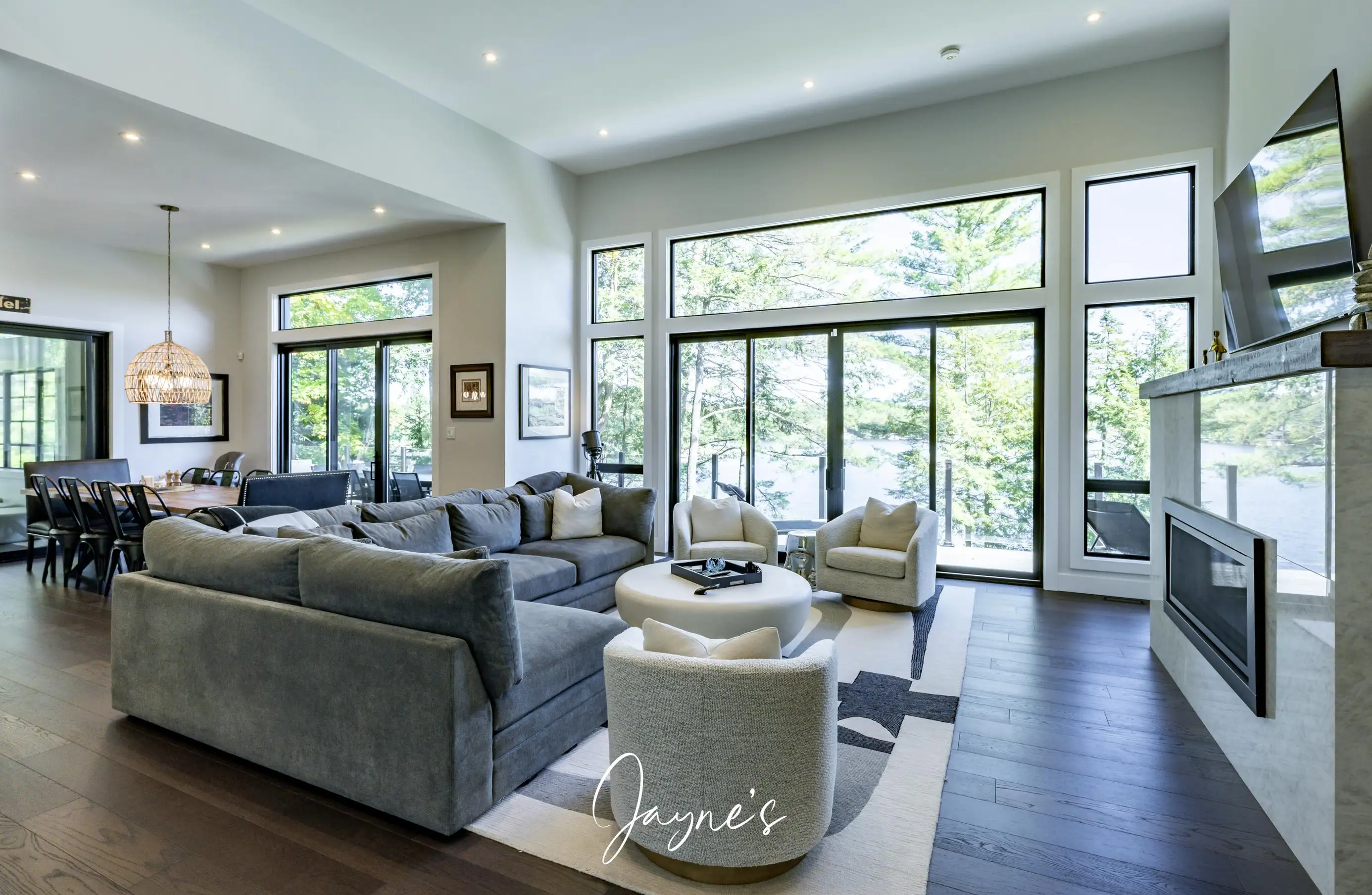 Spacious open concept modern design with floor to ceiling windows, smart TV, gas fireplace, sectional sofa, 3 chairs and walkout to large deck