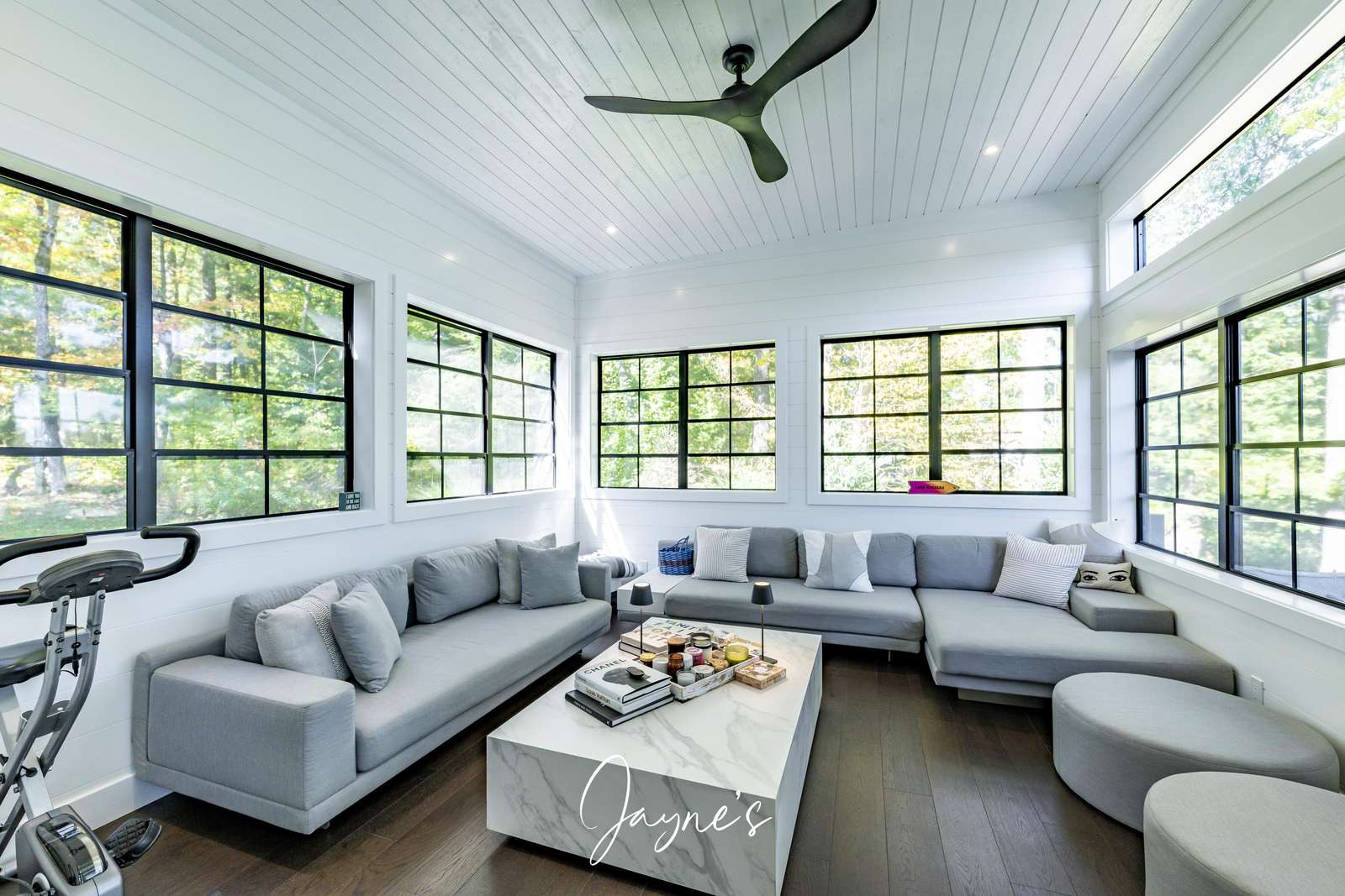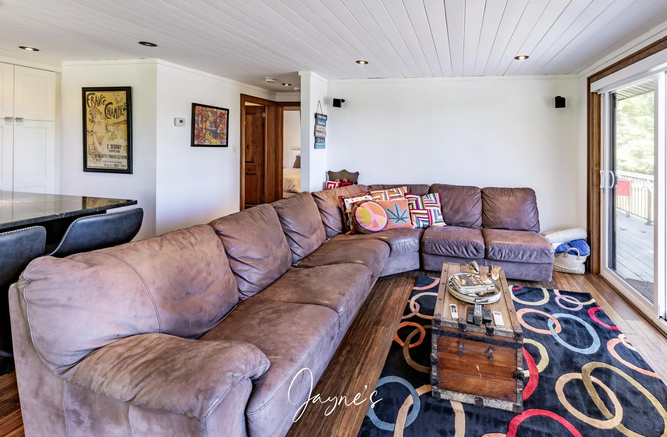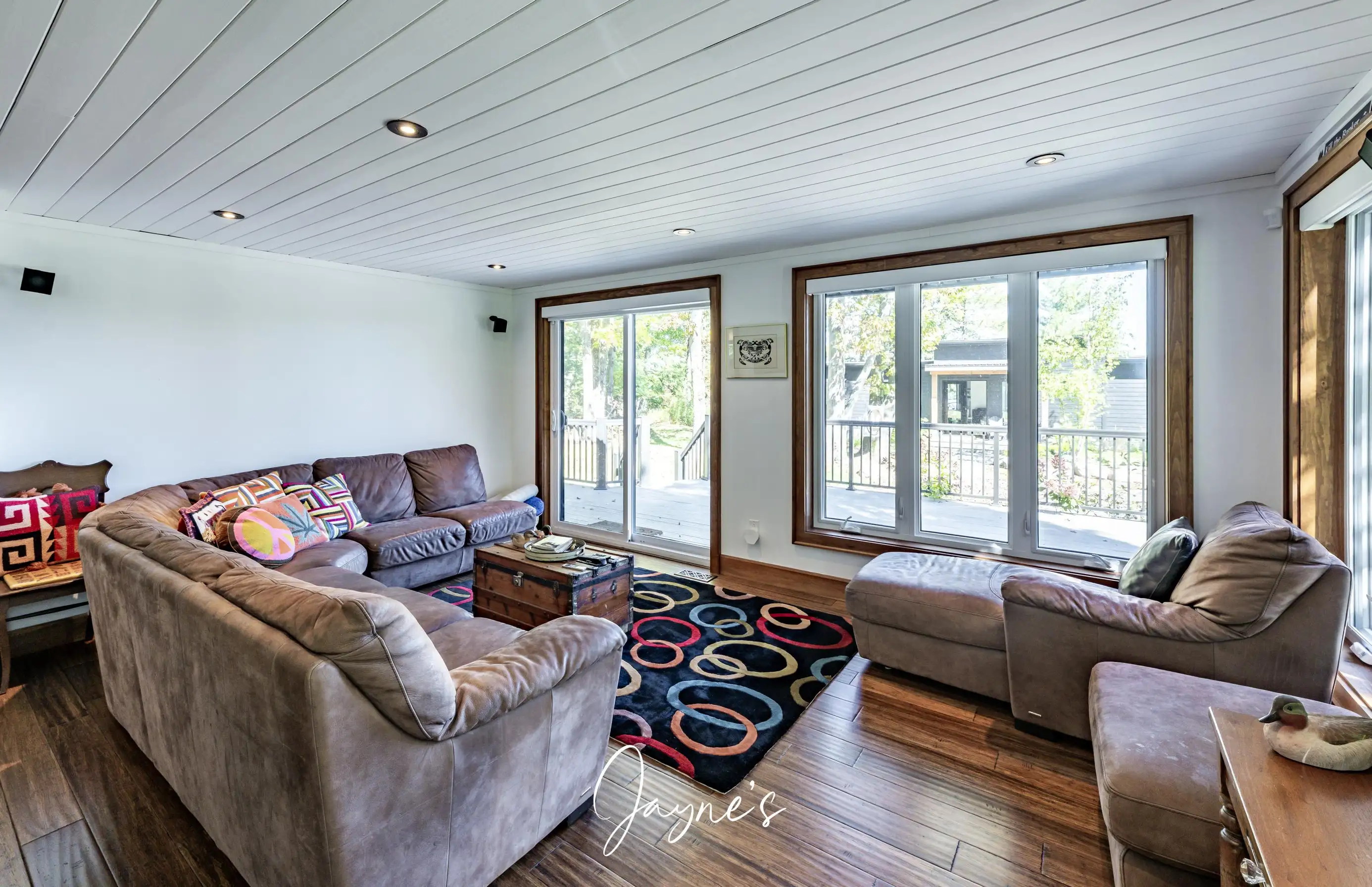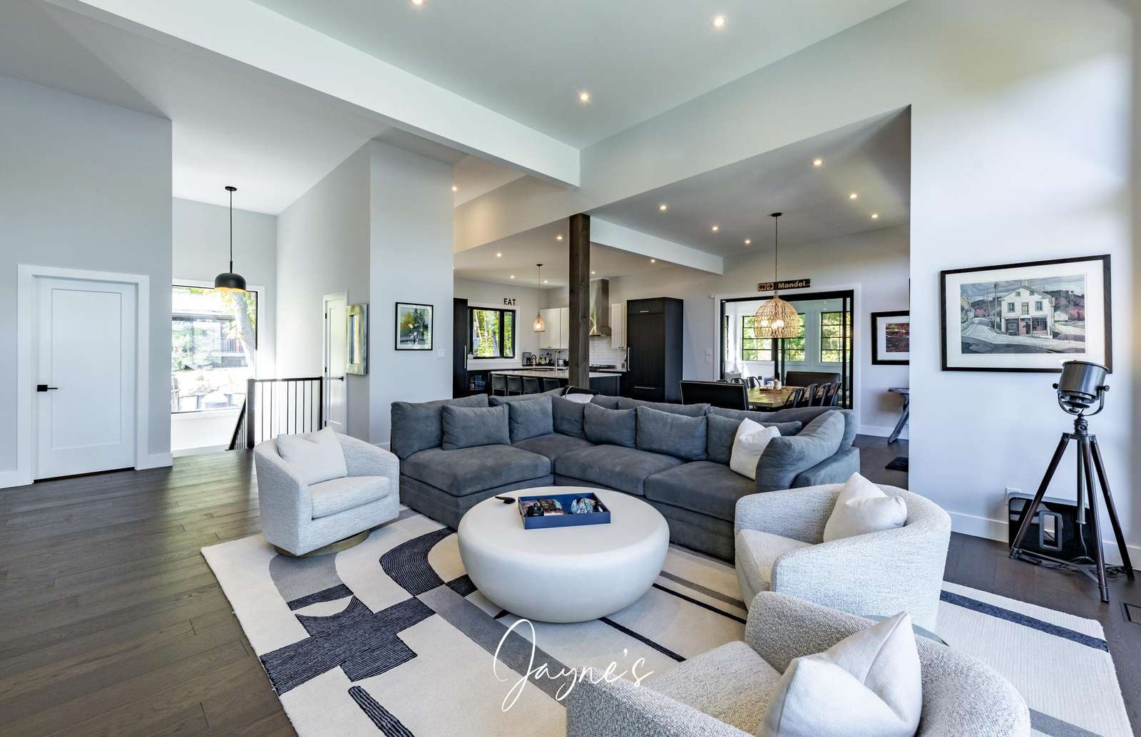 Spacious open concept modern design with floor to ceiling windows, smart TV, gas fireplace, sectional sofa, 3 chairs and walkout to large deck