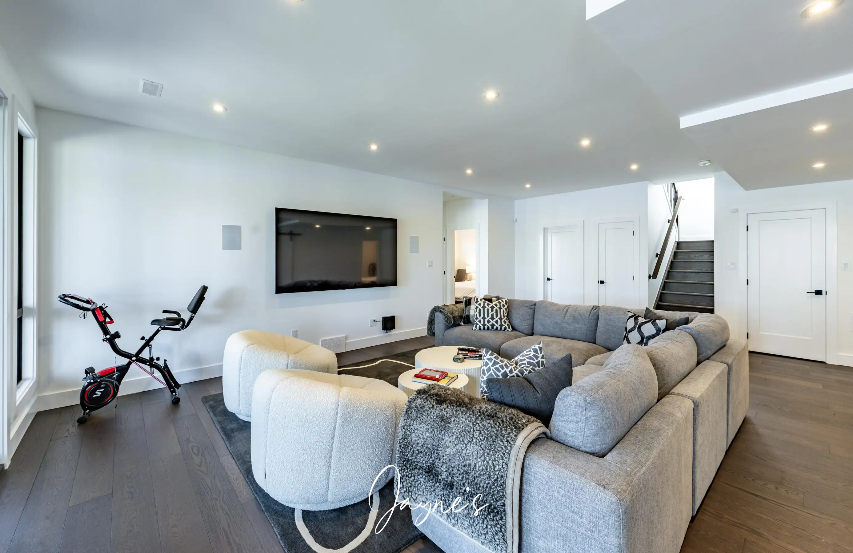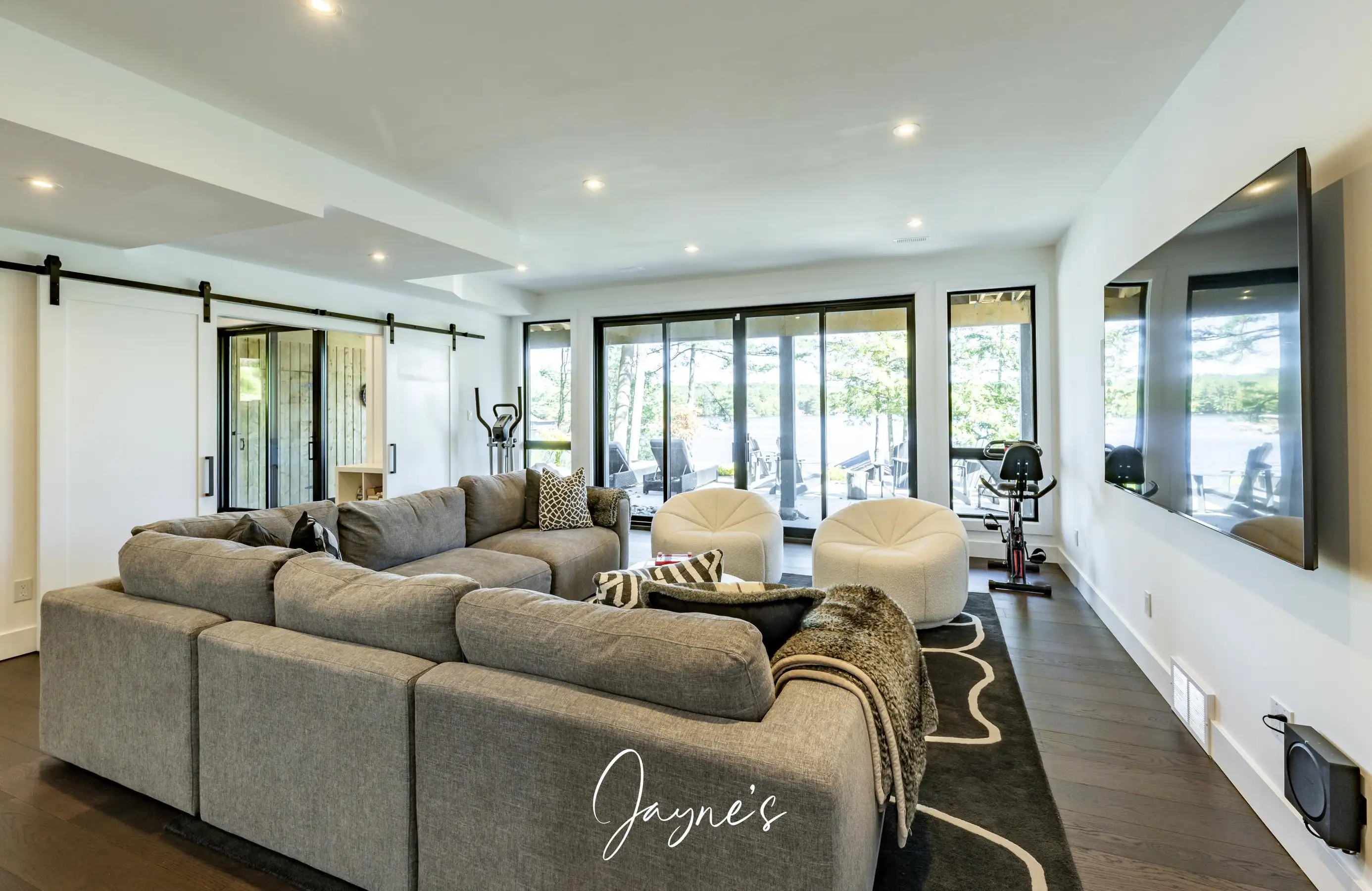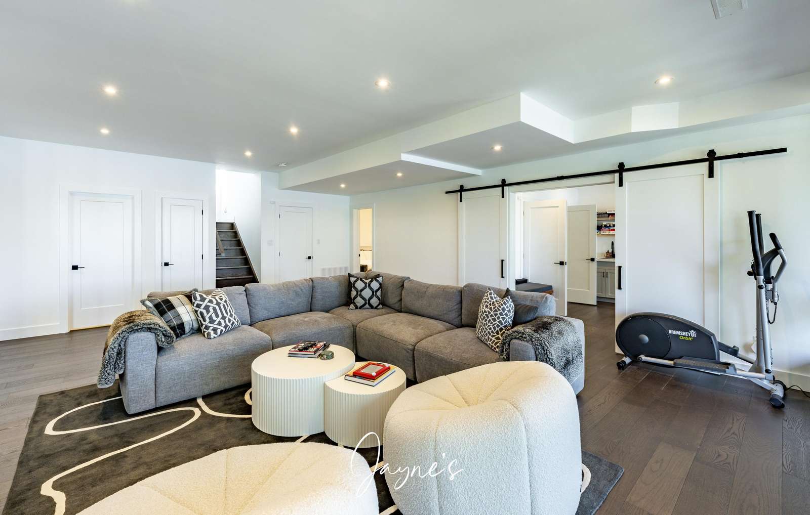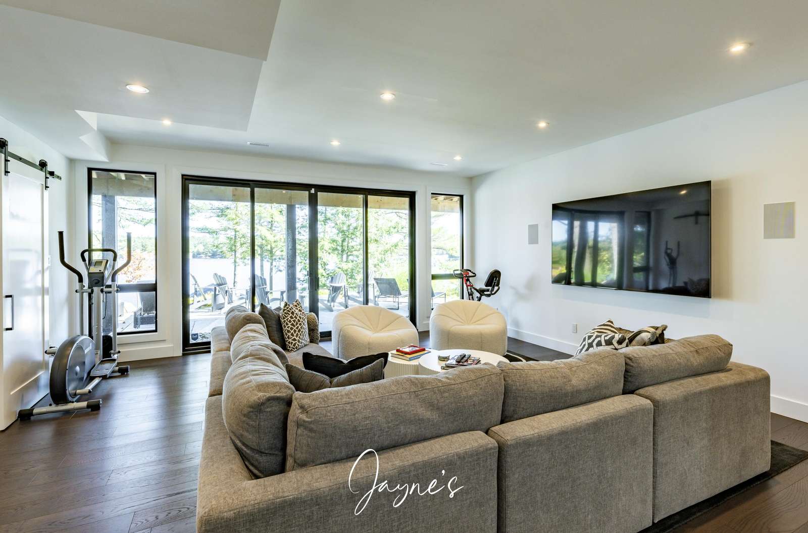 Spacious entertainment area with a large sectional, smart TV, 2 chairs, 2 exercise bikes and walkout to patio