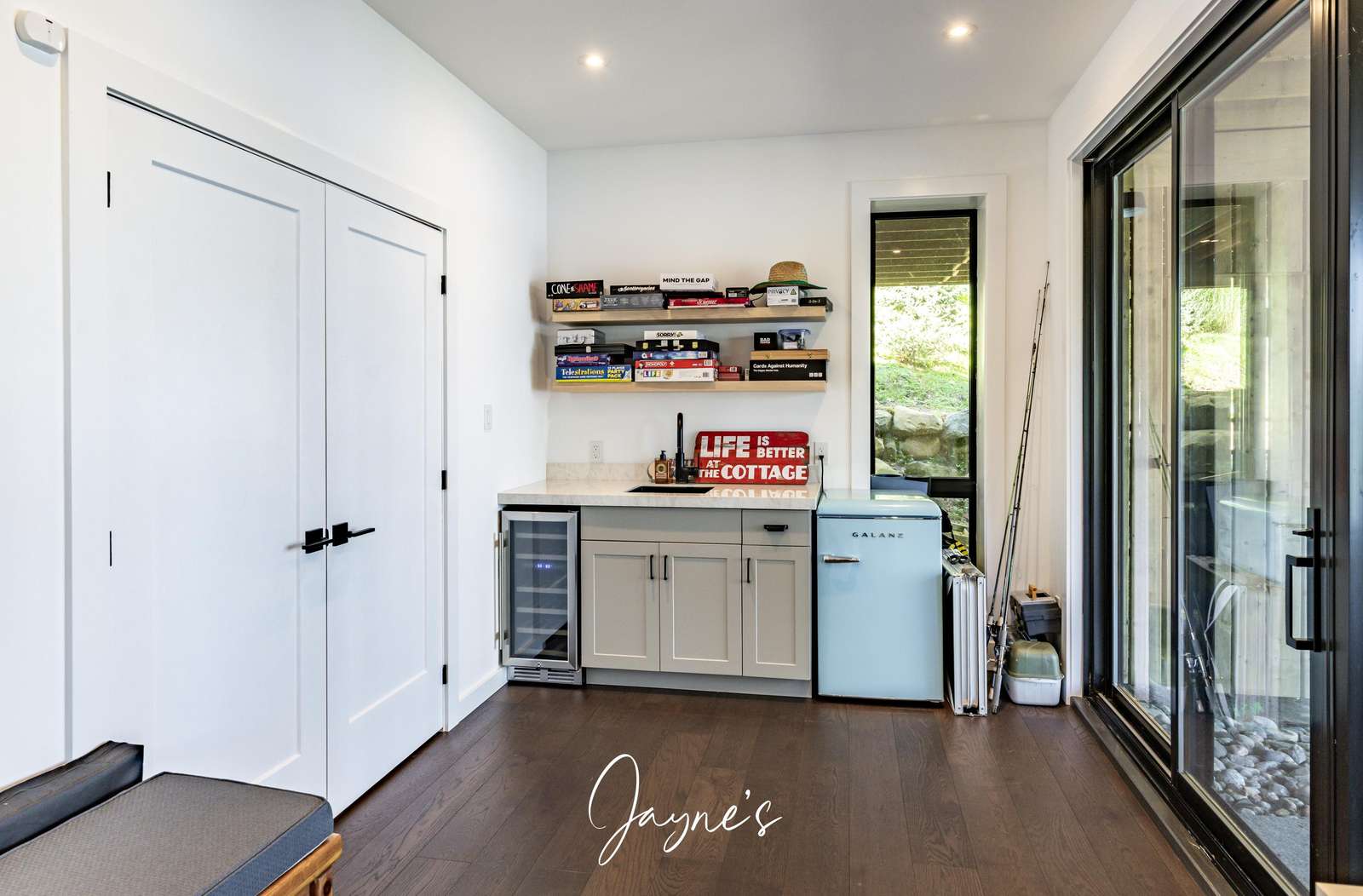 Indoor board game are with wine fridge, bar fridge, walkout and outdoor games like cornhole, connects to a room with 2 double beds