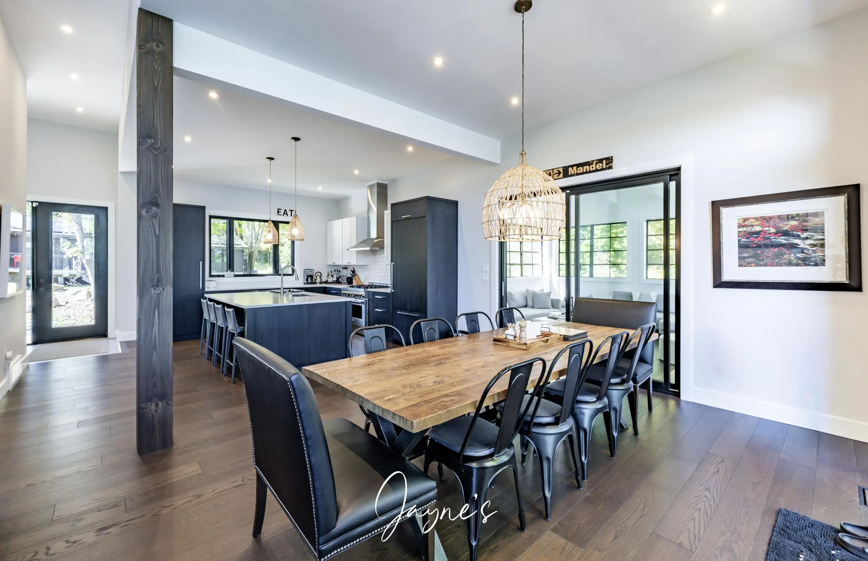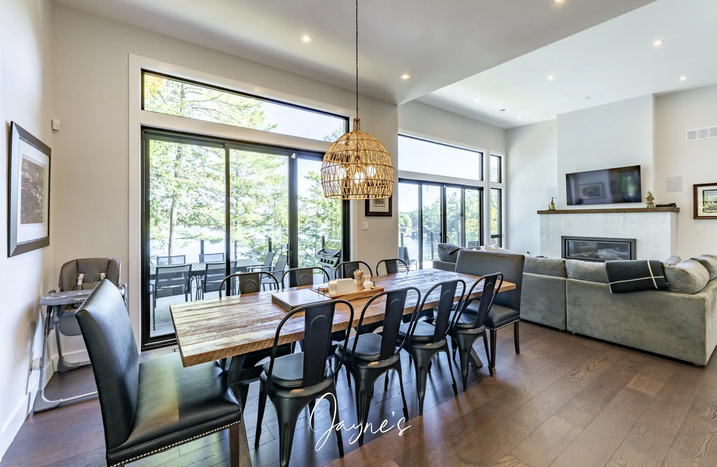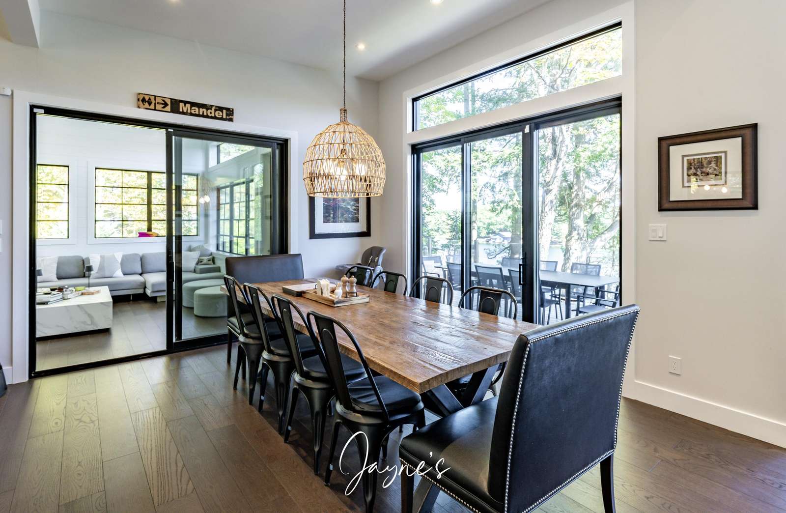 Open concept dining with seating for 12 as the table has 2 unique double seats, plenty of light and walkout to deck or Muskoka room