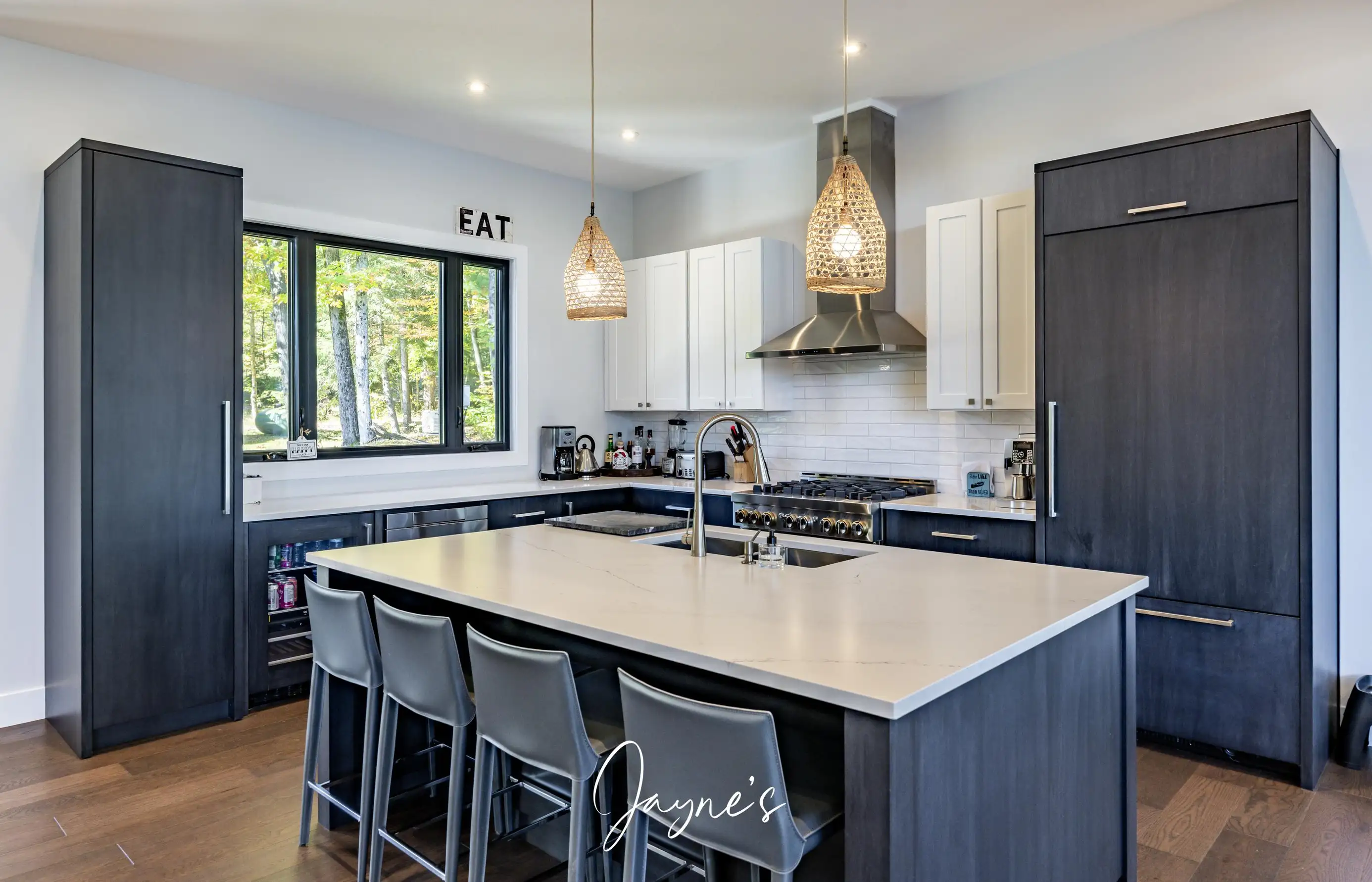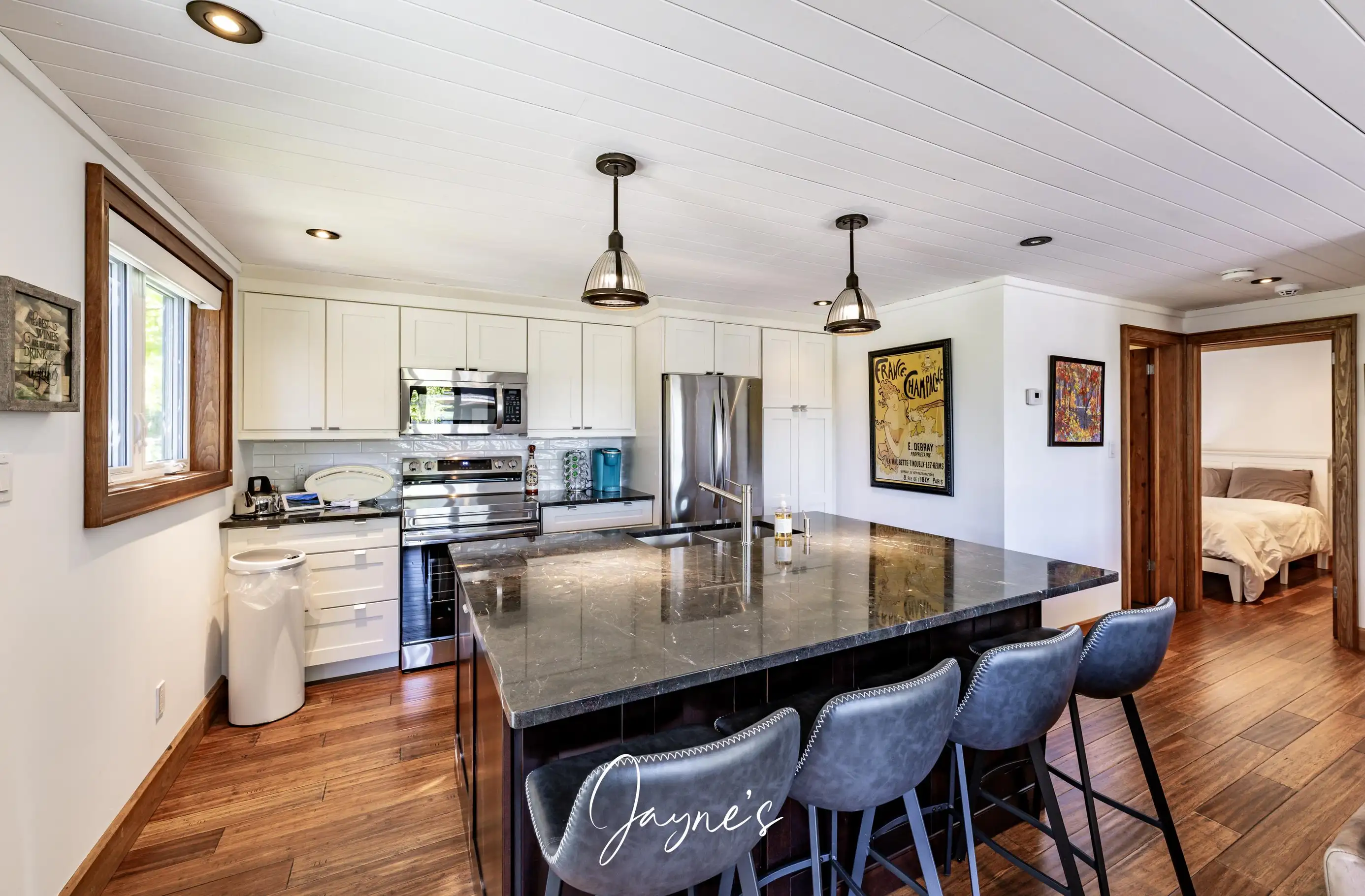 Well equipped with high end appliances, gas stove, wine fridge and island seating for 4