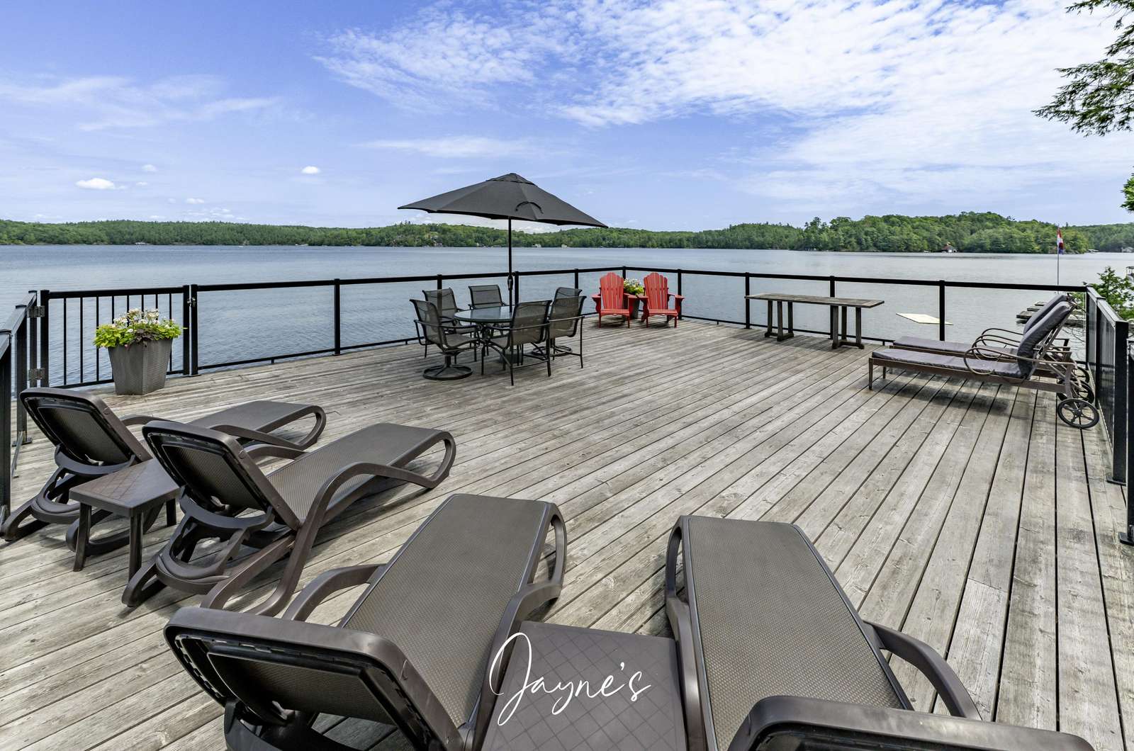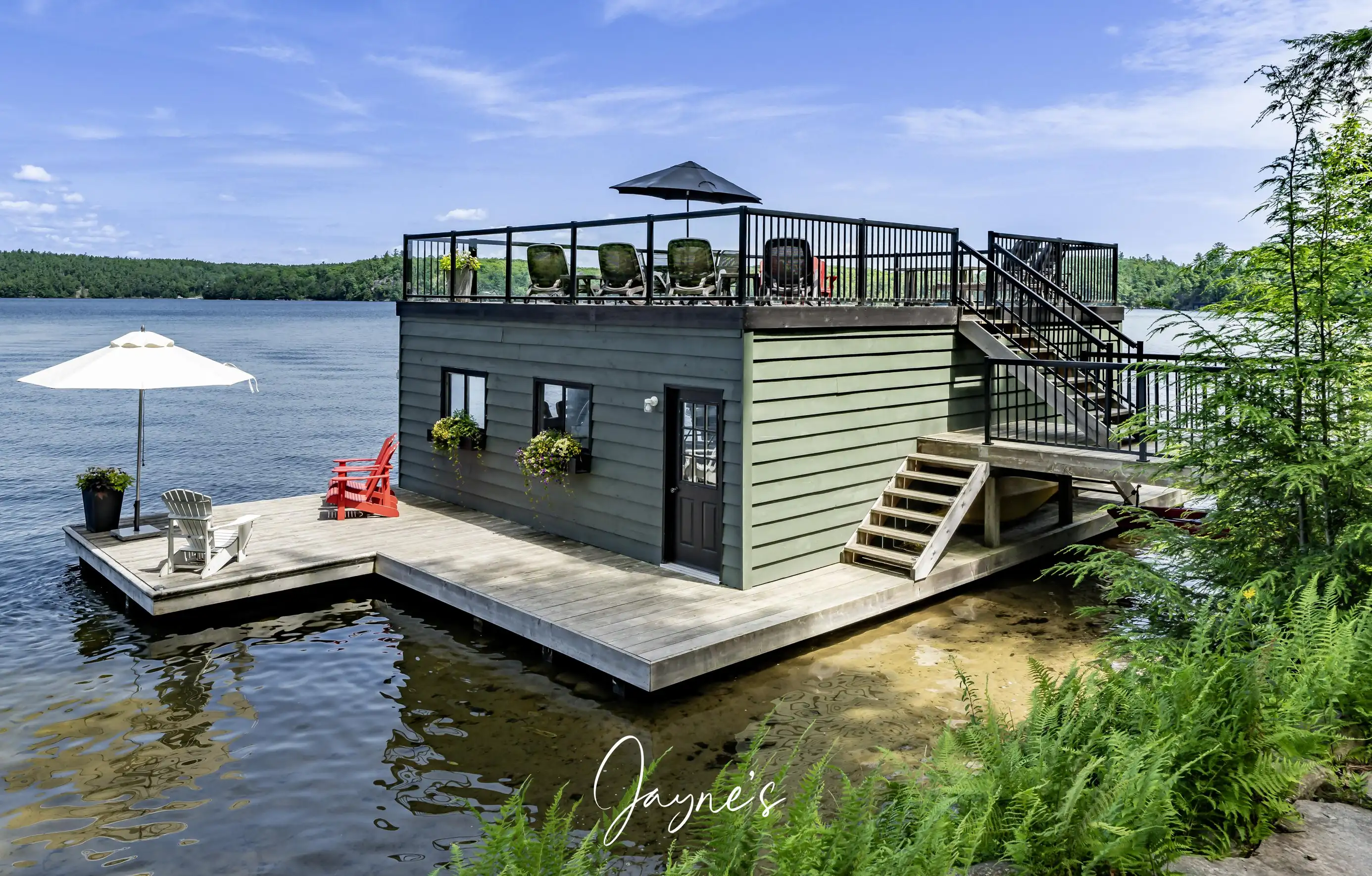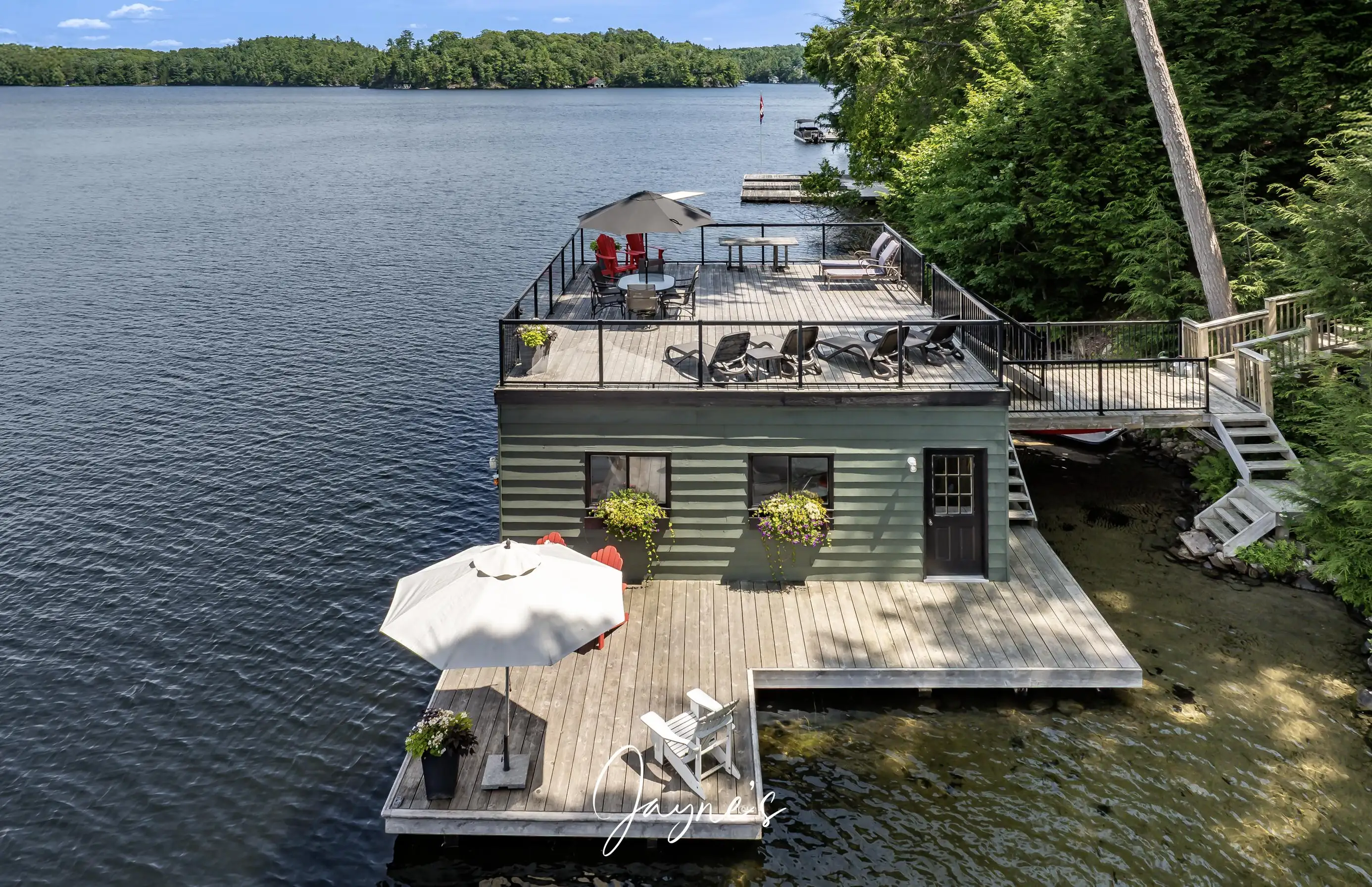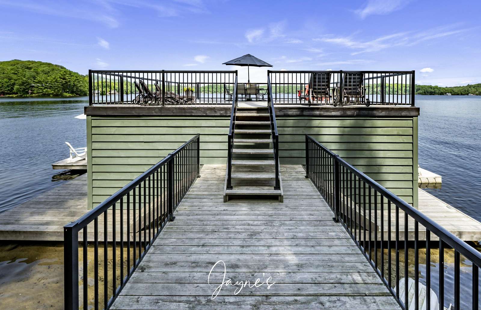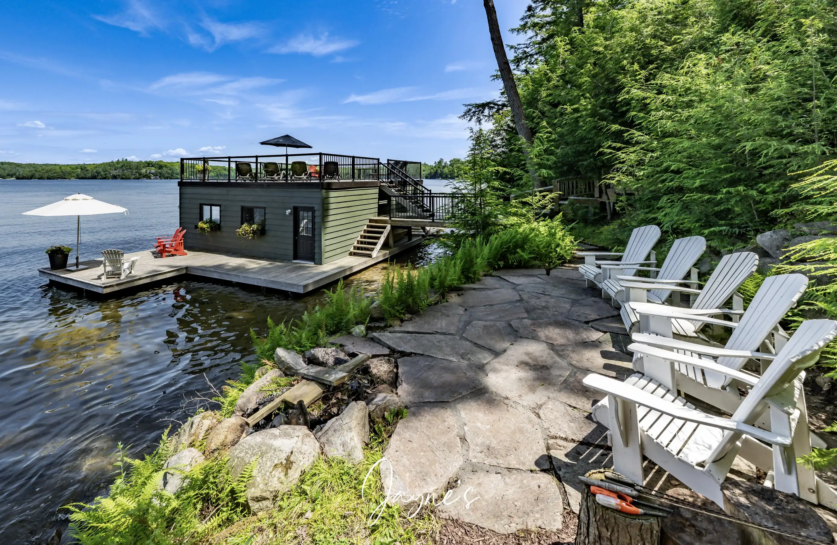 This property has it all! This cottage boasts many natural outdoor sitting areas. The Boathouse deck is the one of the most cherished areas to enjoy on this property. Watch the sunrise or bathe in the sun on one of the eight lounge chairs. When it gets too hot, seek shade under the umbrella table and chairs. Perfect spot to enjoy dinner while watching the setting sun.