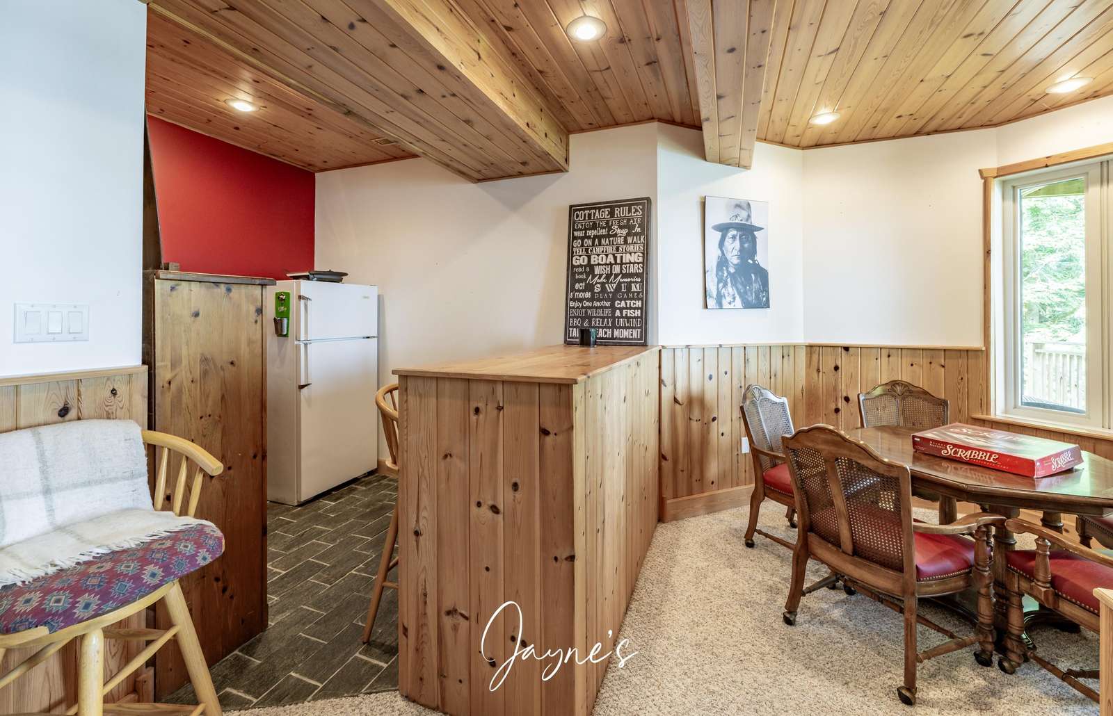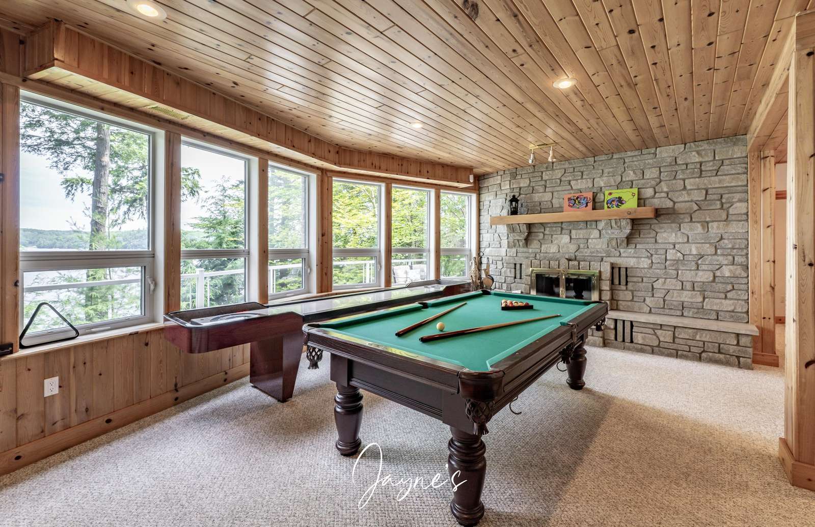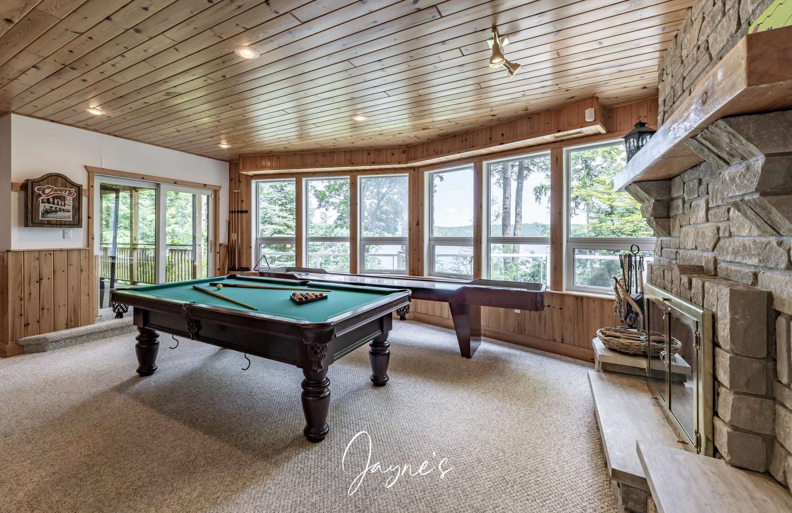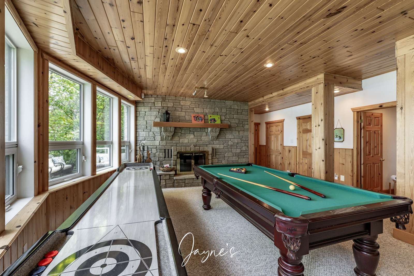 The cottage opens to a wall of windows overlooking the water. Indoor cottage features includes an open concept Great Room/Dining Room and a fun Games Room. Extensive floor to ceiling stone fireplace that extends down to the Games Room and fireplaces. The Muskoka Room is close to the kitchen and is very convenient as it has the dining room behind with table and chairs - and portable heater should the evening be chilly. A Flat Screen TV is in Great Room. There is a large DVD collection, Nintendo, and Wii video games. The Games Room has all the fun when the weather is poor or the sun is long gone! Pool Table, Shuffle Board and a Games Table with popular board games. In addition, the lower level includes a bar fridge, sink, bar stools, and sauna!
