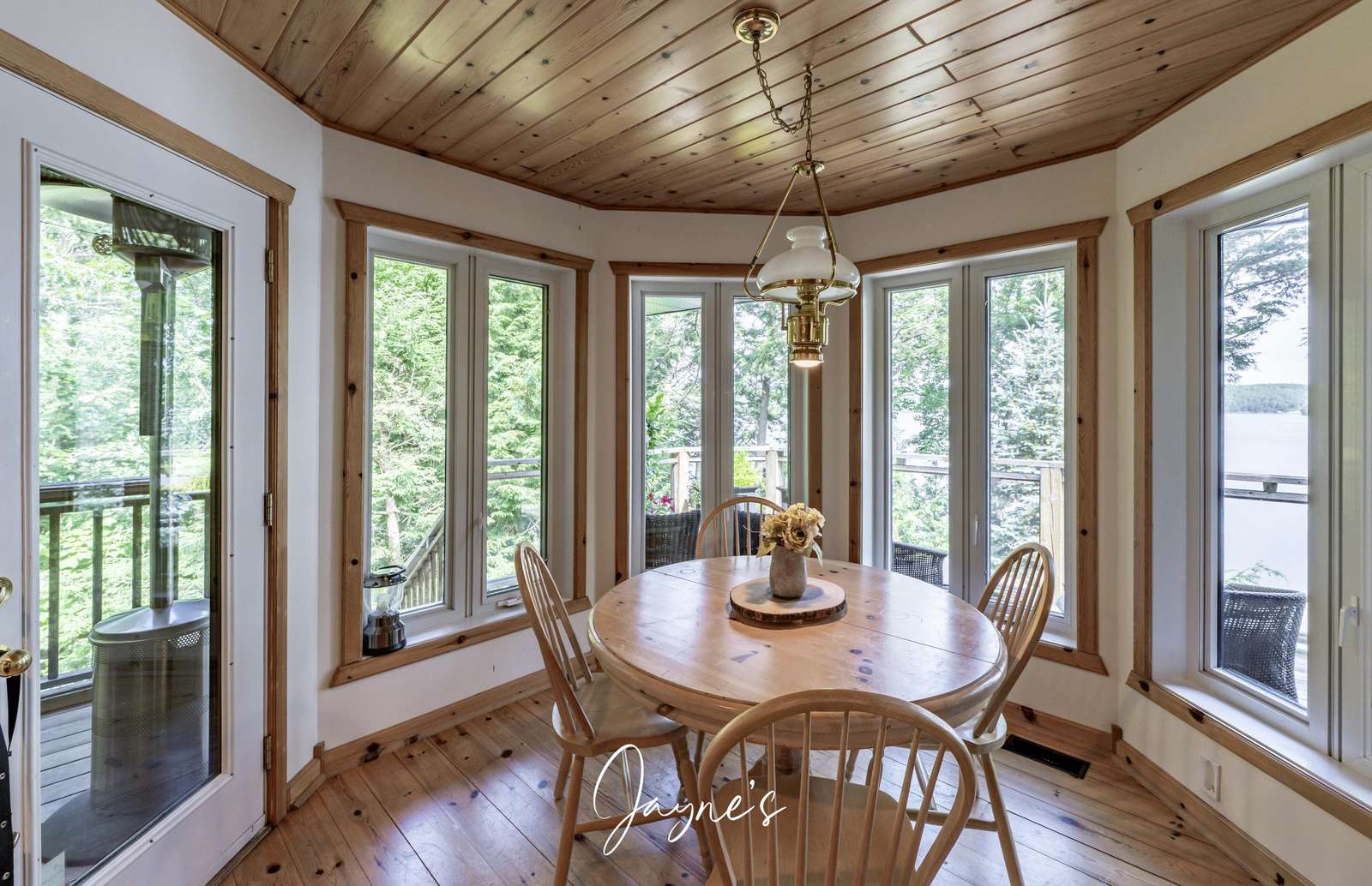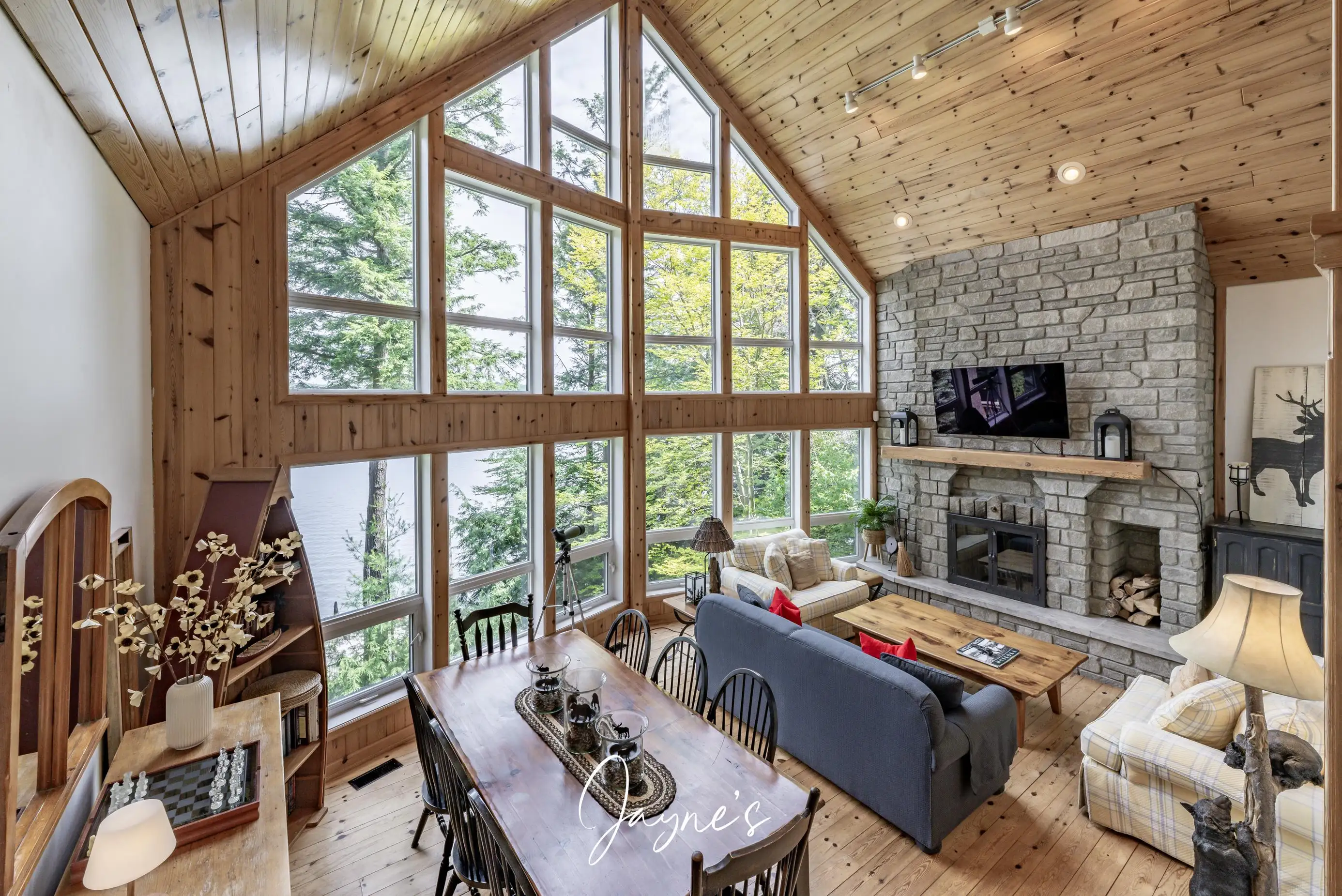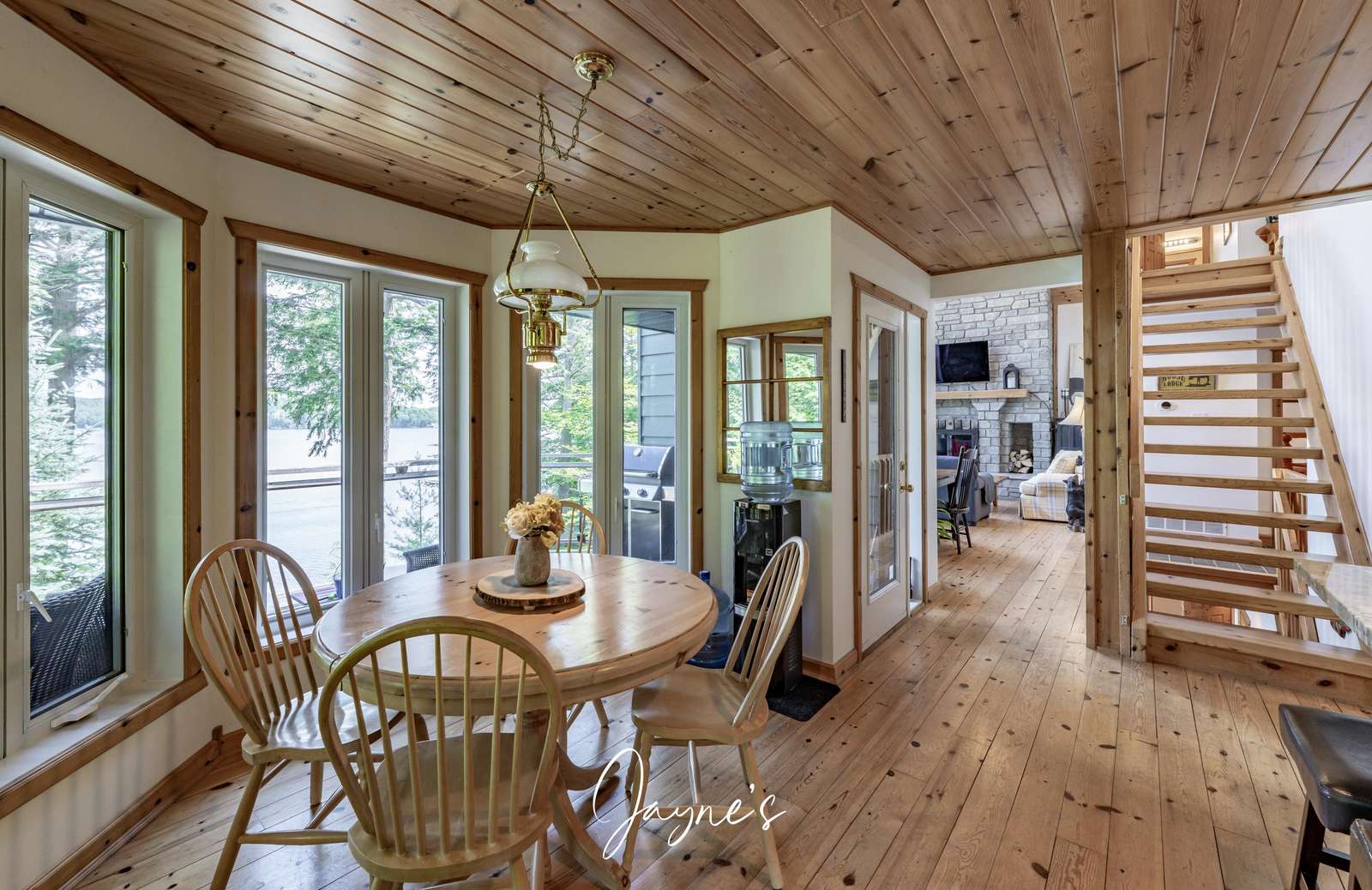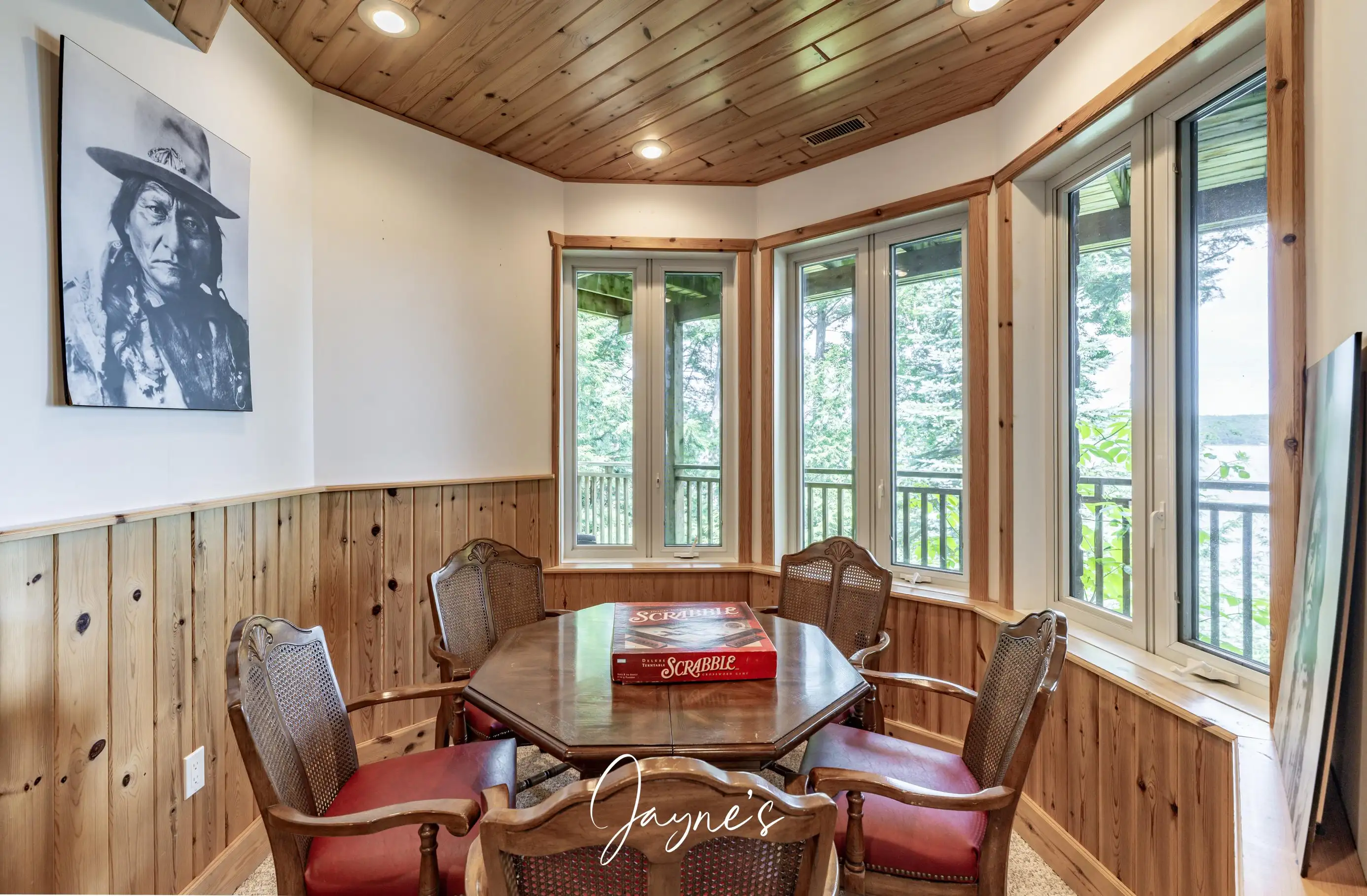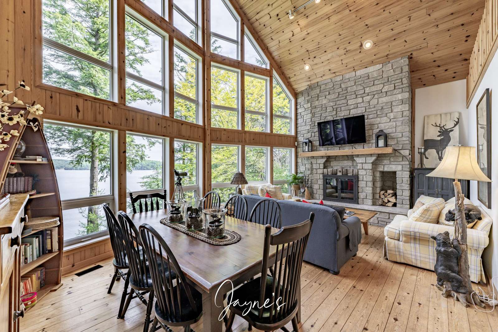 The cottage opens to a wall of windows overlooking the water. Indoor cottage features includes an open concept Great Room/Dining Room and a fun Games Room. Extensive floor to ceiling stone fireplace that extends down to the Games Room and fireplaces. The Muskoka Room is close to the kitchen and is very convenient as it has the dining room behind with table and chairs - and portable heater should the evening be chilly. A Flat Screen TV is in Great Room. There is a large DVD collection, Nintendo, and Wii video games. The Games Room has all the fun when the weather is poor or the sun is long gone! Pool Table, Shuffle Board and a Games Table with popular board games. In addition, the lower level includes a bar fridge, sink, bar stools, and sauna!