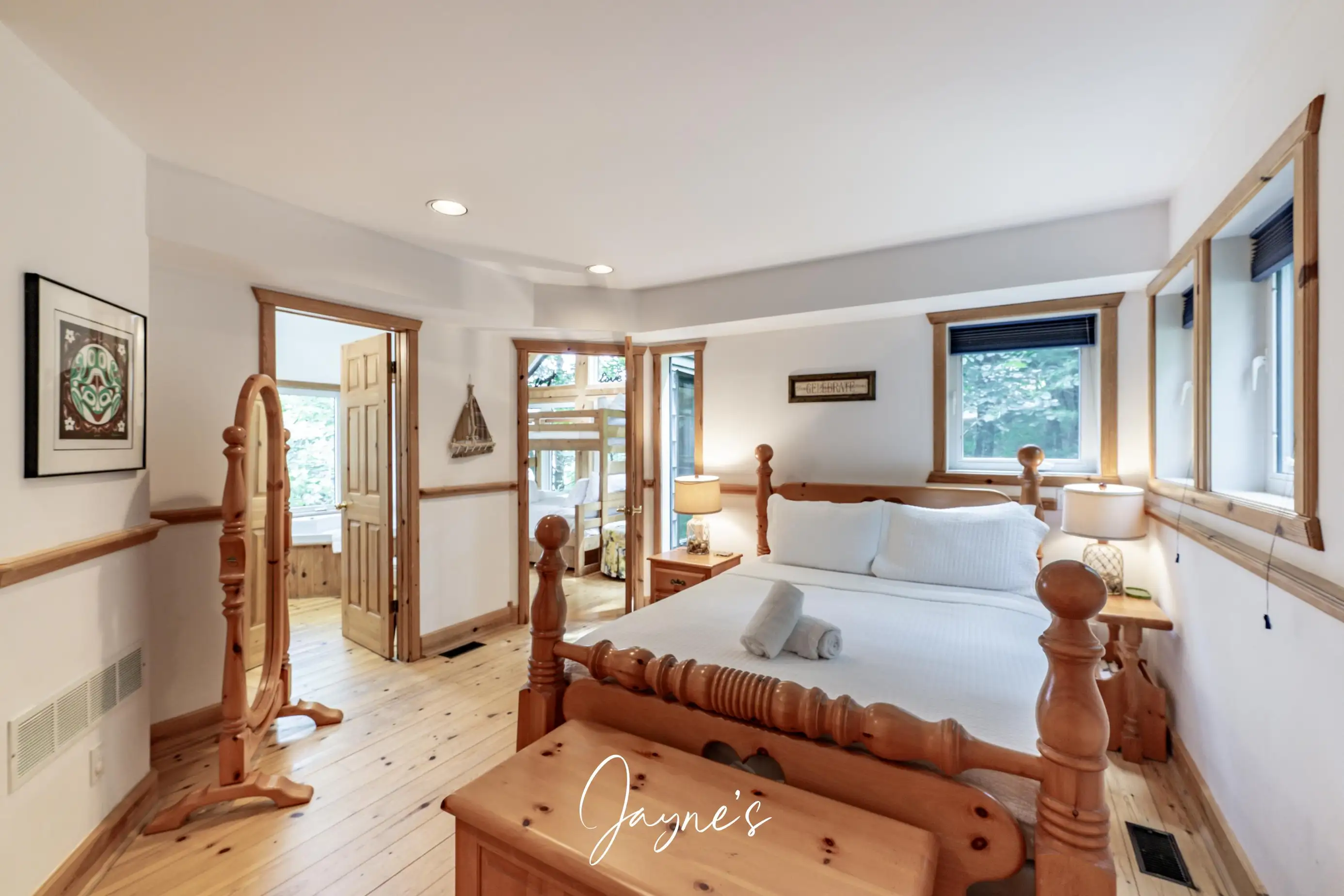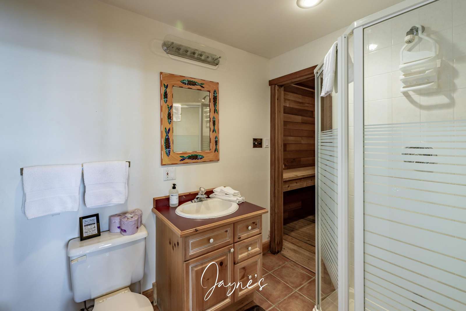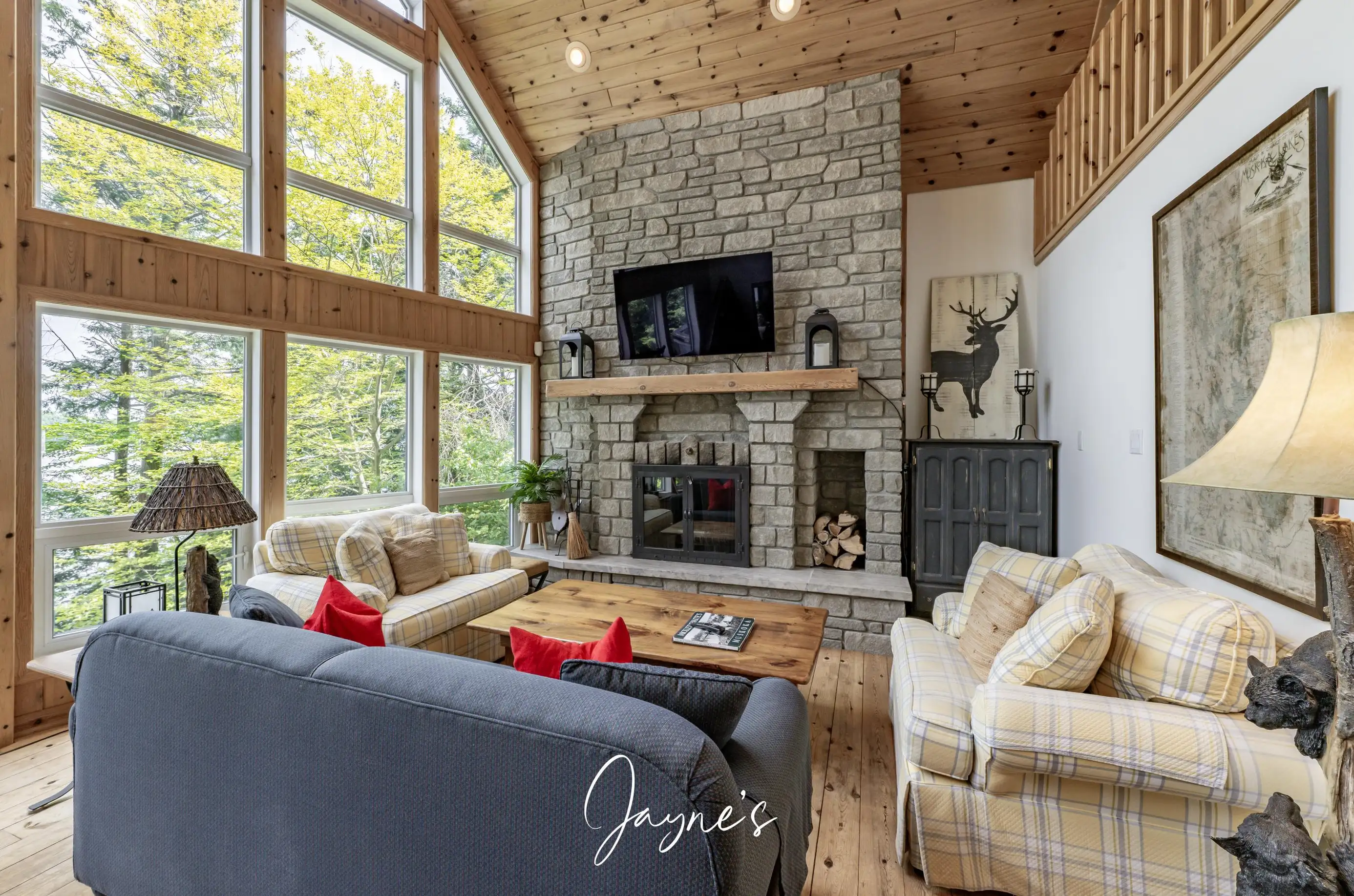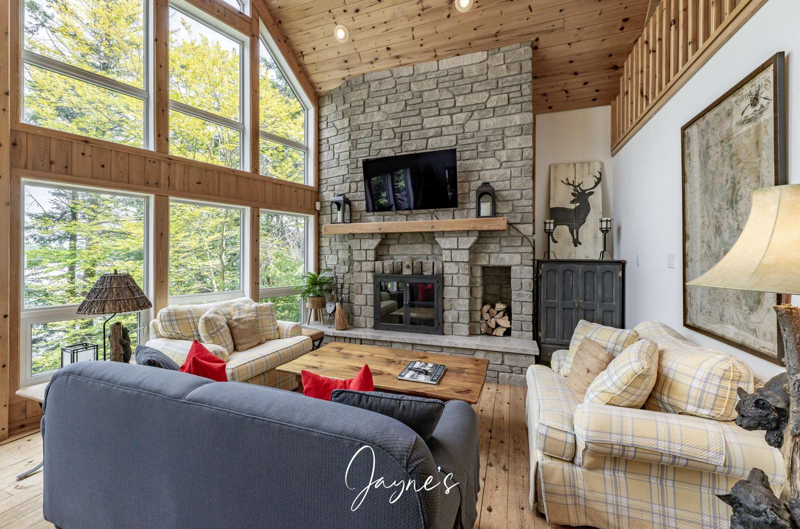 The cottage opens to a wall of windows overlooking the water. Indoor cottage features includes an open concept Great Room/Dining Room and a fun Games Room. Extensive floor to ceiling stone fireplace that extends down to the Games Room and fireplaces. The Muskoka Room is close to the kitchen and is very convenient as it has the dining room behind with table and chairs - and portable heater should the evening be chilly. A Flat Screen TV is in Great Room. There is a large DVD collection, Nintendo, and Wii video games. The Games Room has all the fun when the weather is poor or the sun is long gone! Pool Table, Shuffle Board and a Games Table with popular board games. In addition, the lower level includes a bar fridge, sink, bar stools, and sauna!