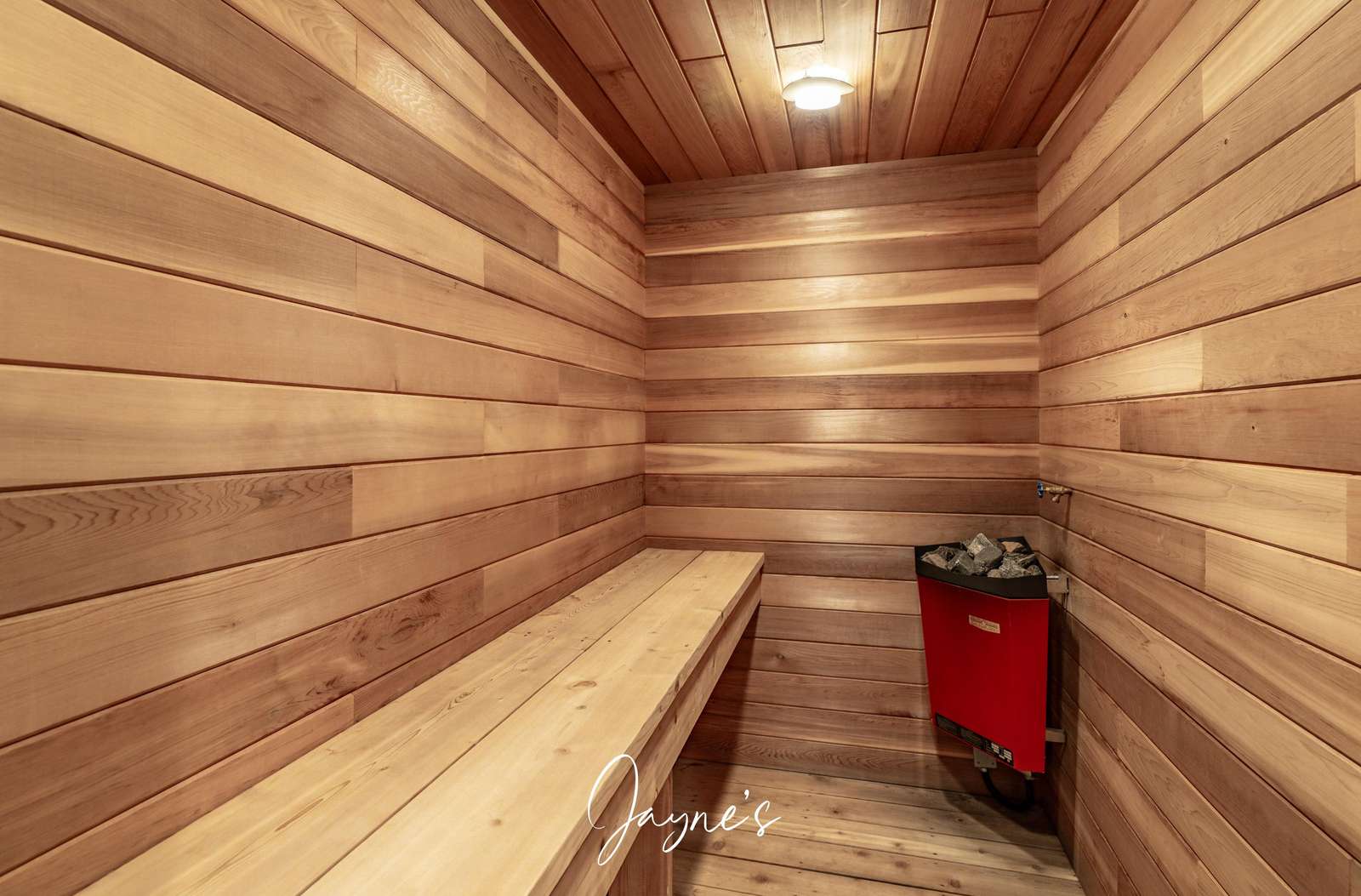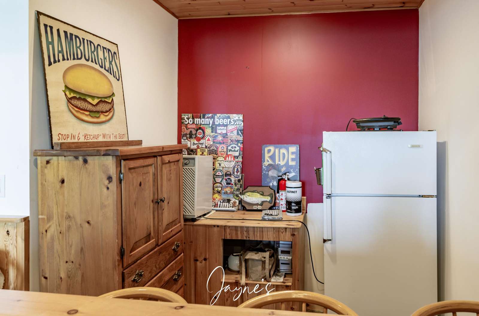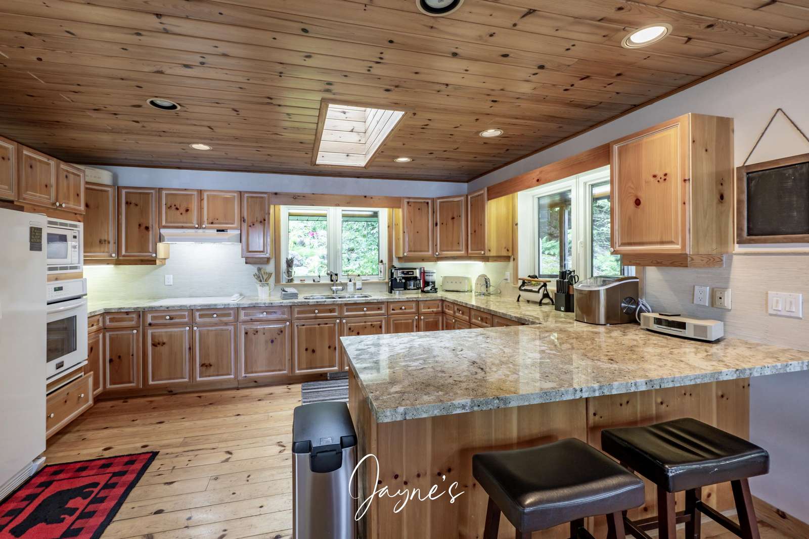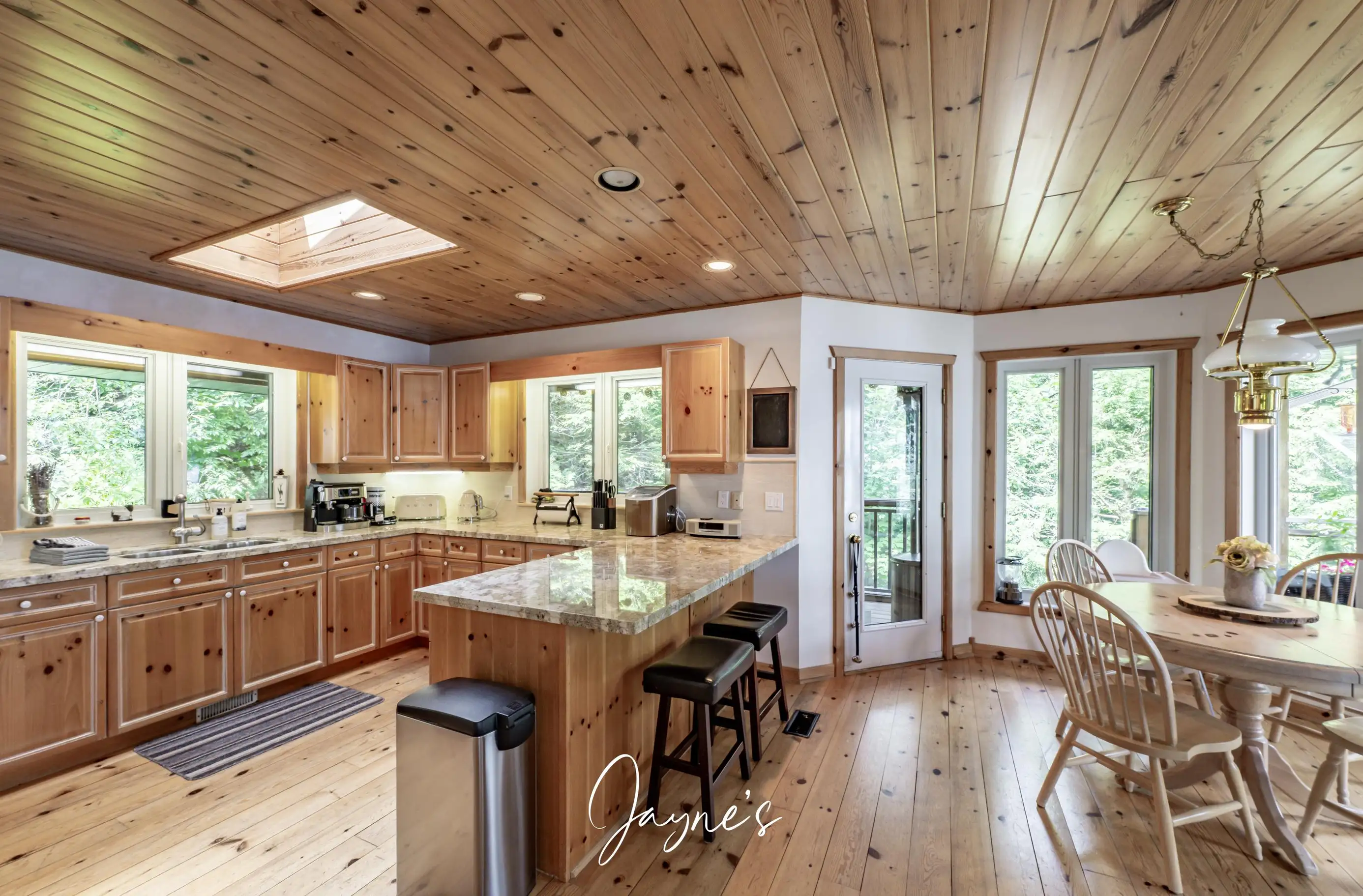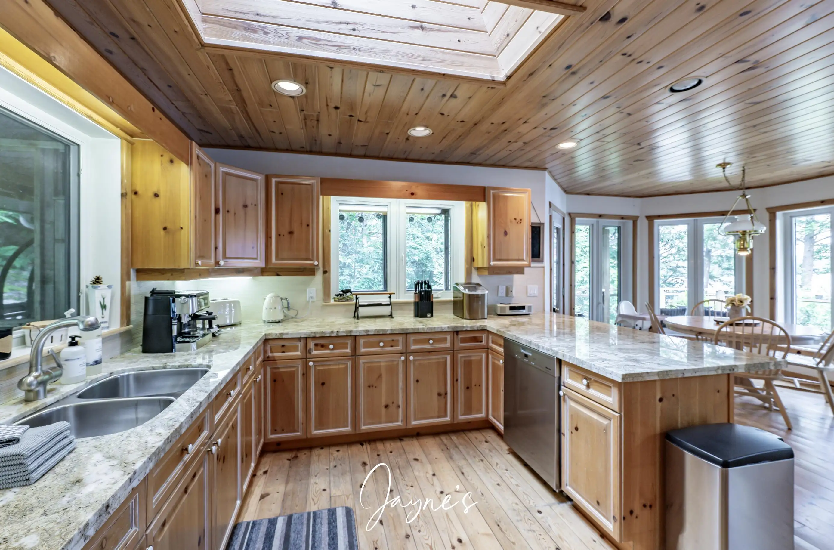 The cottage opens to a wall of windows overlooking the water. Indoor cottage features includes an open concept Great Room/Dining Room and a fun Games Room. Extensive floor to ceiling stone fireplace that extends down to the Games Room and fireplaces. The Muskoka Room is close to the kitchen and is very convenient as it has the dining room behind with table and chairs - and portable heater should the evening be chilly. A Flat Screen TV is in Great Room. There is a large DVD collection, Nintendo, and Wii video games. The Games Room has all the fun when the weather is poor or the sun is long gone! Pool Table, Shuffle Board and a Games Table with popular board games. In addition, the lower level includes a bar fridge, sink, bar stools, and sauna!