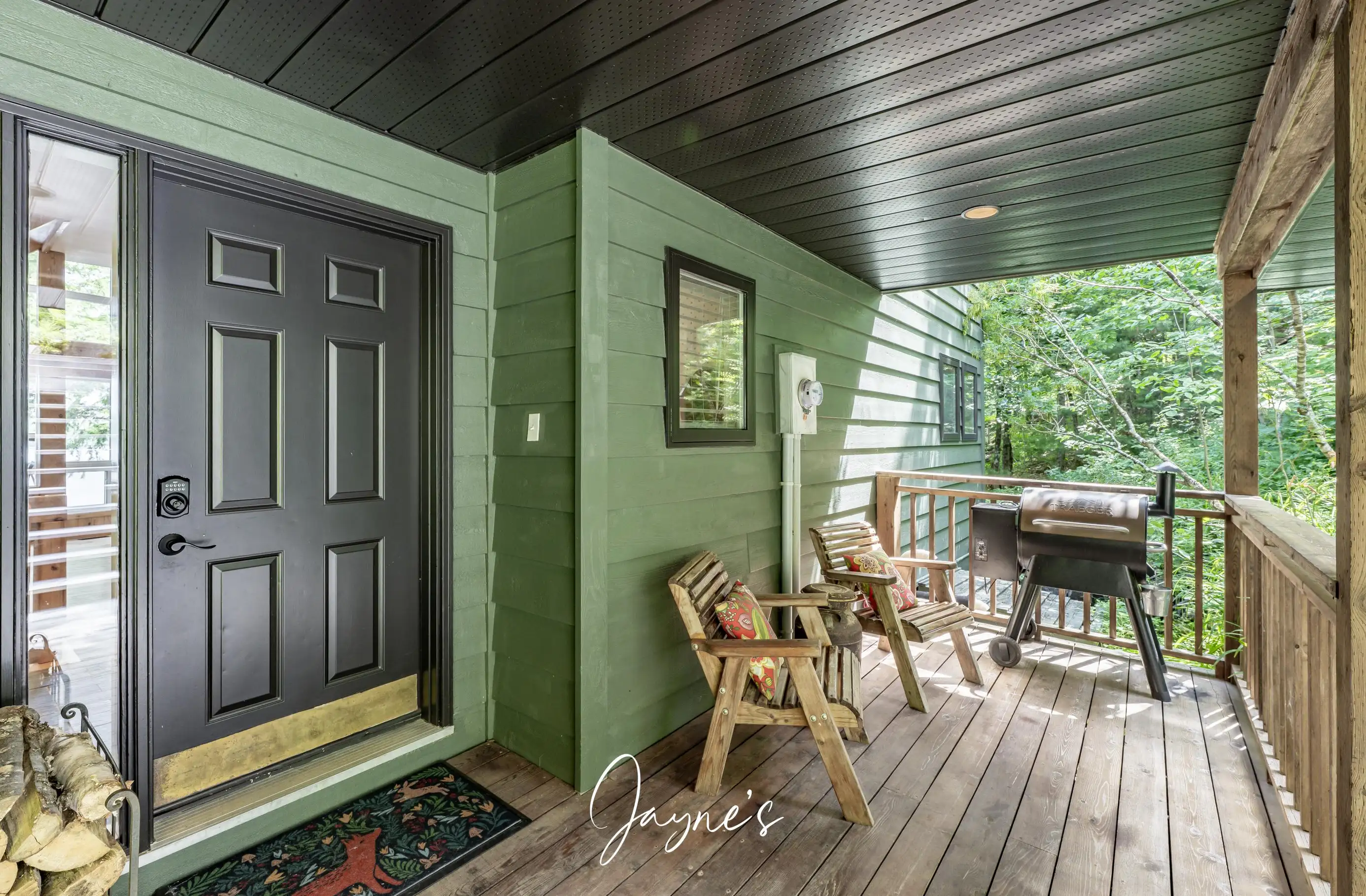 The deck outside of the Games Room has a hammock chair, 2 rocking chairs and a second fire pit.
