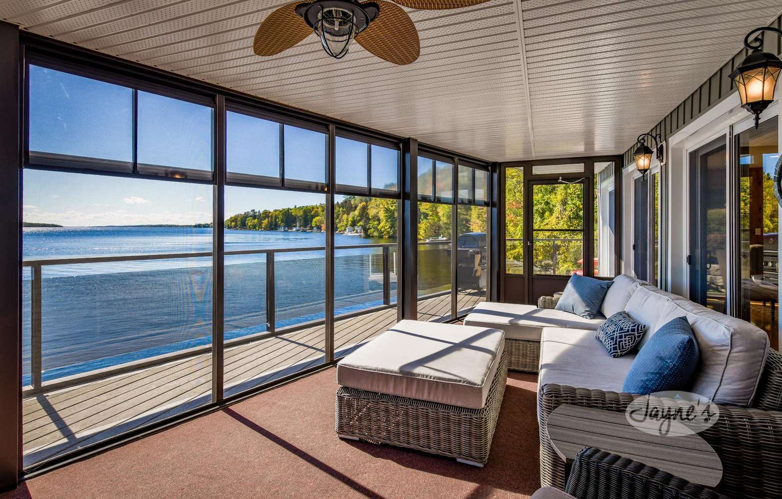 Fully screened-in sun room offers a bug-free alternative to enjoy your meal with the panoramic view - from either the dining table or beautiful outdoor sofa.