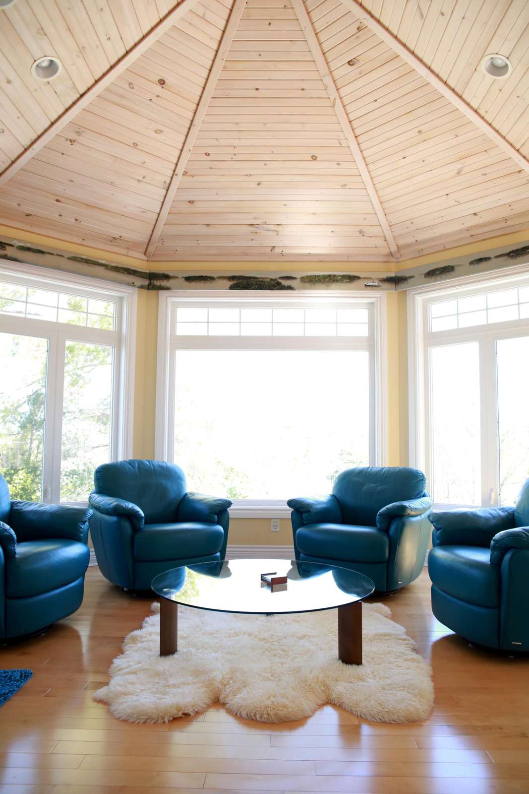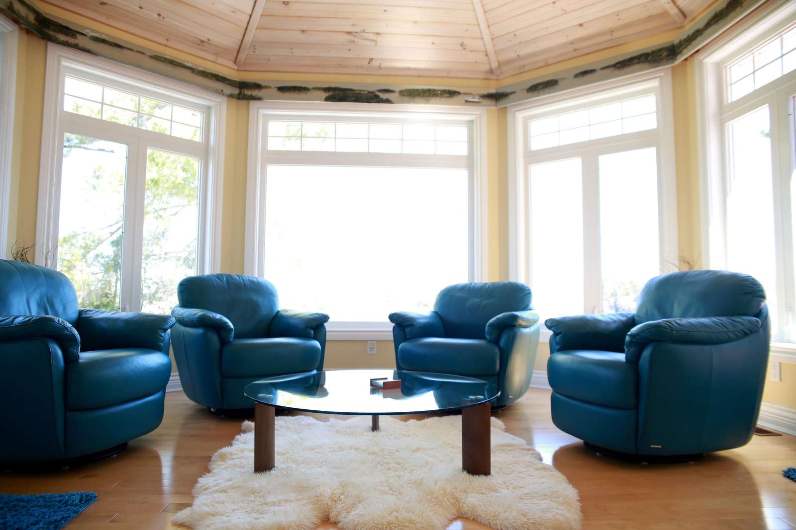 Octagonal Muskoka Room offers comfortable seating with four leather swivel chairs and massive windows offering a view of the lake.