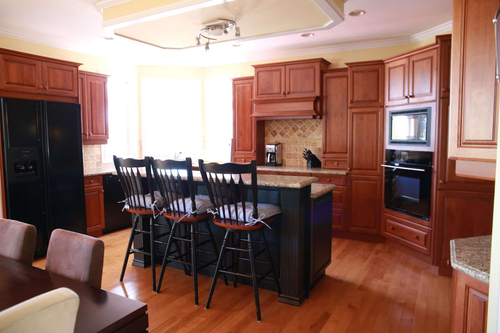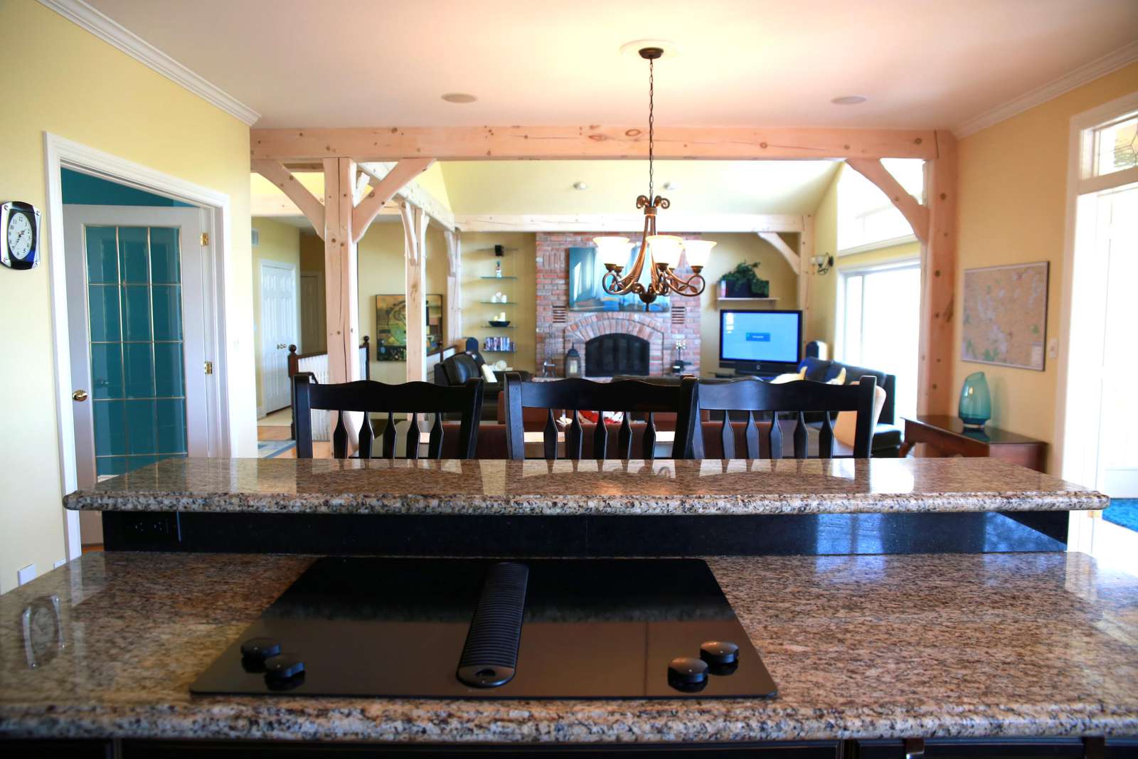 Beautiful open concept kitchen with granite counters, stainless appliances, and a kitchen island (with cooktop) with seating for three.