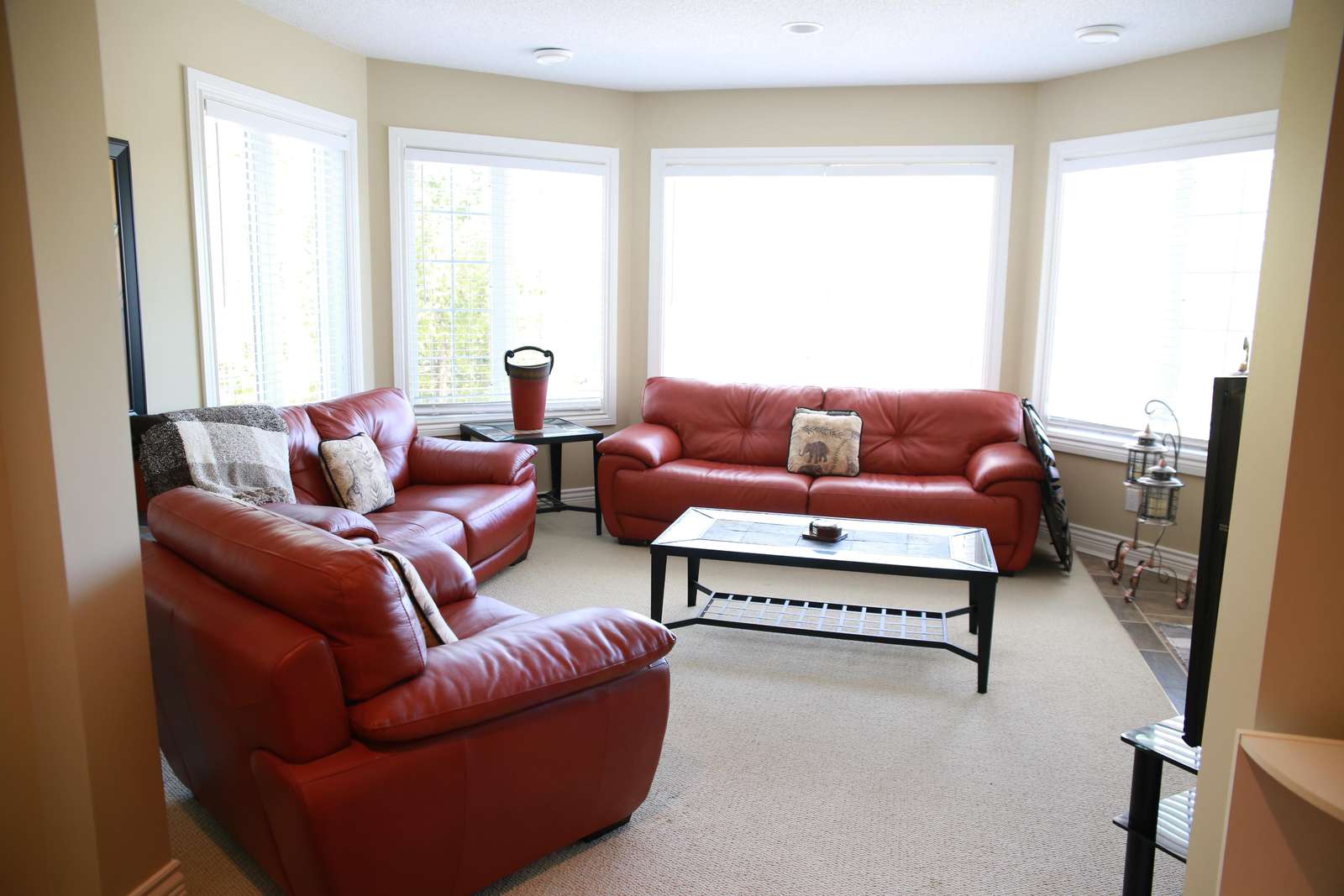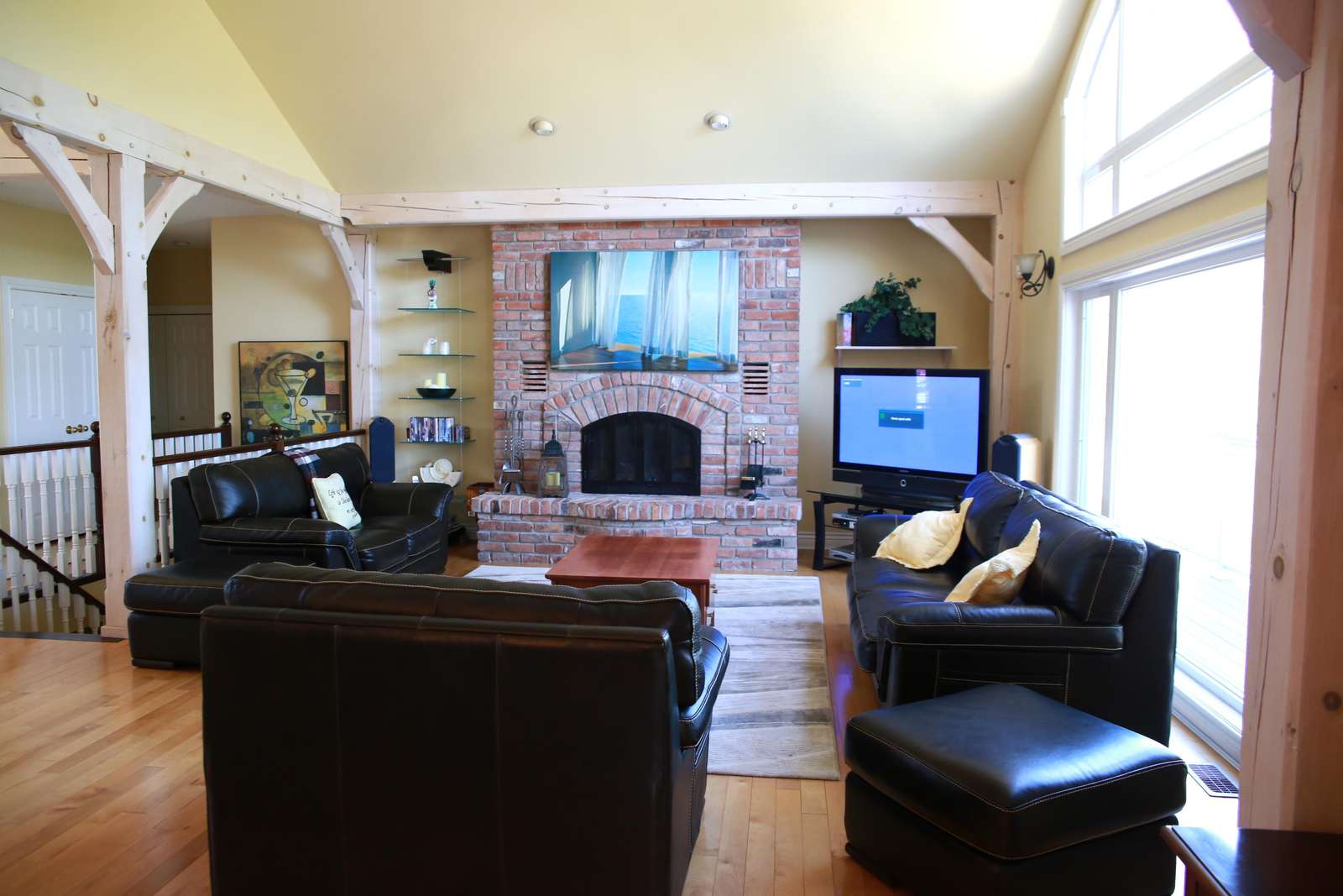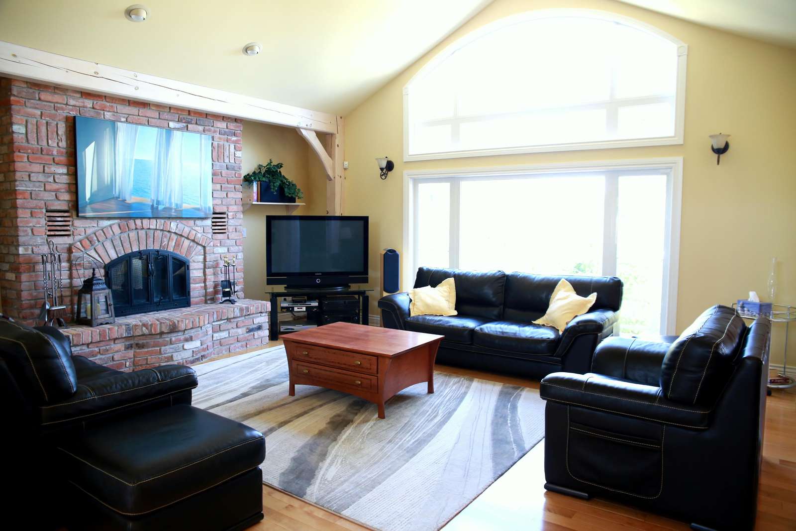 The open-concept main floor features leather furniture, mounted television, a beautiful stone fireplace, and large windows, creating a cheerful atmosphere.